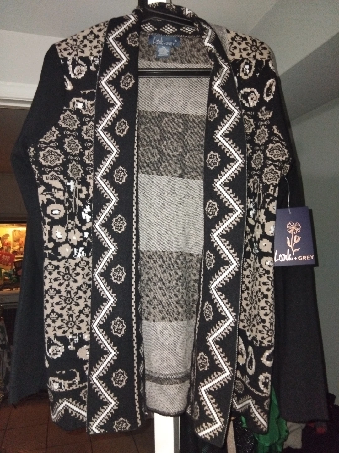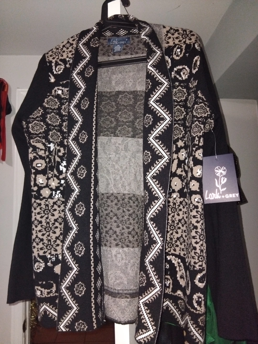 Selling a cardigan from Lark + Grey. It features a unique pattern and design, perfect for adding a touch of style to any outfit. It's brand new and ready for a new home!