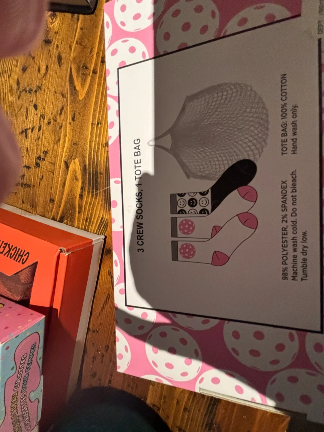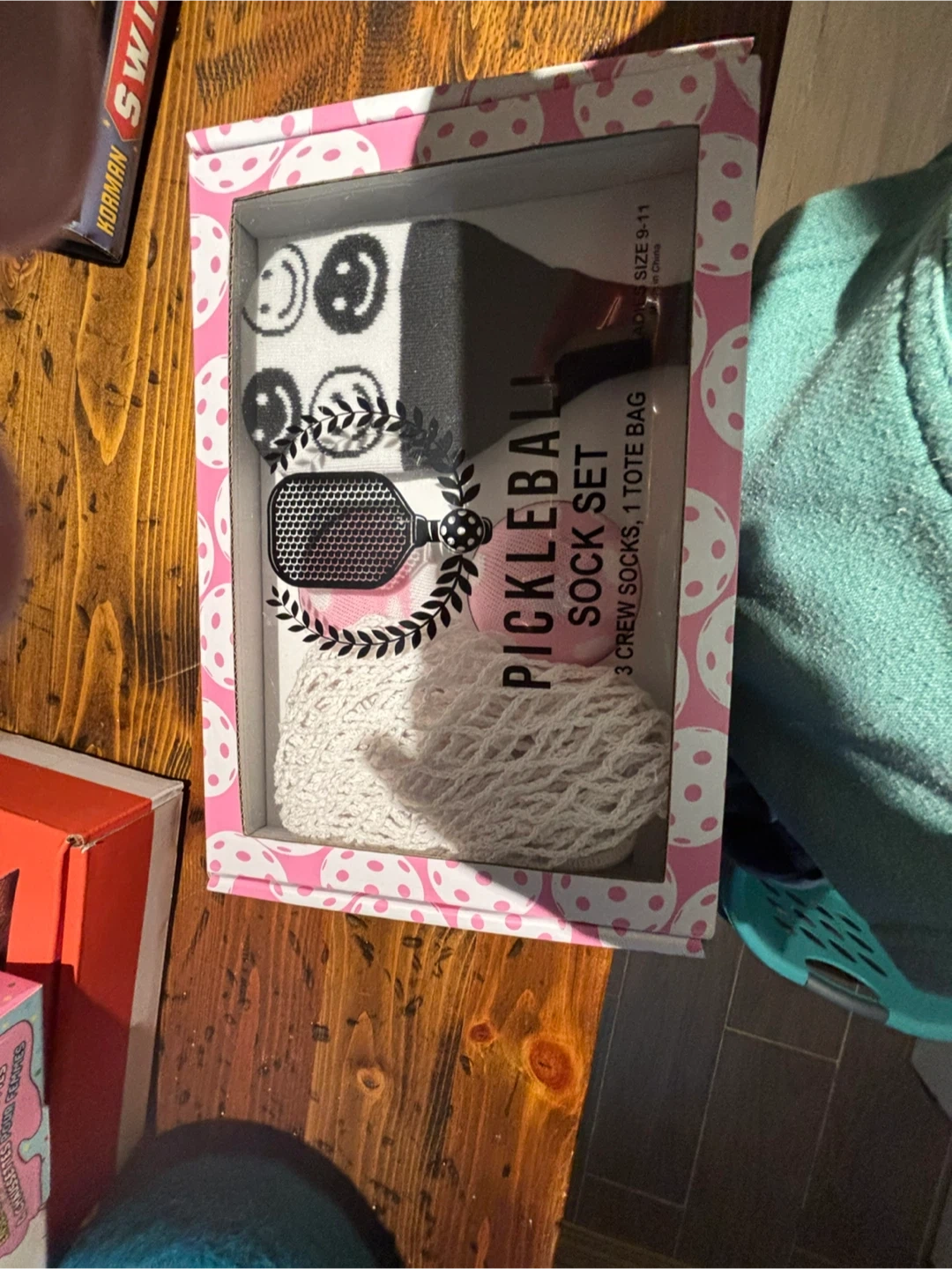 Selling a new Pickleball sock set! It includes 3 crew socks and a tote bag. The sock size is 9-11. The tote bag is made of 100% cotton. The socks are 98% polyester and 2% spandex. The box is included