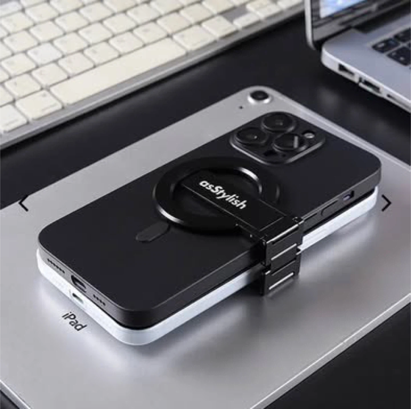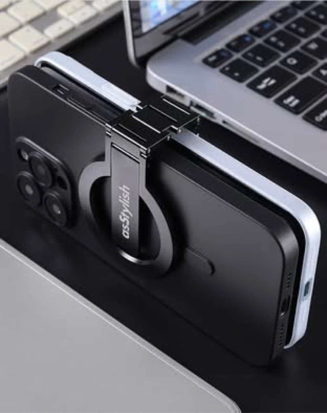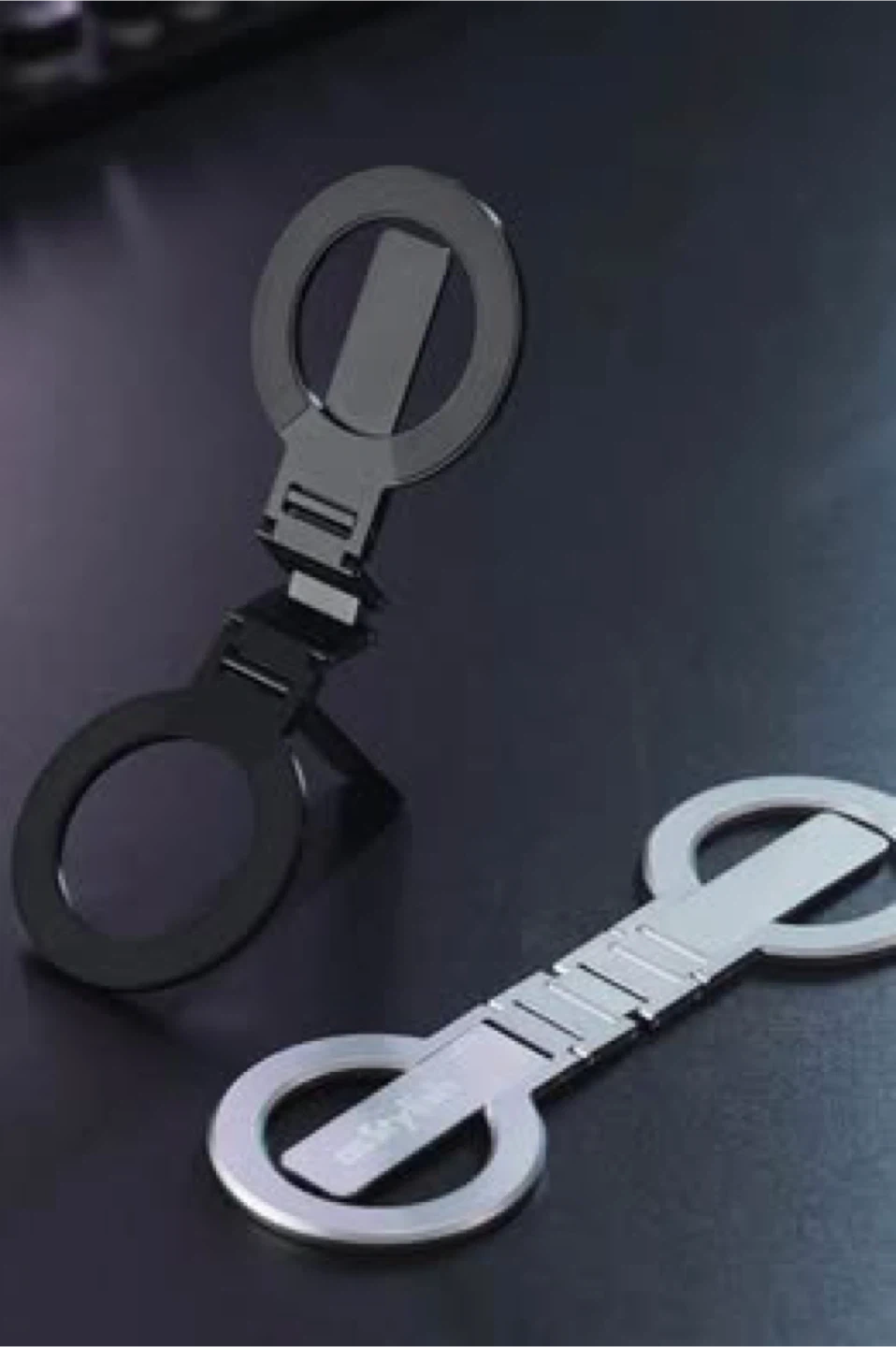 Selling an asStylish phone holder stand, available in both black and silver. It appears to be in great condition and ready to use! Perfect for propping up your phone on a desk or table.