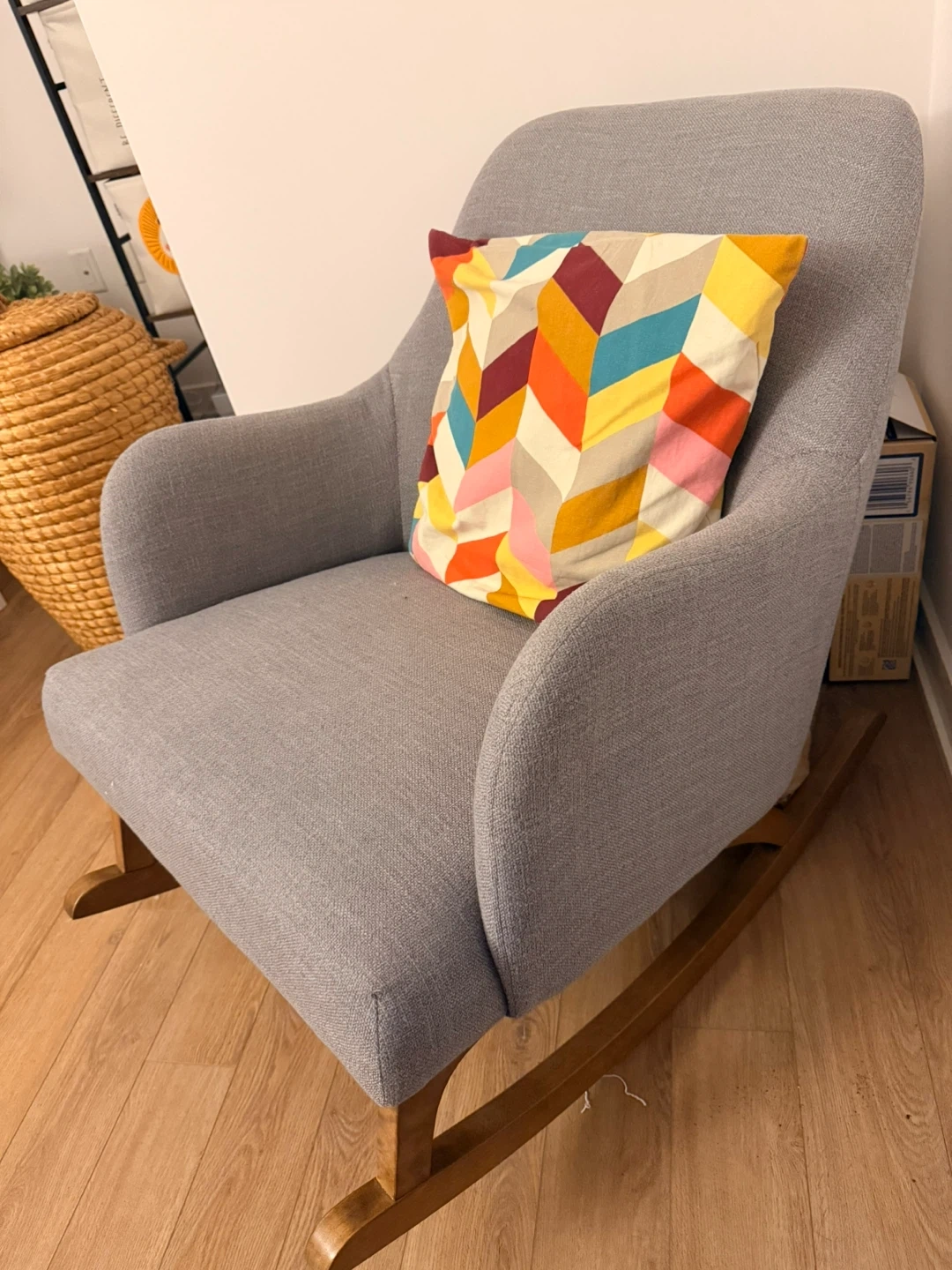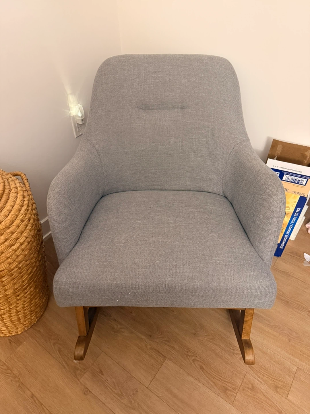 Selling a comfy grey rocking chair! It's in great condition and would be perfect for a nursery or living room.