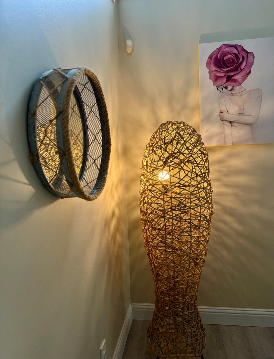 Selling a rattan/wicker floor lamp. It's in great condition and would look lovely in any room. It gives off a warm and inviting glow