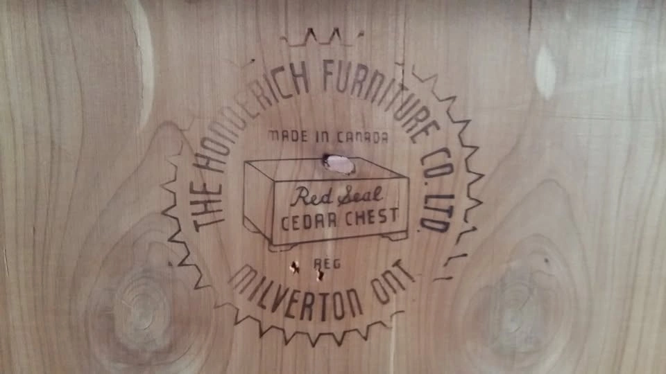 Red Seal Honderich Cedar Chest. Inside is in great condition. Lid has chips and places where veneer is missing. Bottom near drawer has some water damage. Inside is very nice. Fits blankets and linens nicely. Dimensions: 23x40.5x19"