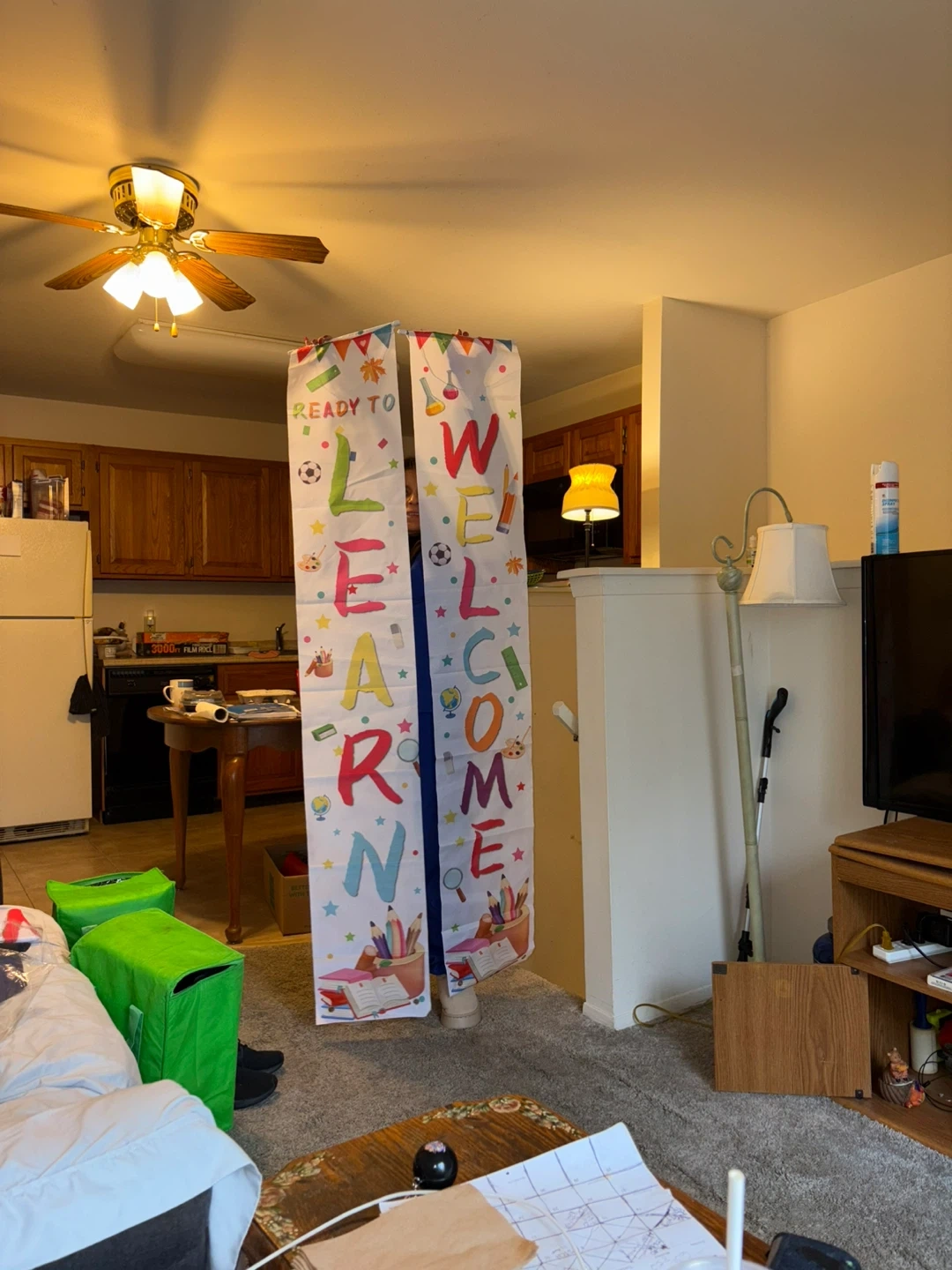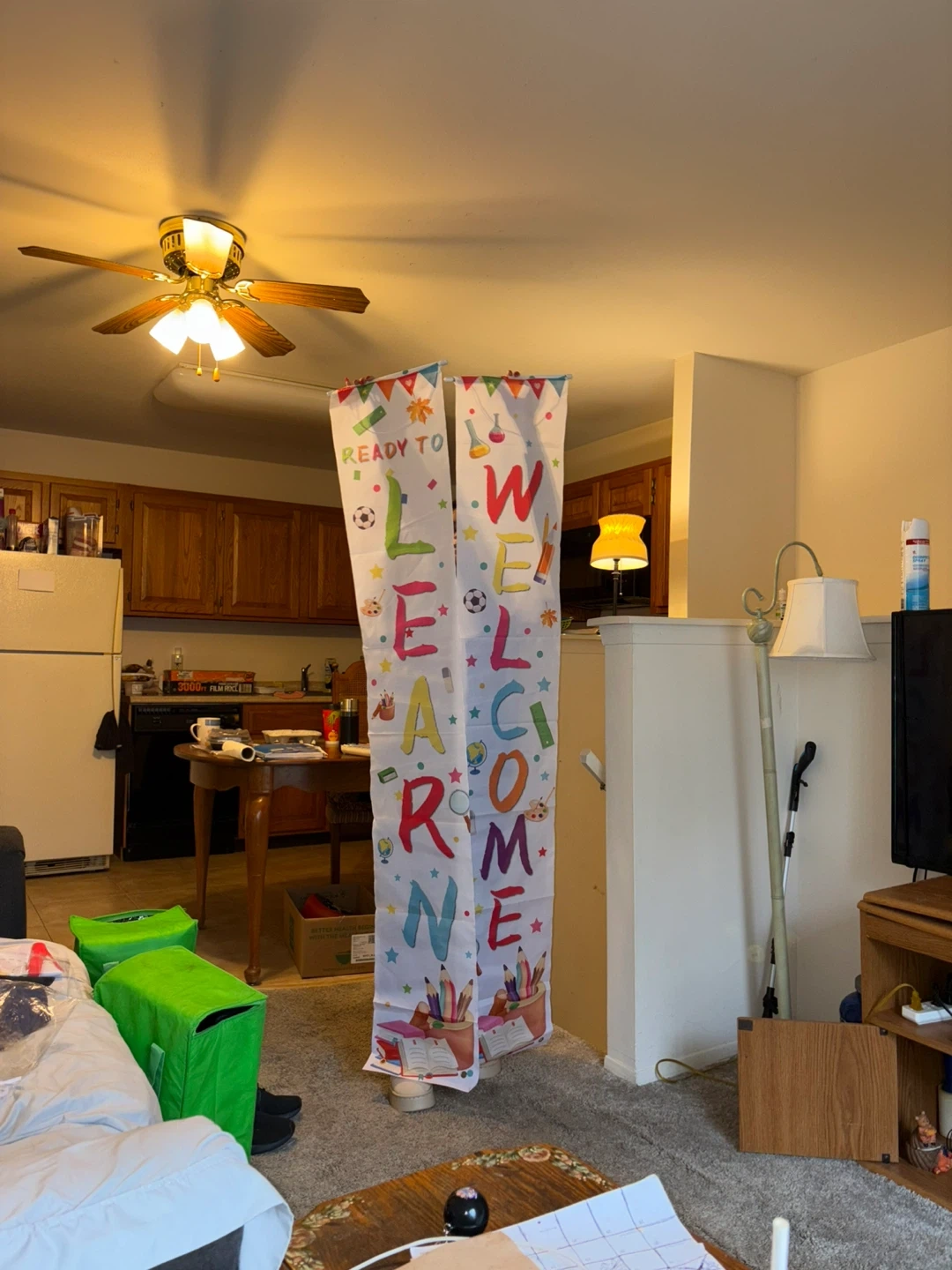 This is a cute banner decoration. It says "Ready to Learn" and "Welcome Back to School" with fun school-themed images. Perfect for decorating a classroom or home for back to school!