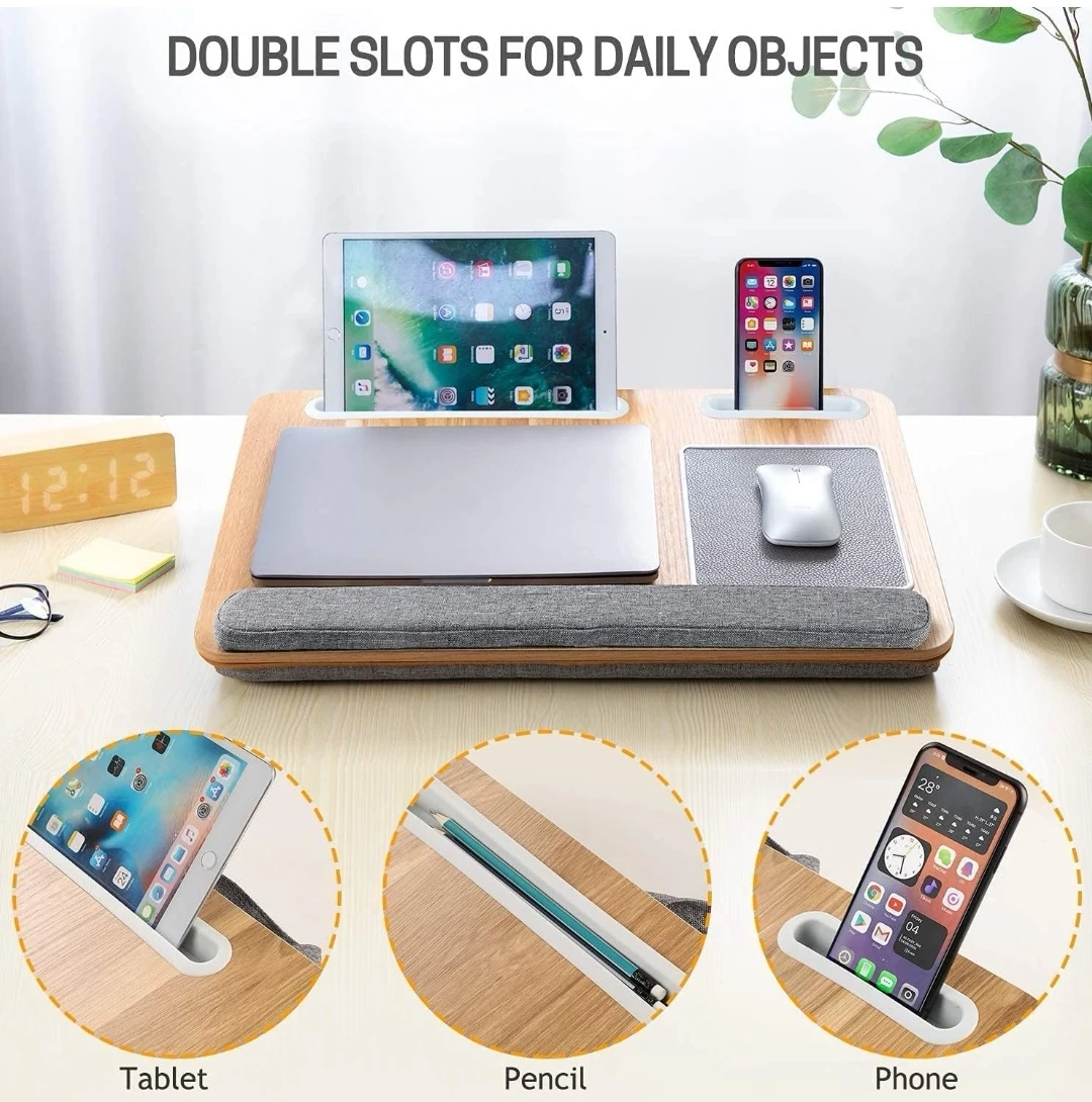 I'm selling a new open box LORYERGO Lap Desk, perfect for working or relaxing with your laptop! This versatile lap desk fits up to a 17-inch laptop and features a cushioned wrist rest for added comfort. It also includes a built-in mouse pad and a slot for your cellphone, making it ideal for use on the couch, bed, or at home.
