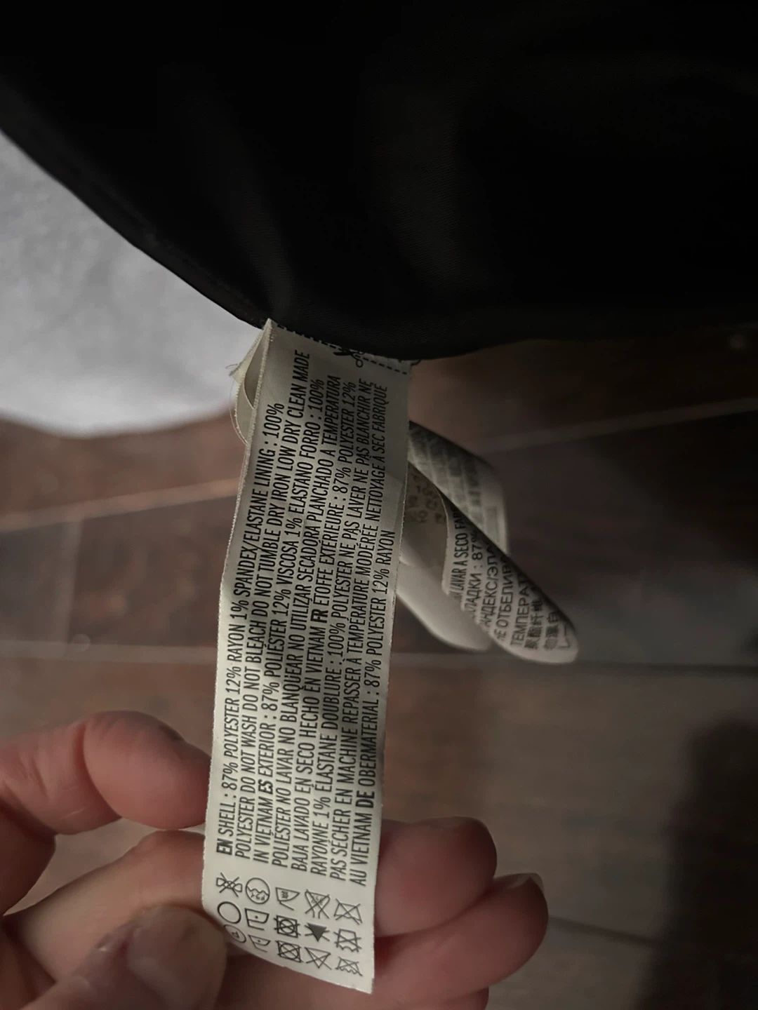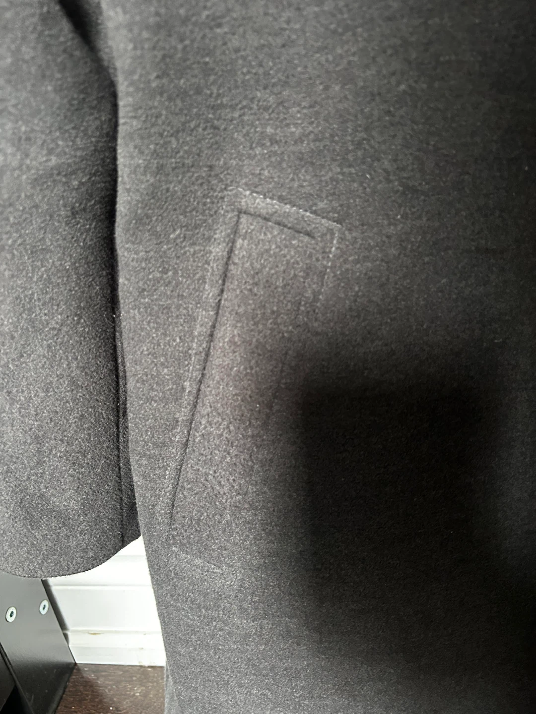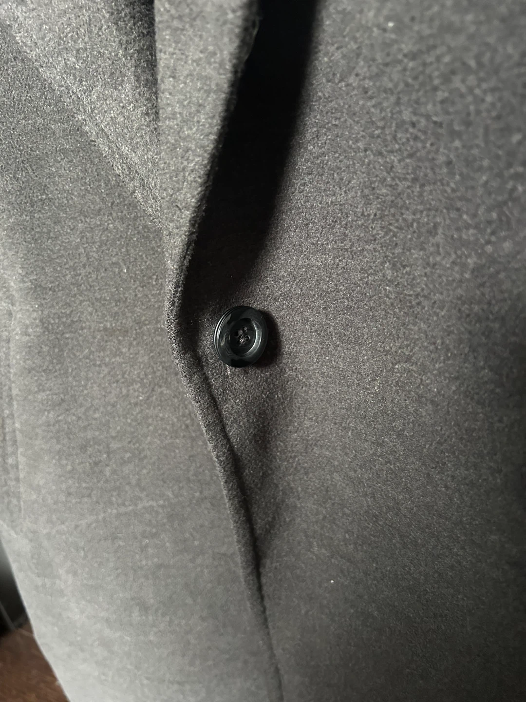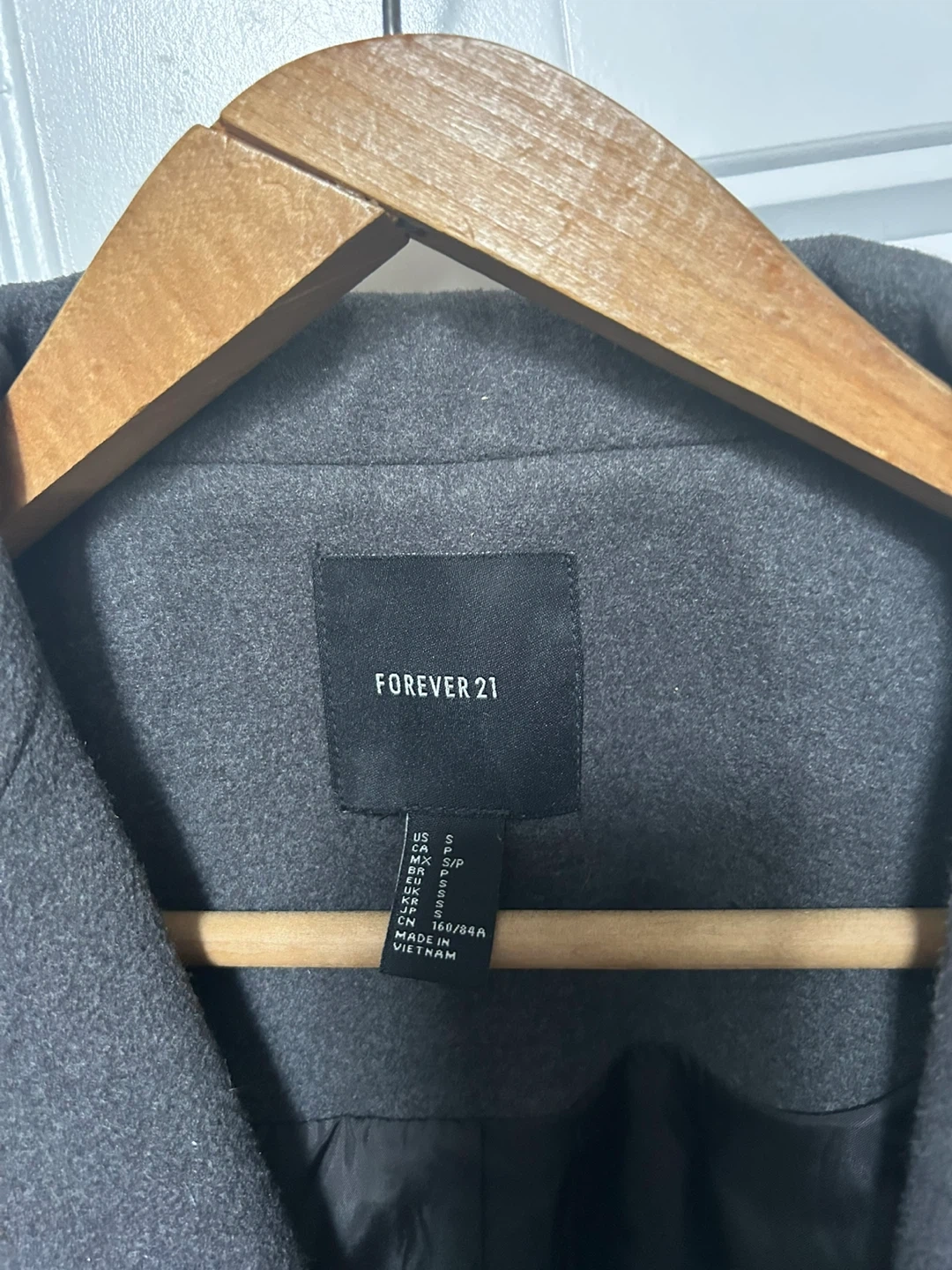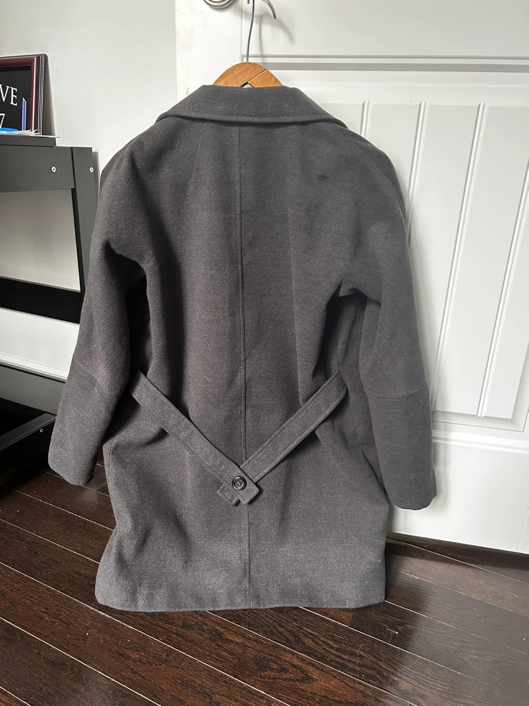 Grey wool-like fall/winter coat with decorative belt in back and single button closure. It has a drop- shoulder style and side pockets. It’s polyester blend fabric but it feels like wool blend and it’s quite warm. No flaws to note.