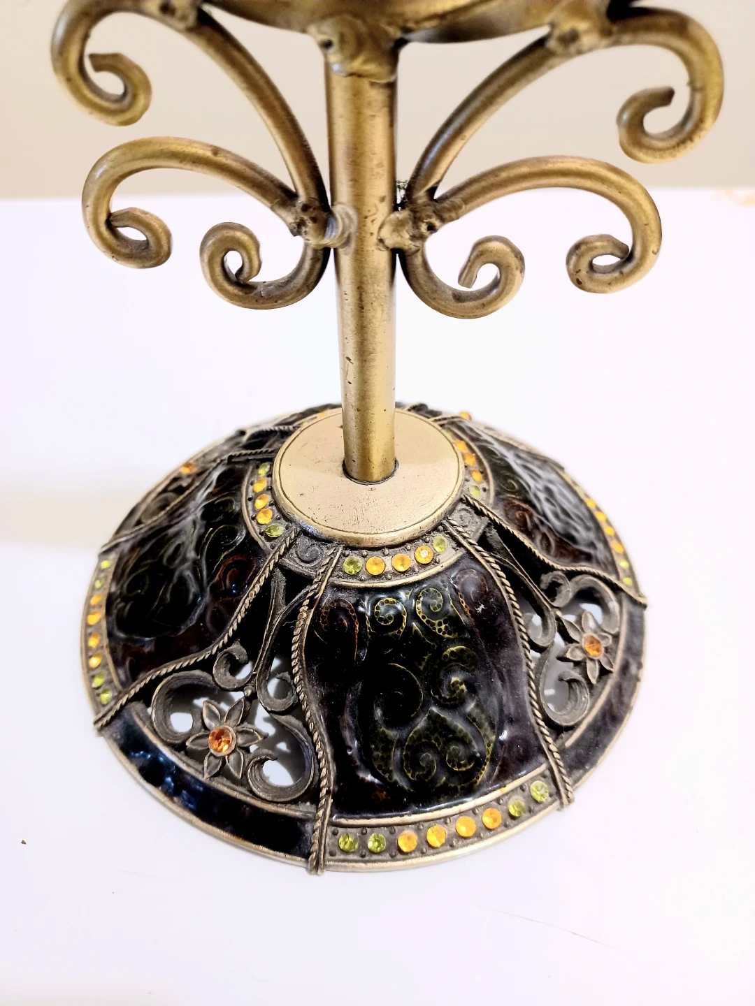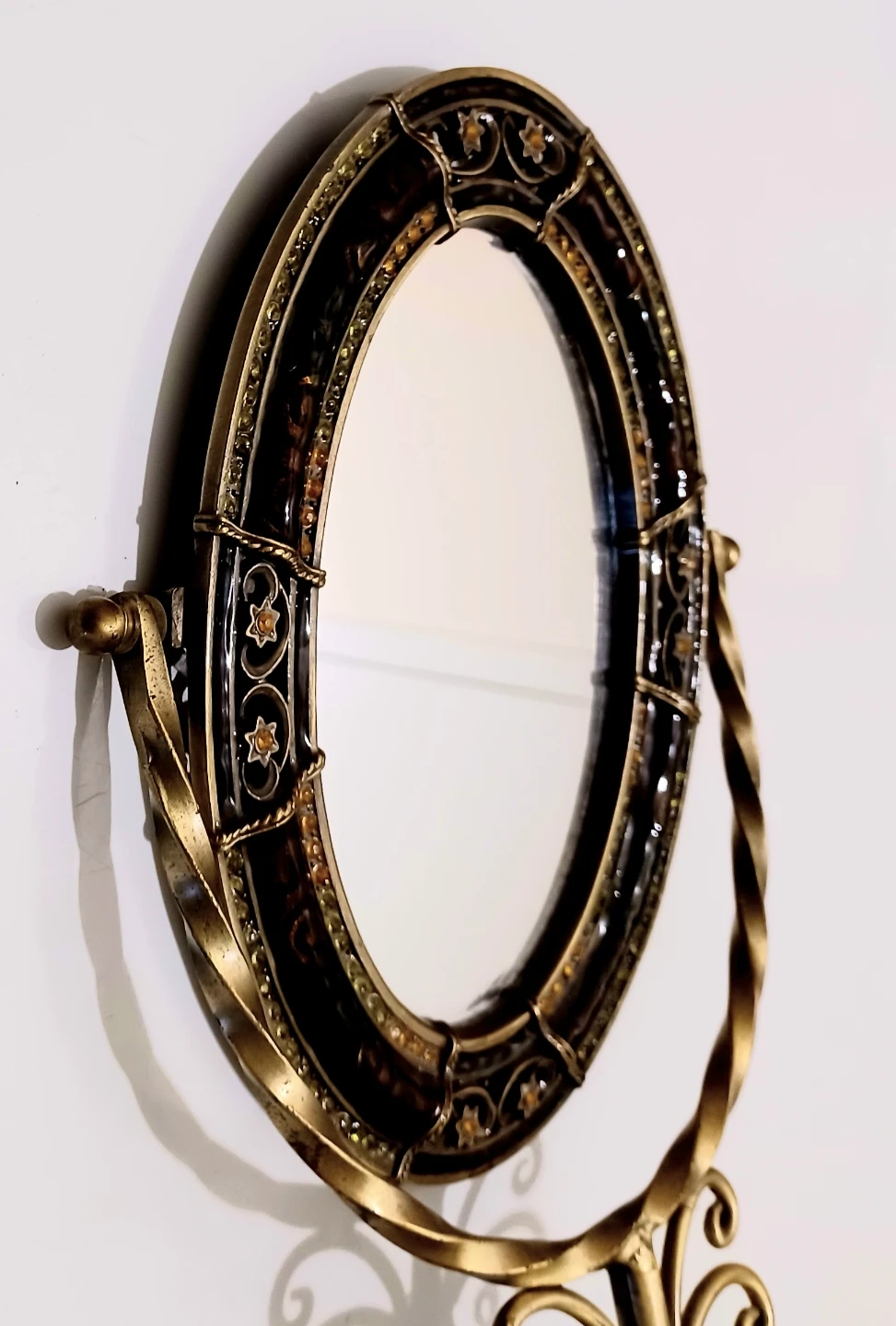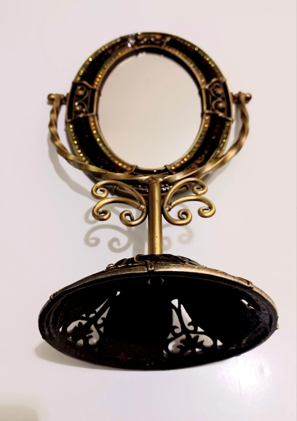Add a touch of antique elegance to your dressing table with this ornate vanity mirror. This piece features a lovely oval mirror framed with detailed metalwork and decorative jewel accents. The base is equally stunning, showcasing intricate patterns and colours. This mirror remains in excellent condition, perfect for adding character to any room. A great addition to any collection, the mirror provides both function and vintage charm.