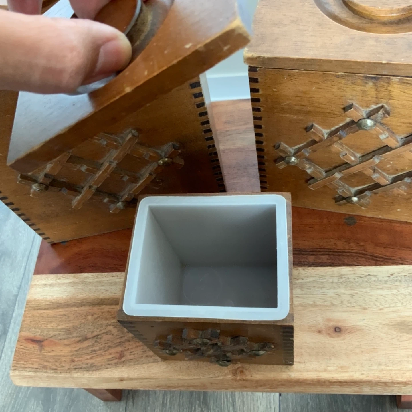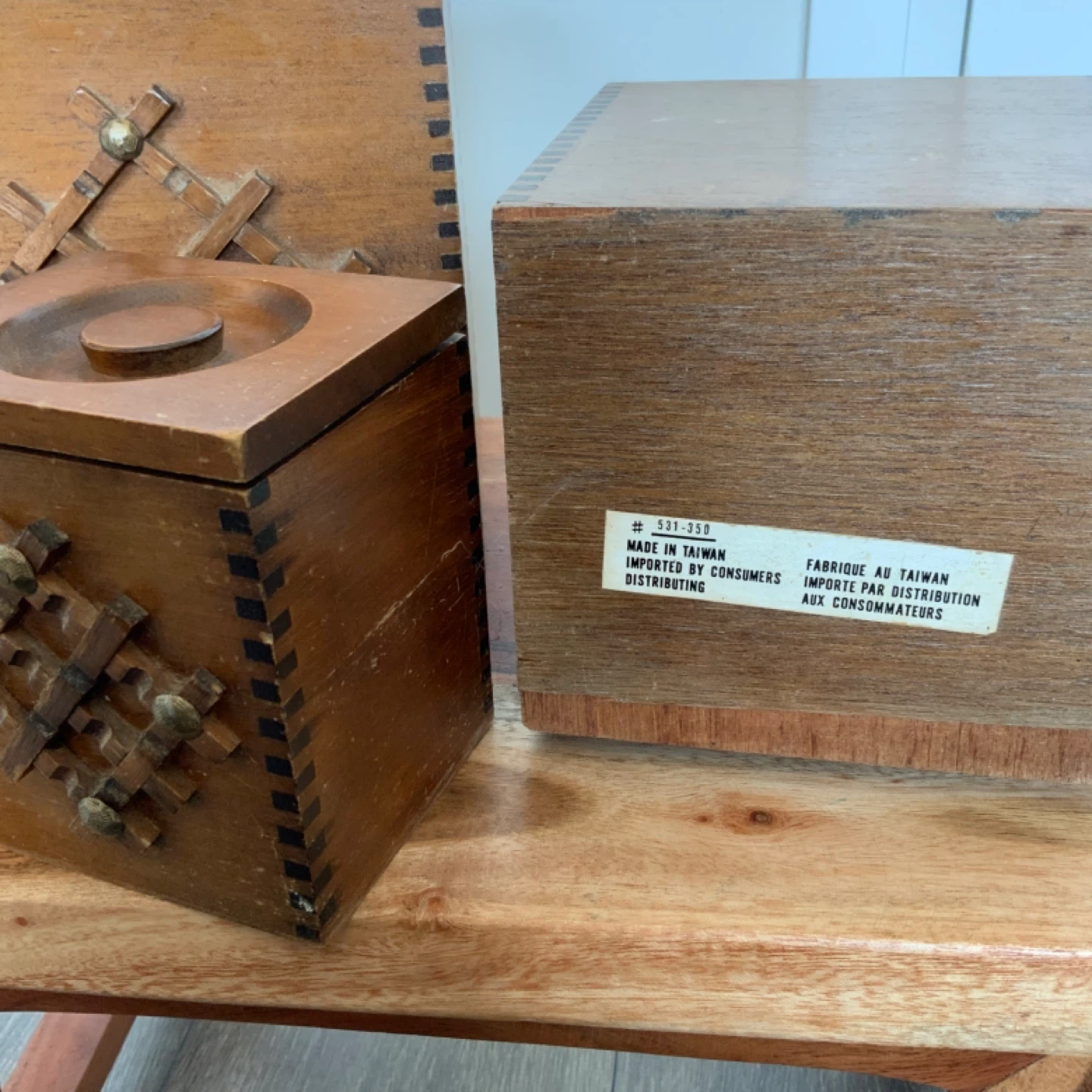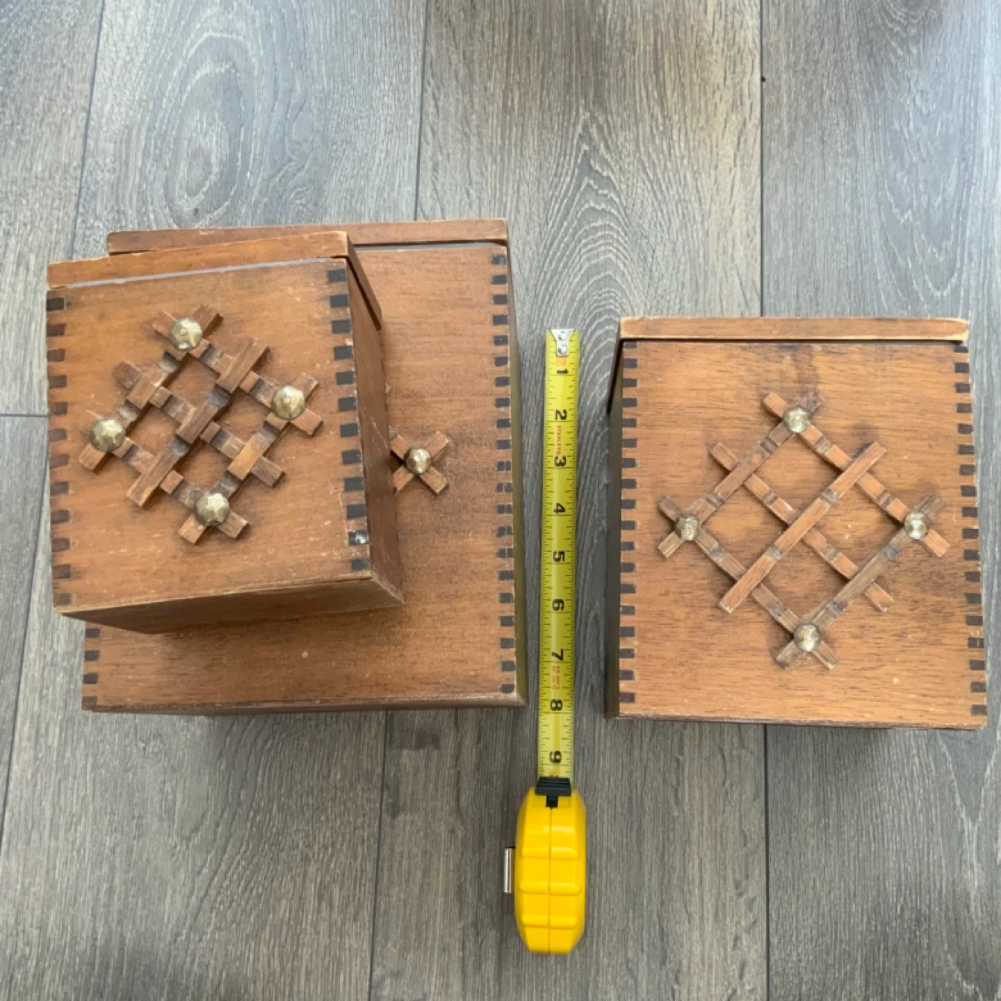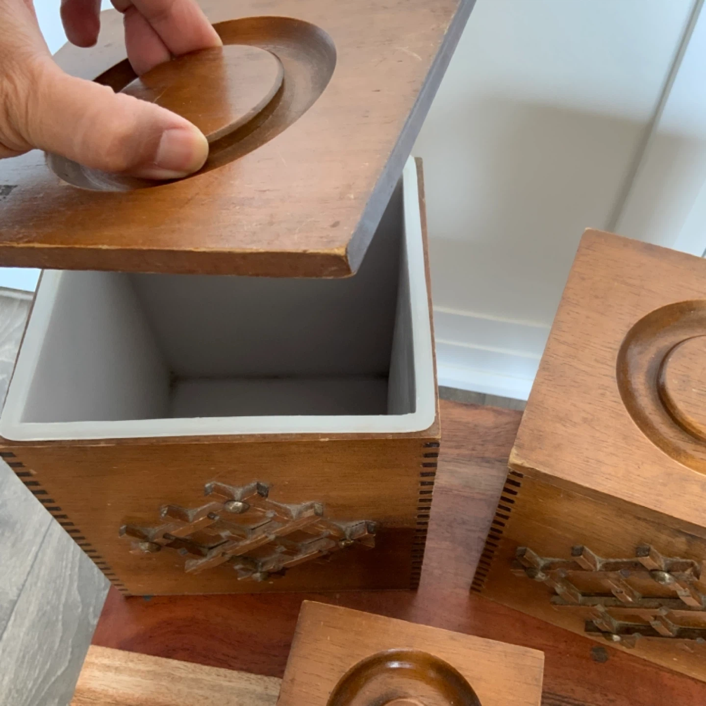 Here's a set of three vintage wooden storage boxes! Wooden boxes, lined with plastic. They have a unique design on the front and come with lids.