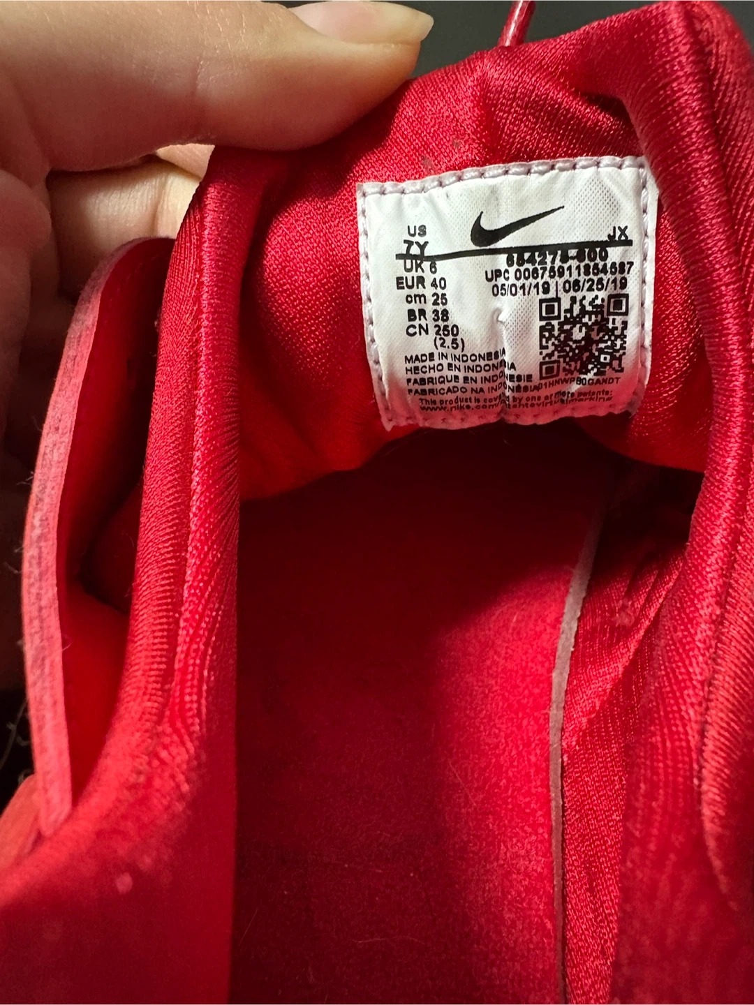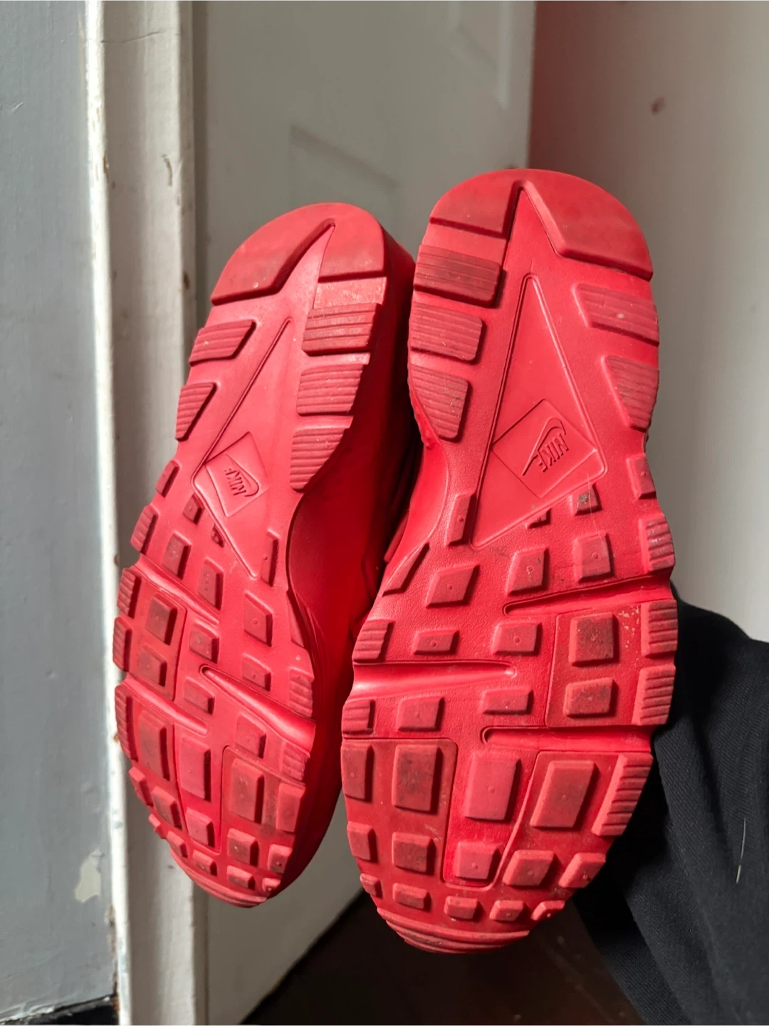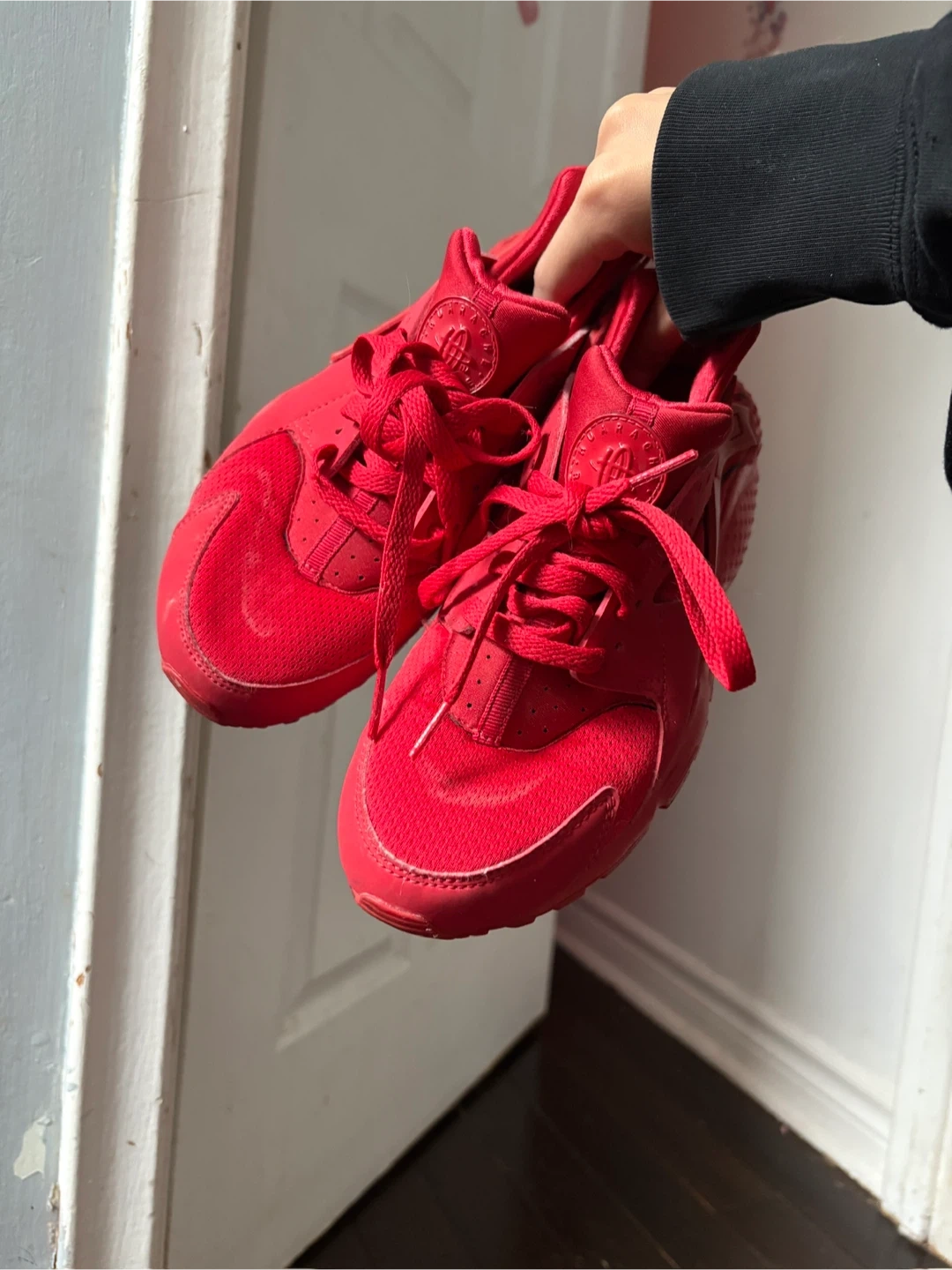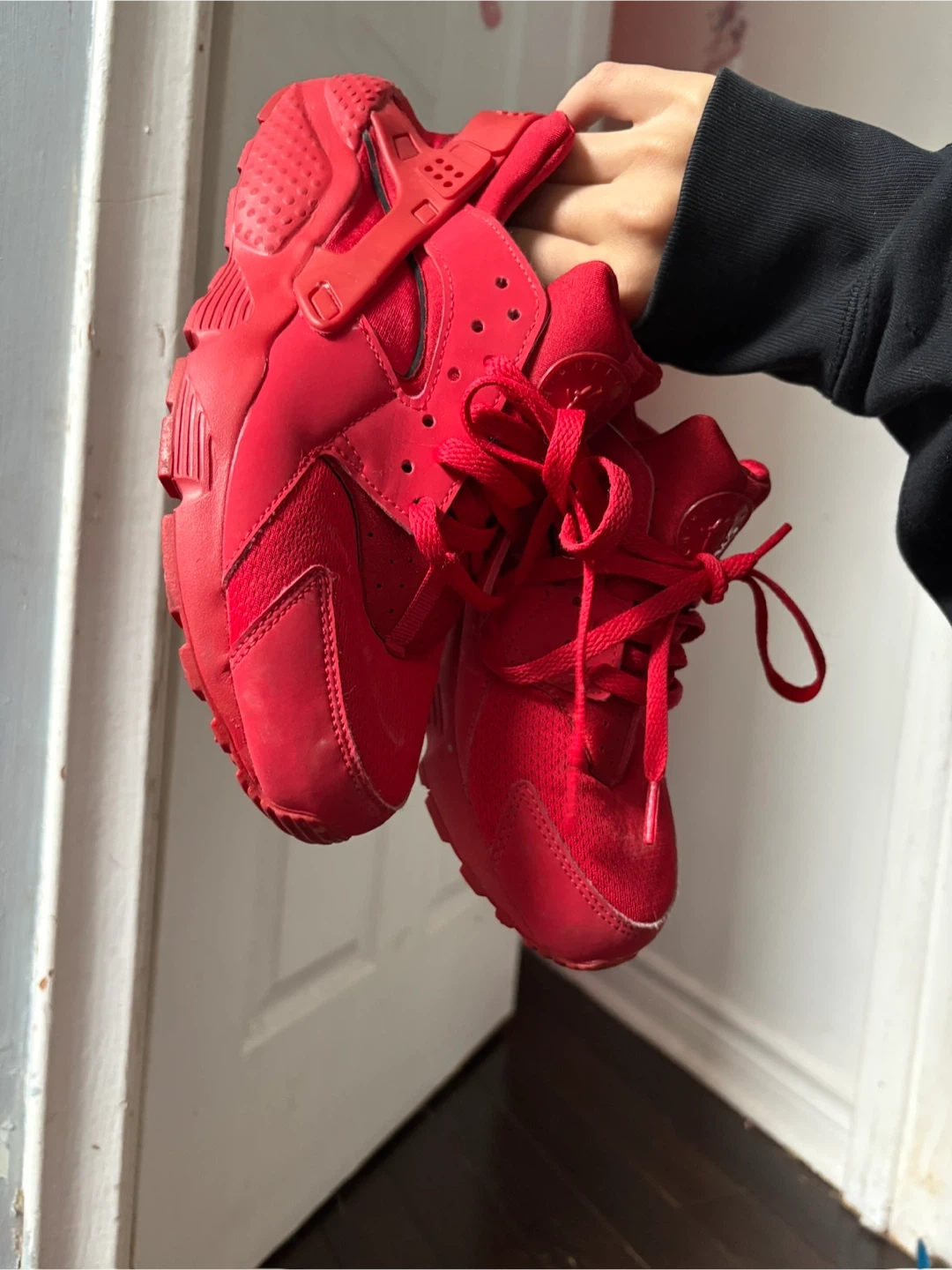 Selling a pair of Nike Huarache shoes in red. They are a US size 7Y, UK size 6, EUR size 40, and CM size 25. Great for everyday wear!