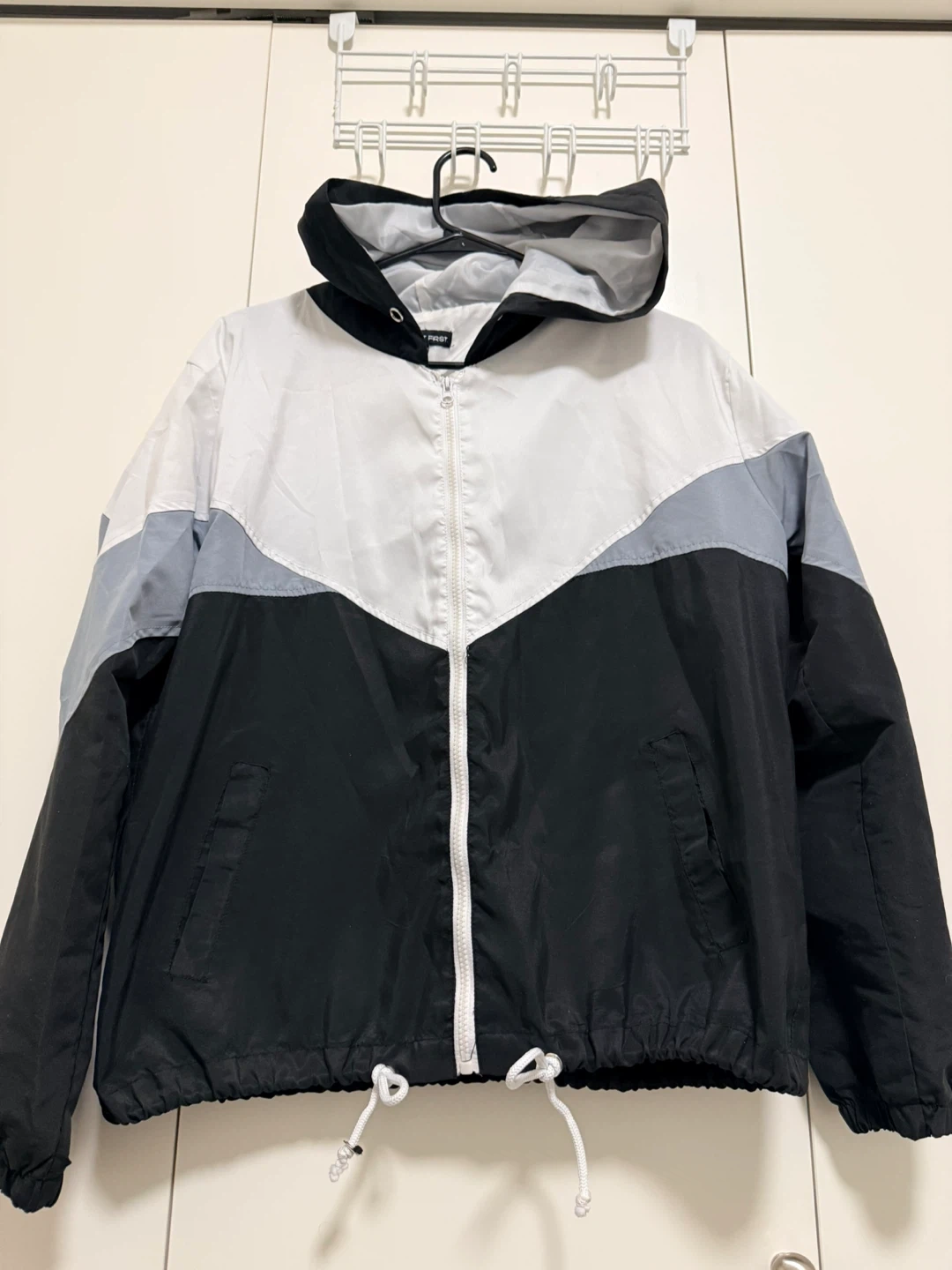 Selling a windbreaker from I Saw It First! It's a size medium and features a stylish black, white, and grey colour block design. Perfect for layering or wearing on breezy days