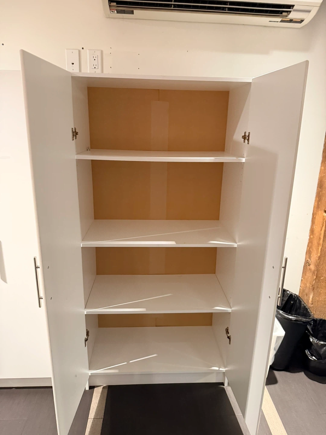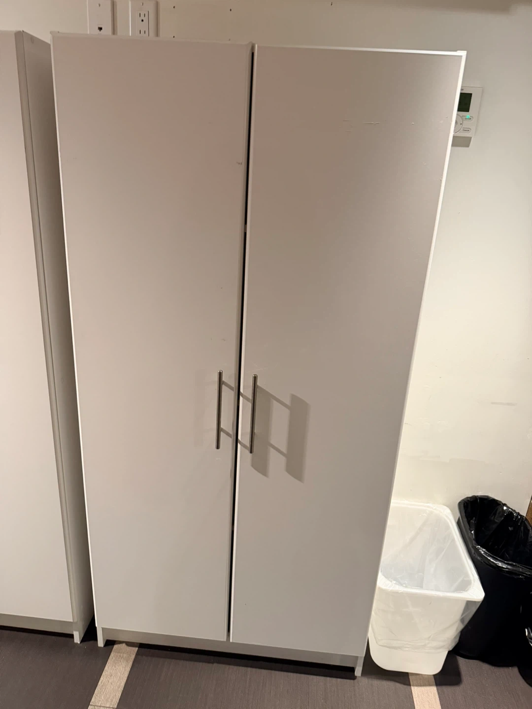 One Free white cabinet with doors. 3.5 x 5.5 x 1.5. It has adjustable shelves inside. Available M-F 9-4 first come first serve corner of Beatty and Smithe no onsite parking cut through lane is used at your own risk. No one can help move it but no stairs. Reply with time and date of pickup to receive address and instructions. All other replies will be ignored.