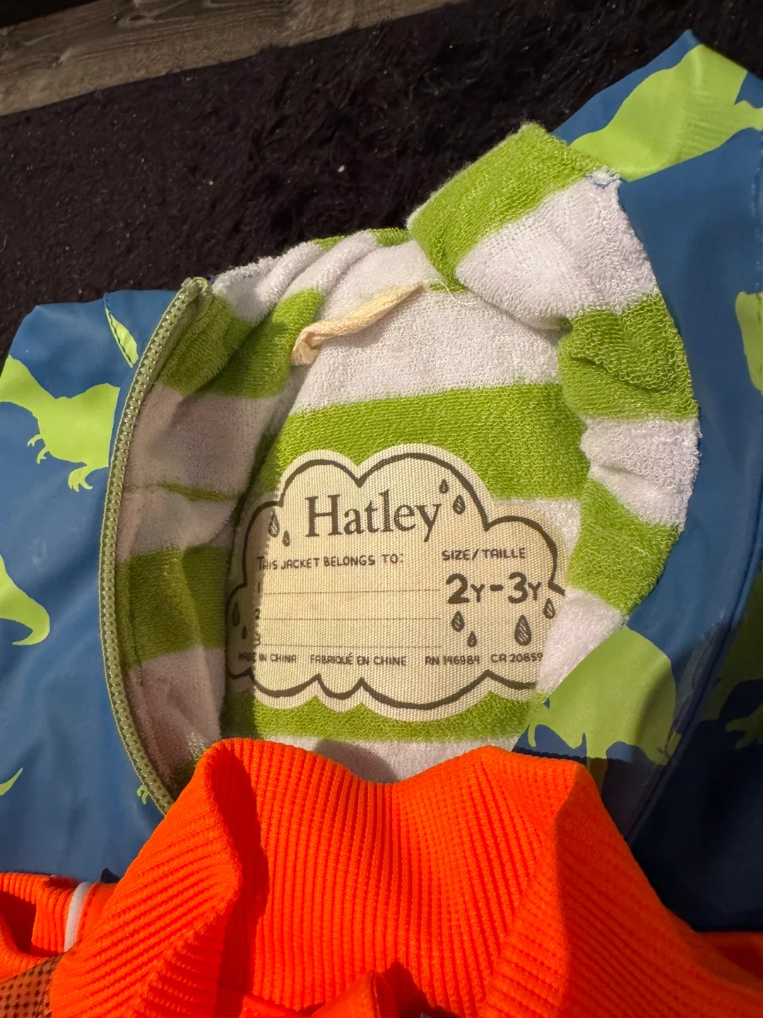 Selling a super cute Hatley rain jacket and pants set in size 2-3Y! The set is blue with a fun yellow dinosaur print. Perfect for keeping your little one dry and stylish on rainy days