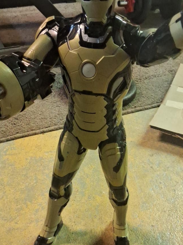 Selling an Iron Man Mark 27 Disco Armor figure. It features a unique gold and black colour scheme. Great for collectors or fans of the Iron Man series!