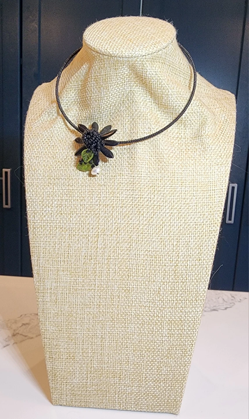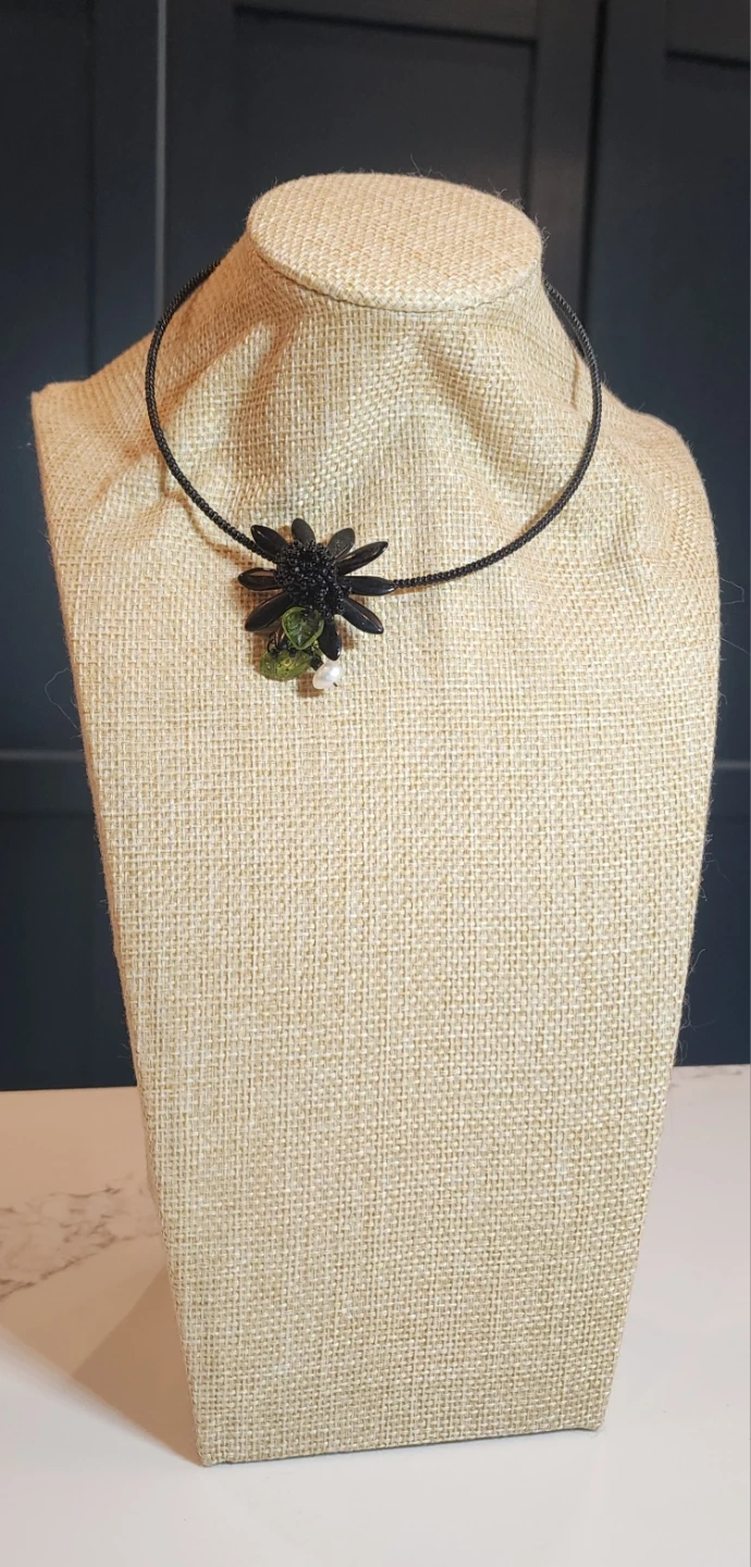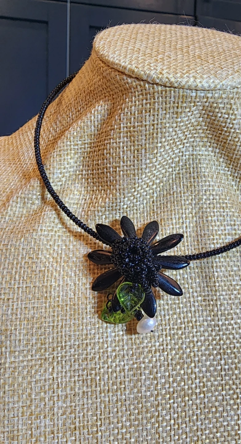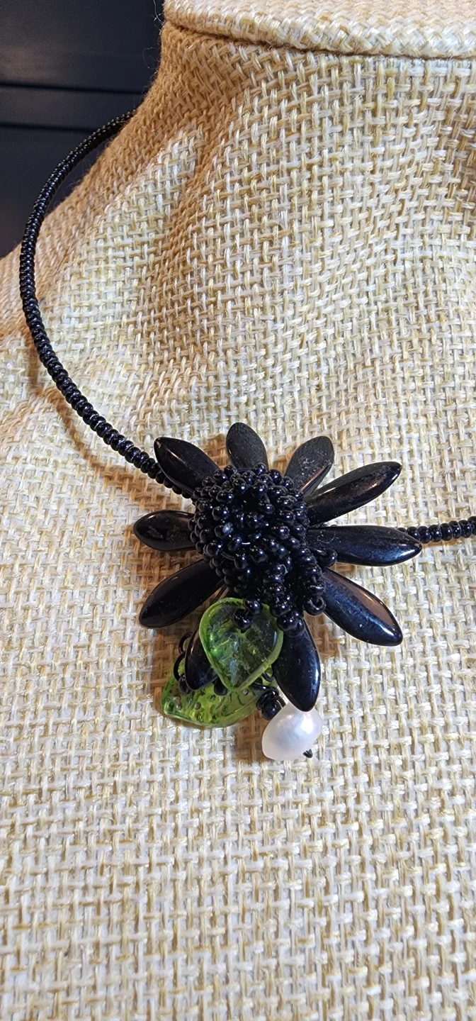 This is a unique black beaded choker necklace with a flower pendant. The pendant features black petals, beaded detailing, green leaves, and a faux pearl accent. It's a stylish piece to add to your jewelry collection!