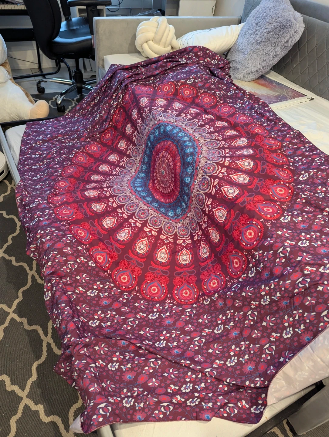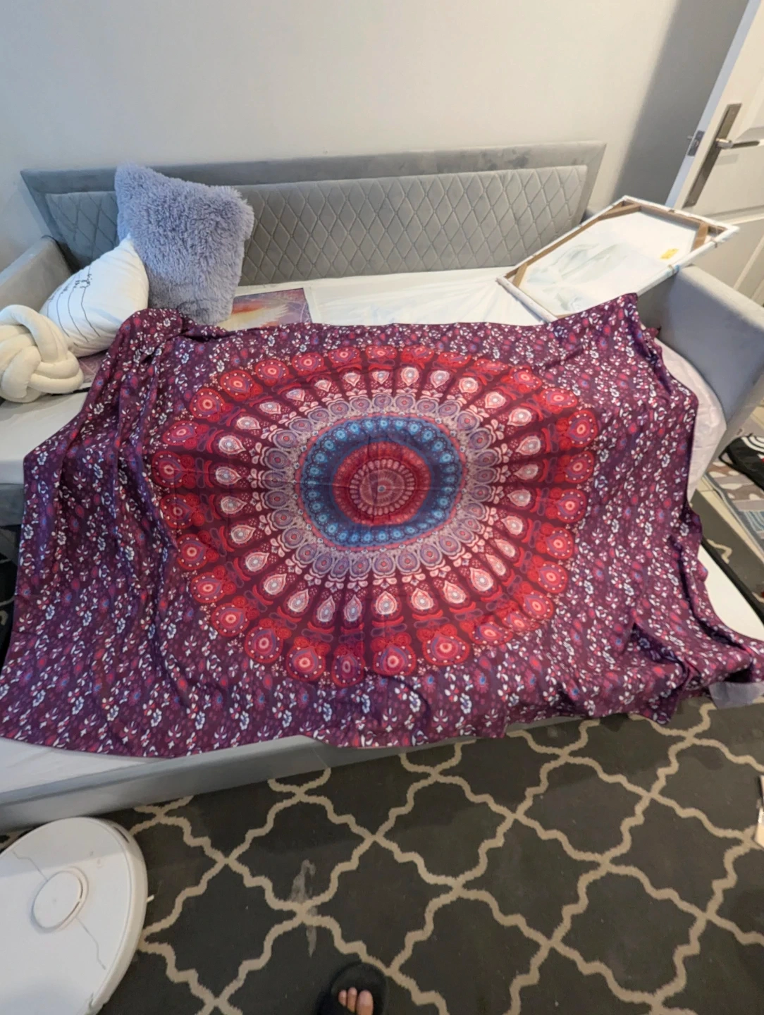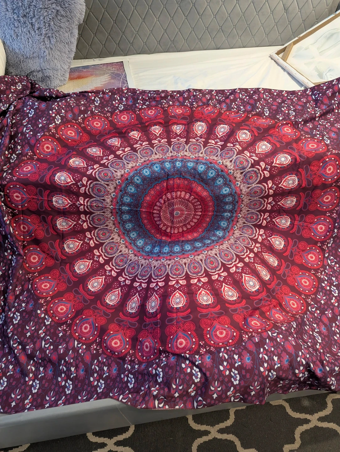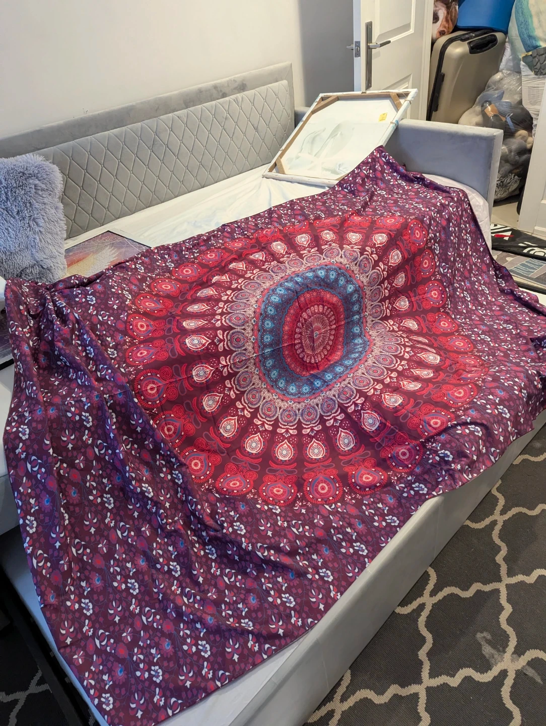 Selling a beautiful mandala tapestry! It's a vibrant piece that can be used as a wall hanging, bedspread, or even a picnic blanket. The colours are rich and eye-catching, perfect for adding a bohemian touch to any space
