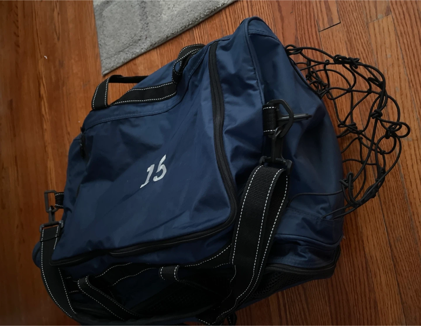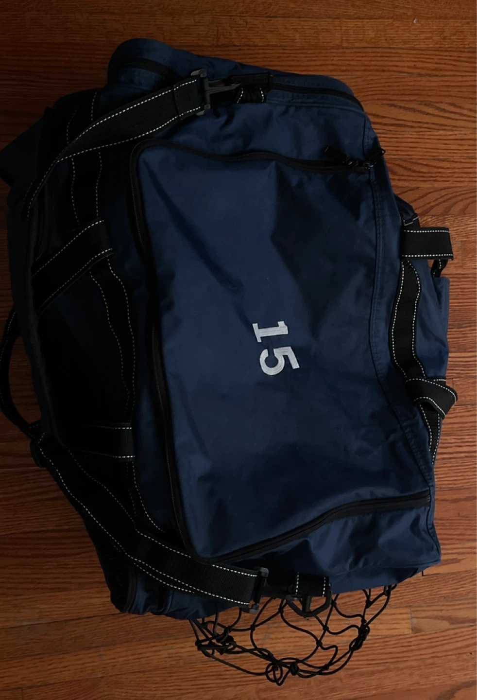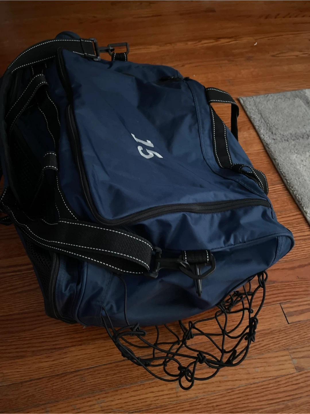 Selling a blue sports equipment bag. It has the number 15 on the side and a net for holding a ball. Great for carrying sports gear to practices and games