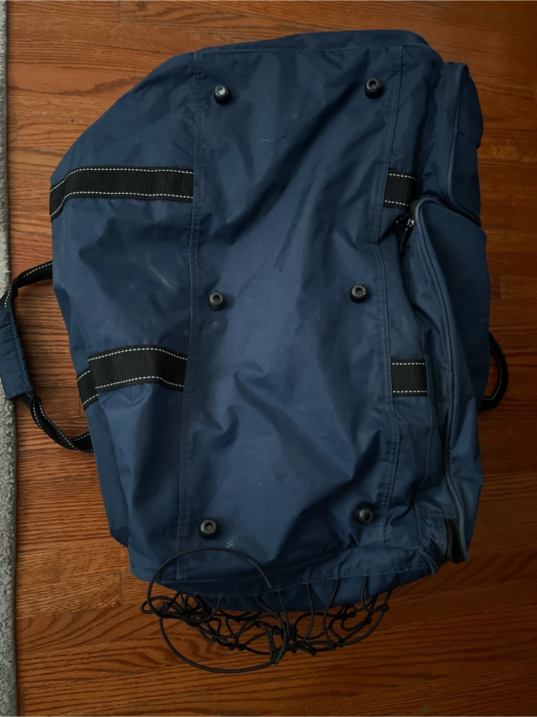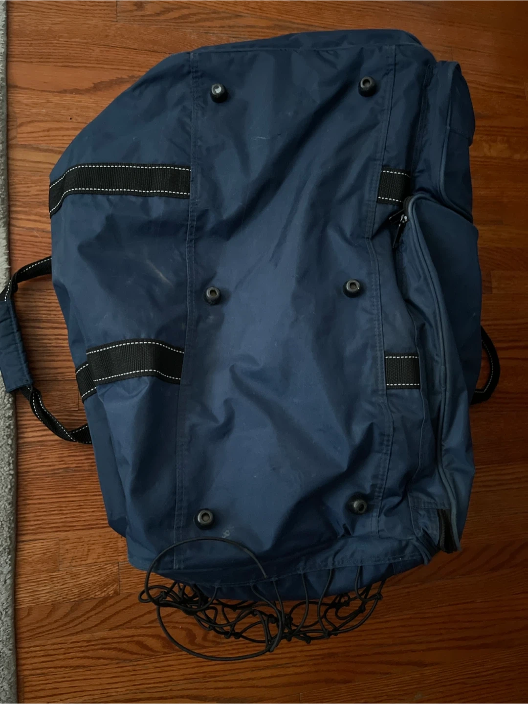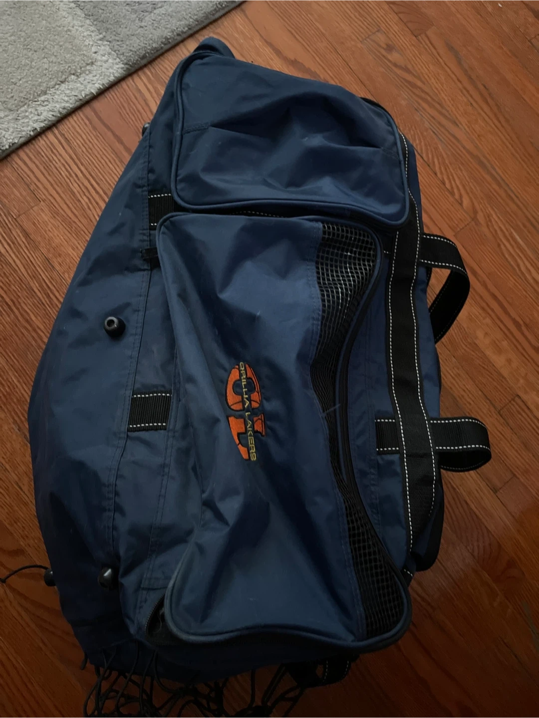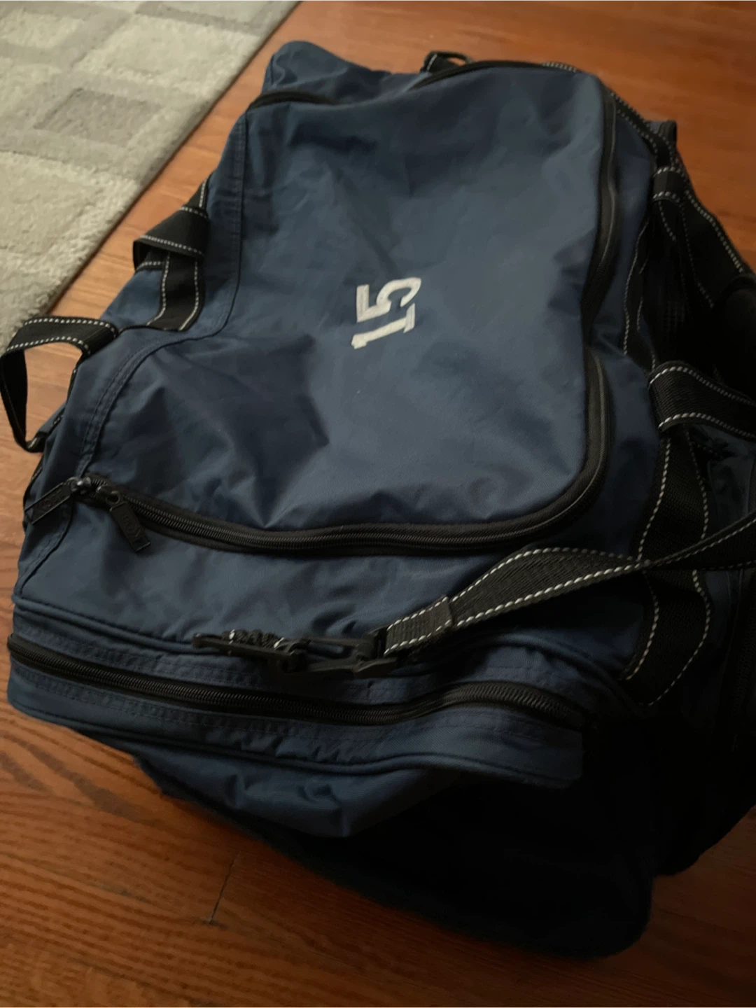 Selling a blue sports equipment bag. It has the number 15 on the side and a net for holding a ball. Great for carrying sports gear to practices and games