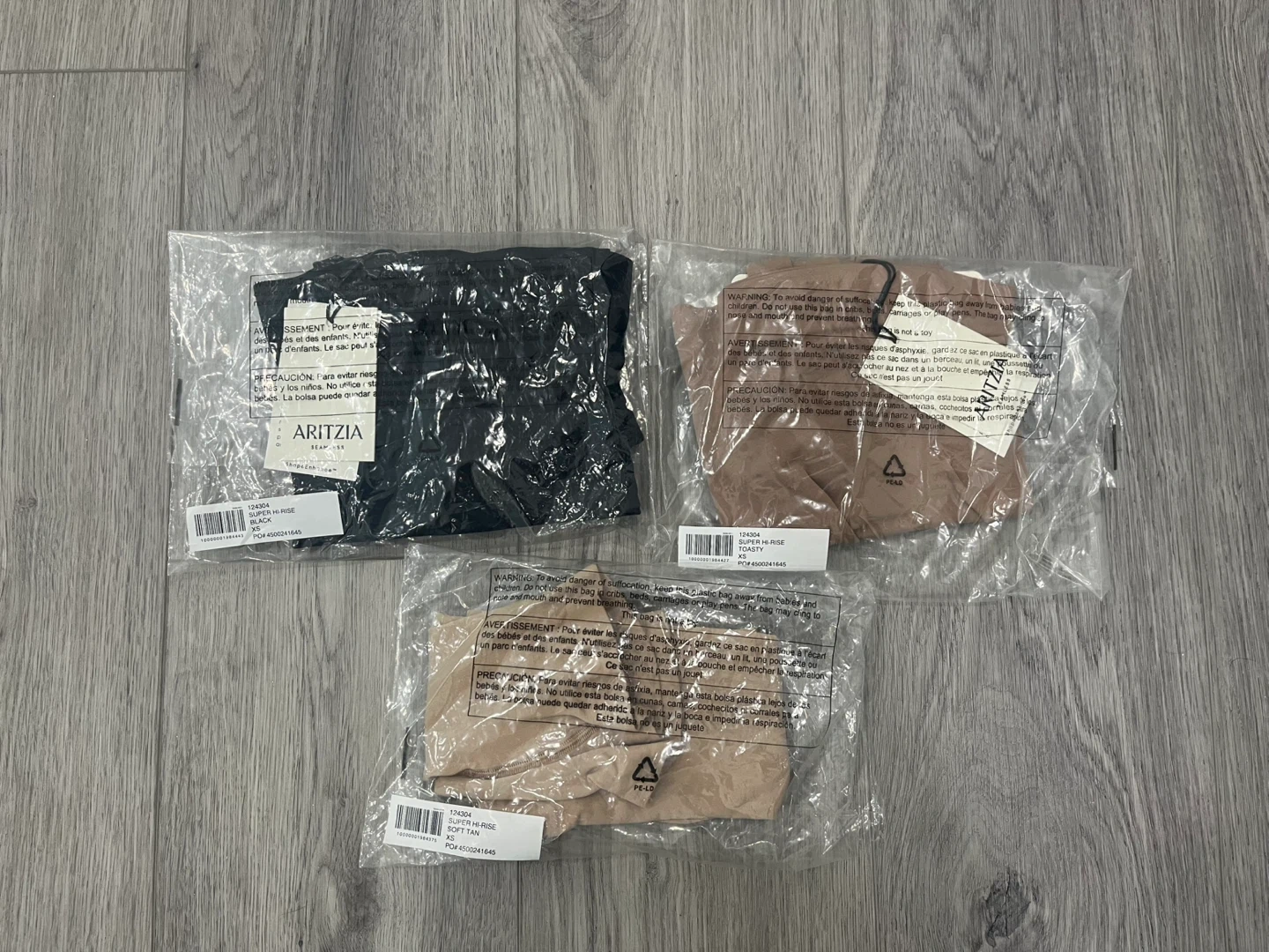 I have three pairs of Aritzia Super Hi-Rise leggings, all in size XS. One pair is black, one is toasty, and one is soft tan. All are new in their original packaging! Soft tan was tried on once.
