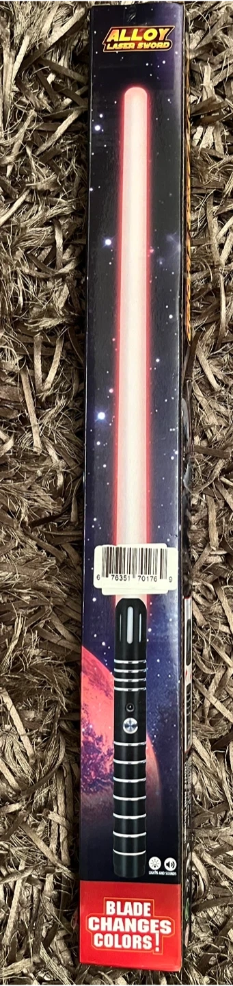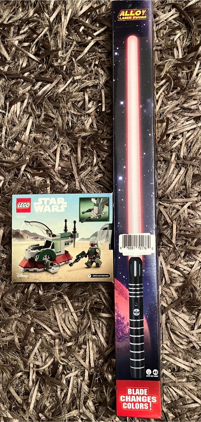 Selling an Alloy Laser Sword and a LEGO Star Wars set together! The laser sword box says it has motion sensors, controlled sounds effects, lights and sounds, and blade changes colors! The LEGO set is 75344, Boba Fett's Starfighter, and is for ages 6+ with 85 pieces