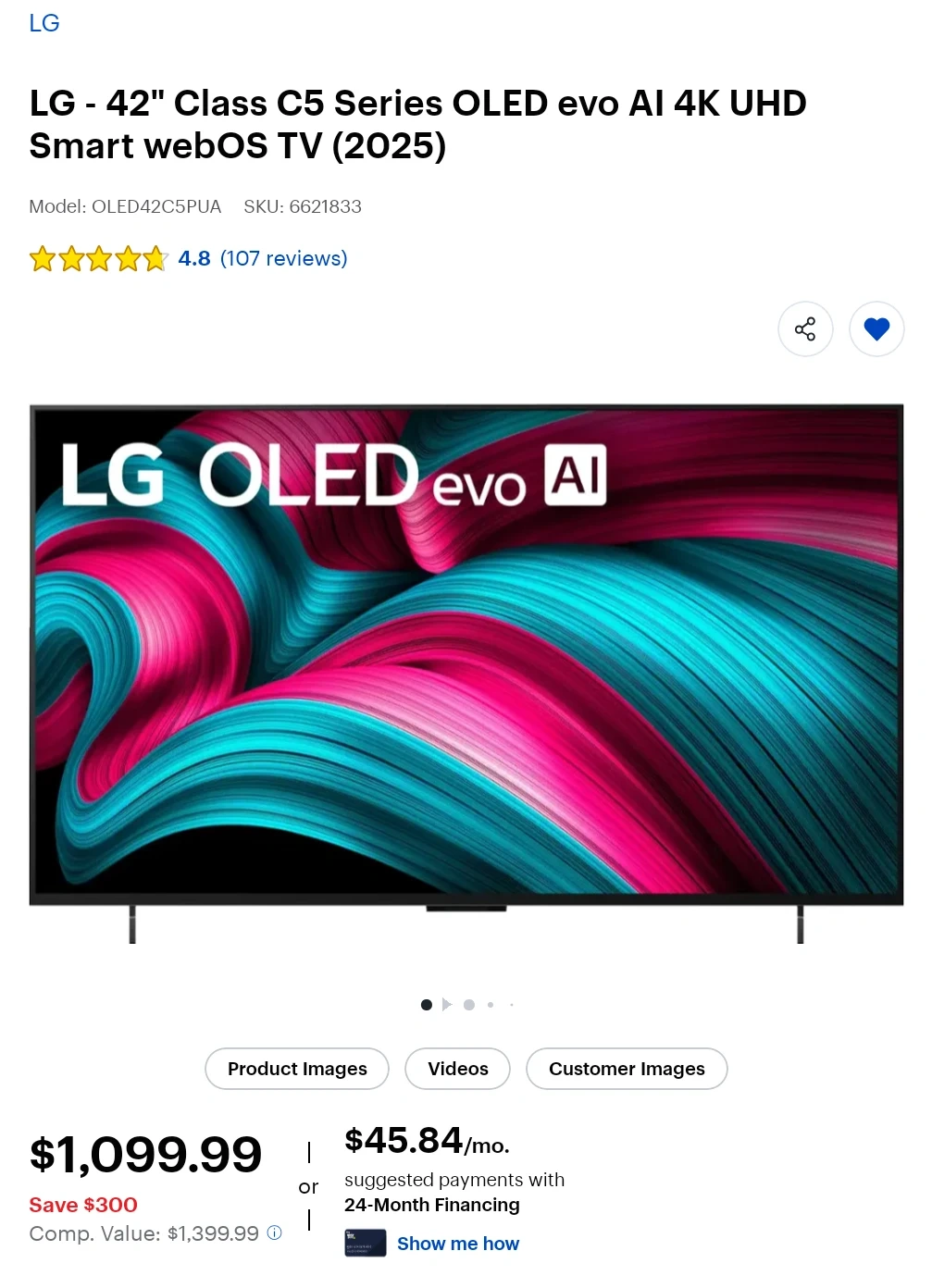 Selling an LG 42-inch Class C5 Series OLED evo AI 4K UHD Smart webOS TV! Retails for $1,099.99. This TV has amazing picture quality and smart features. It's in great condition and ready for a new home entertainment setup