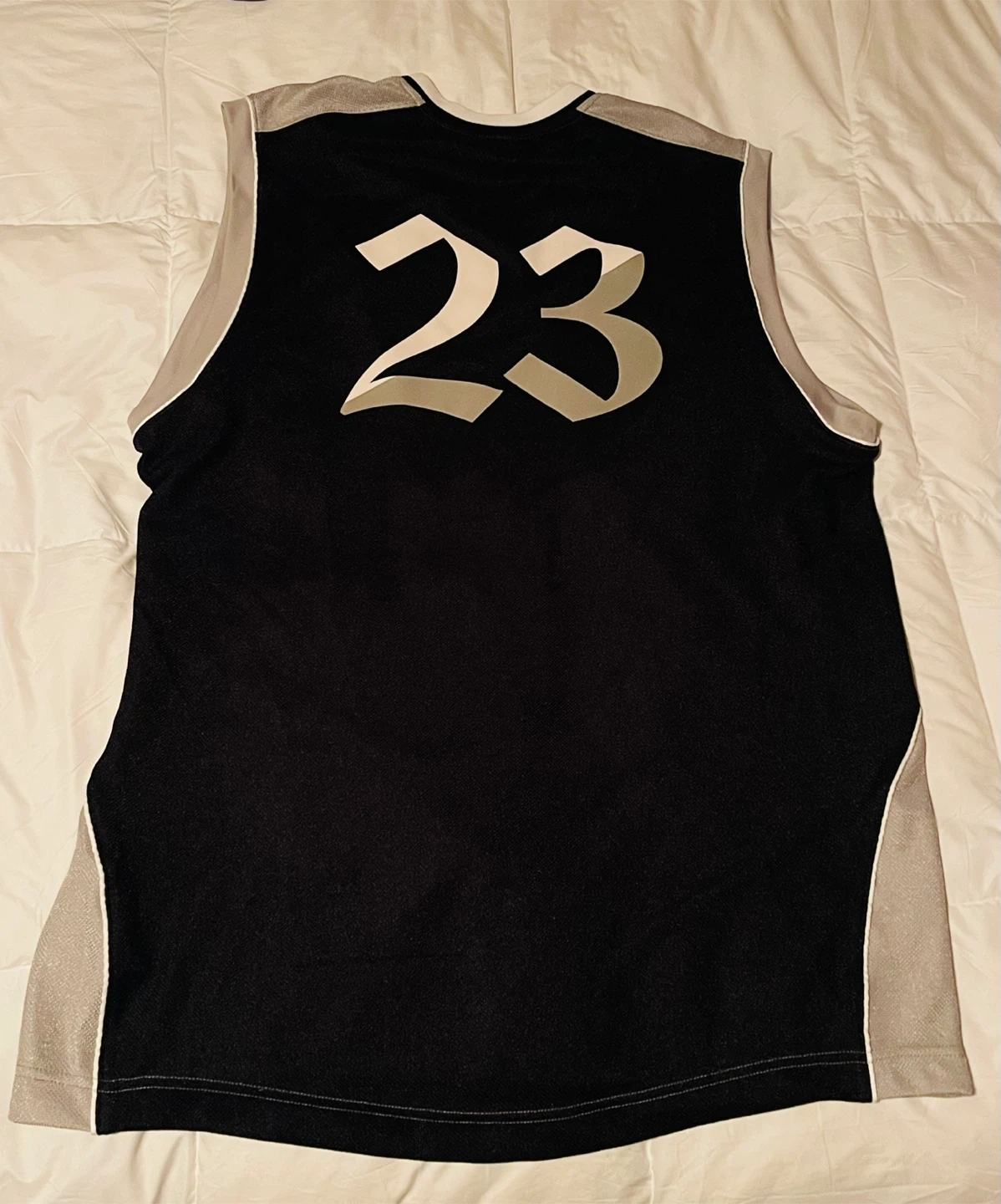 Selling a Jordan basketball jersey with #23 on the back. It’s black with silver accents and perfect for playing ball, hanging out, or adding some style to your fit.