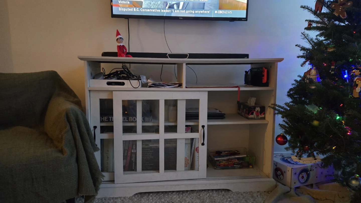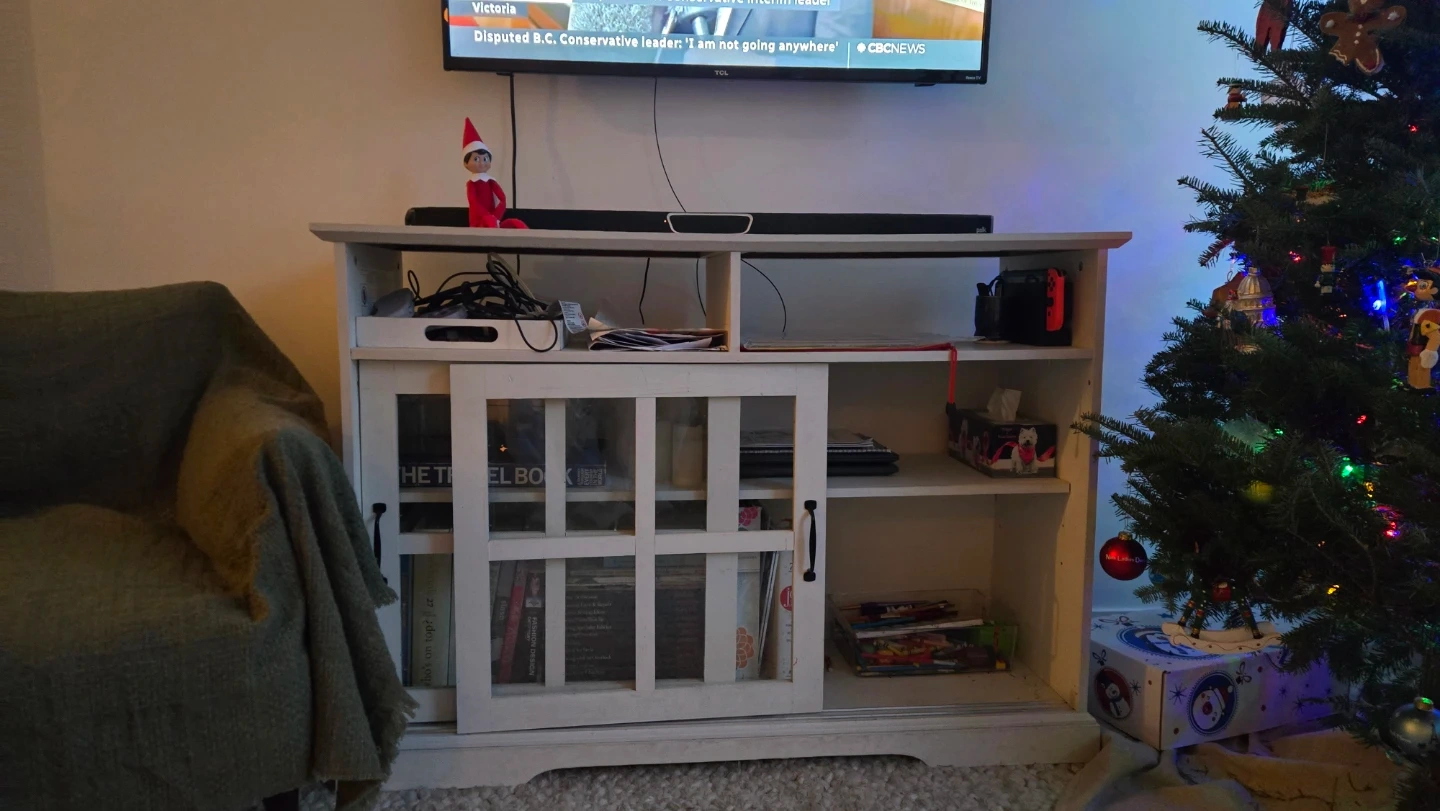 Giving away a white TV stand. It features a sliding door and shelving for storage. Perfect for a living room or entertainment area!