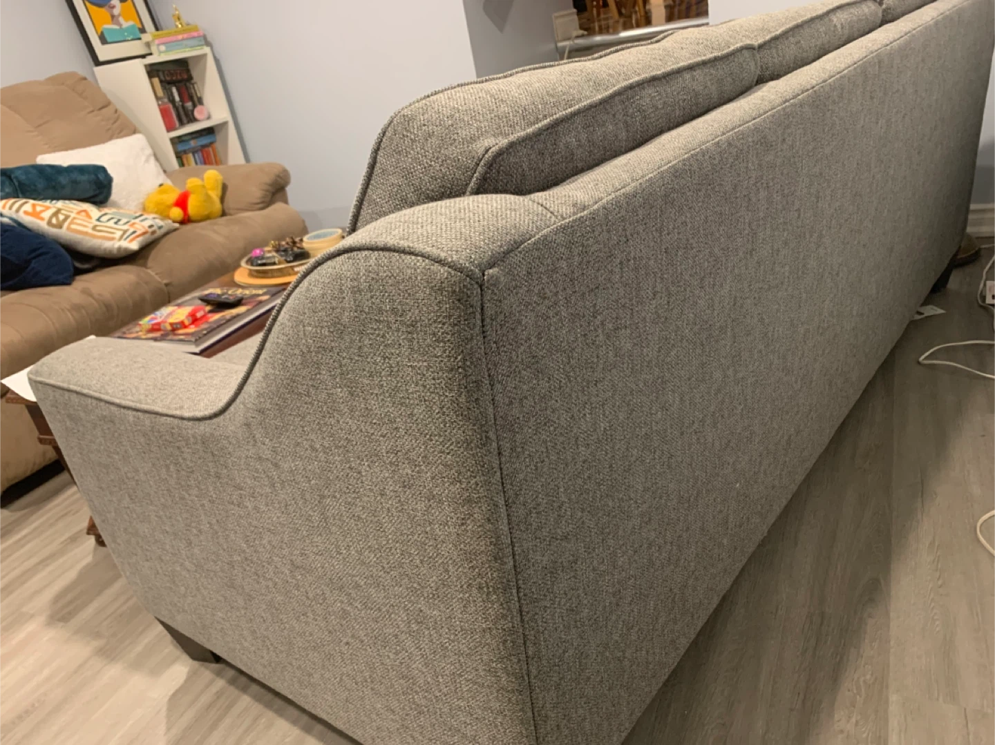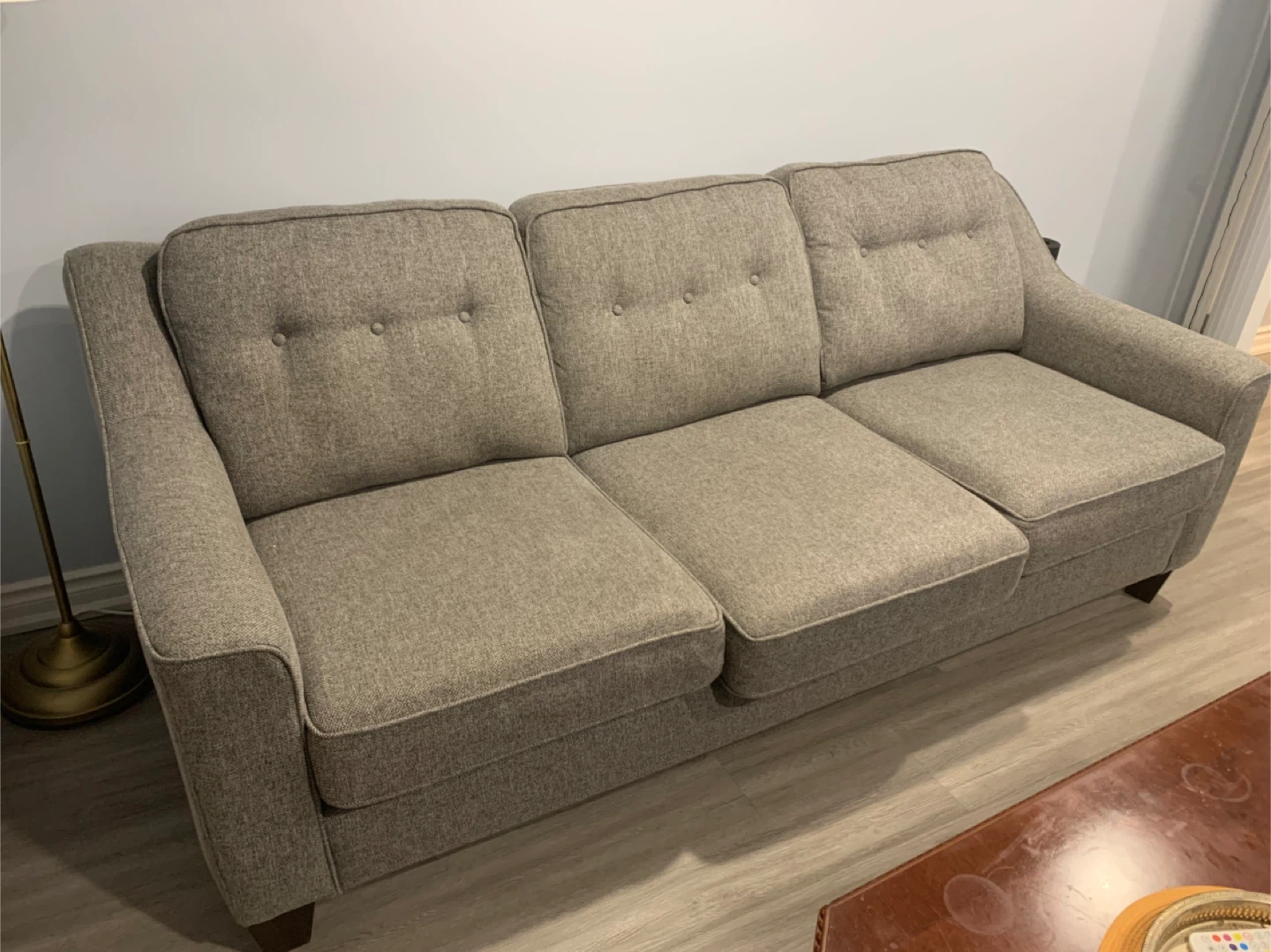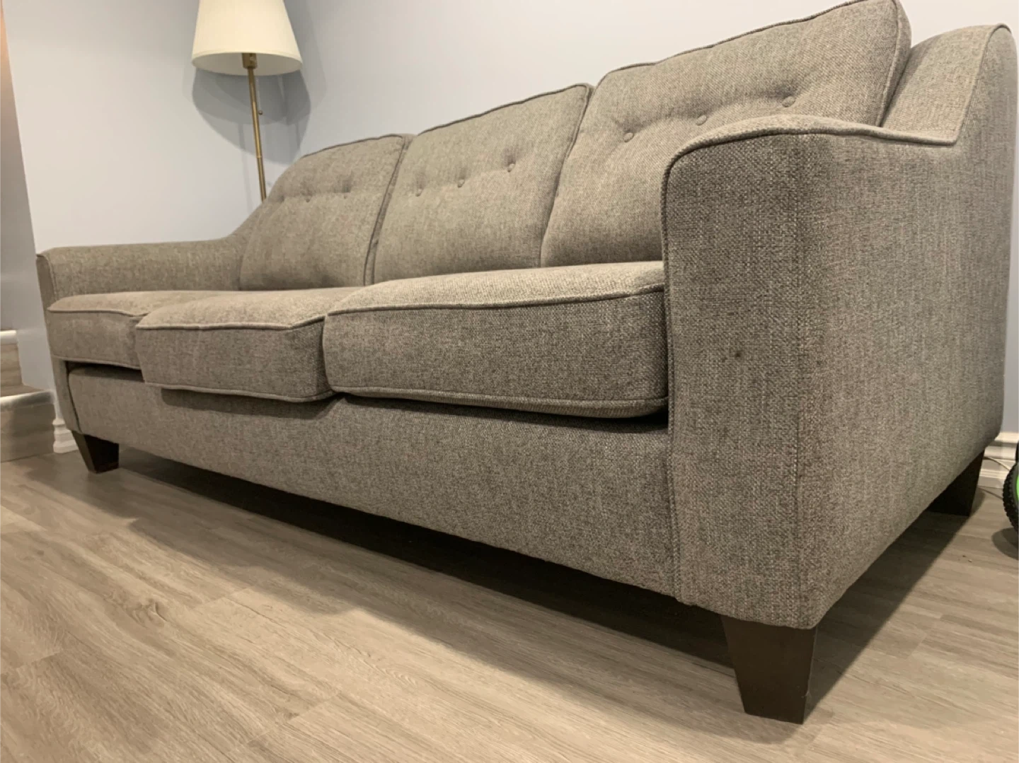 Selling a comfy grey three-seat sofa! It's in great shape and would look great in any living room or den. It is a stylish and comfortable piece of furniture. Originally from Leon’s sold for $1200
