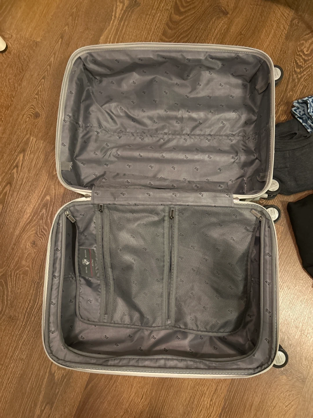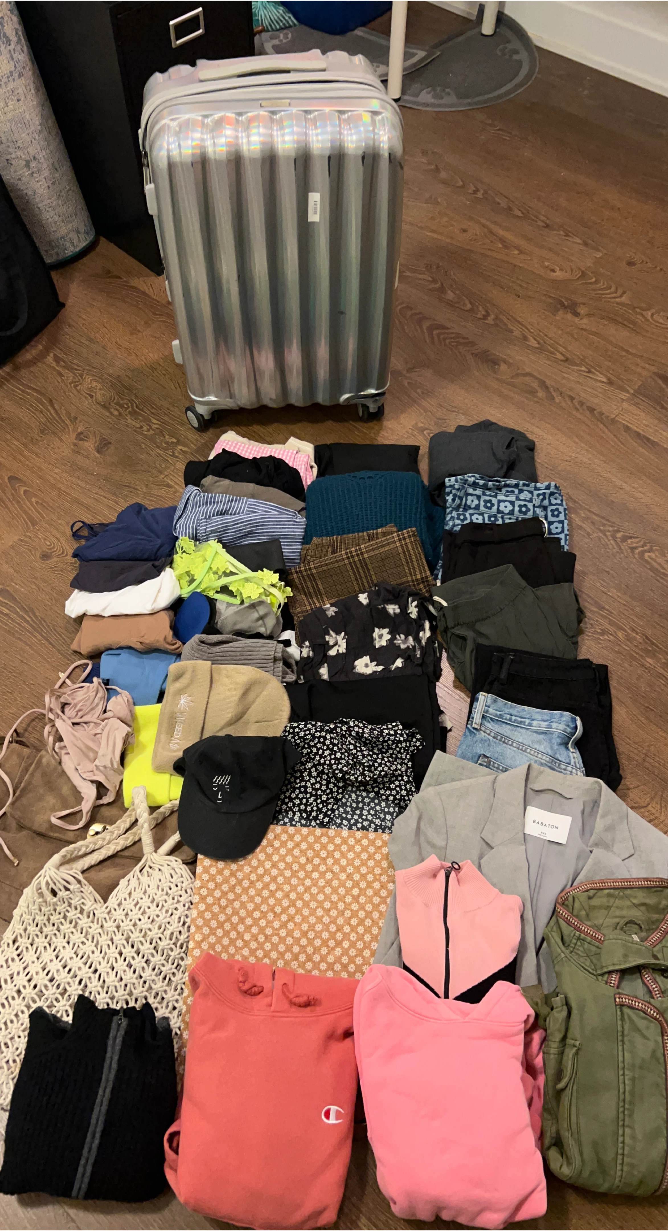 Items included arejackets, sweaters, hoodies, pants, jeans, shorts, skirts, dresses, tank tops, hats all inside the luggage