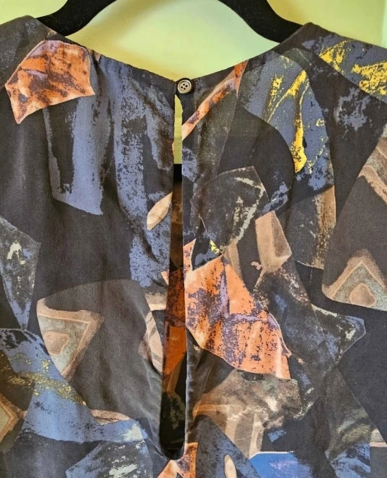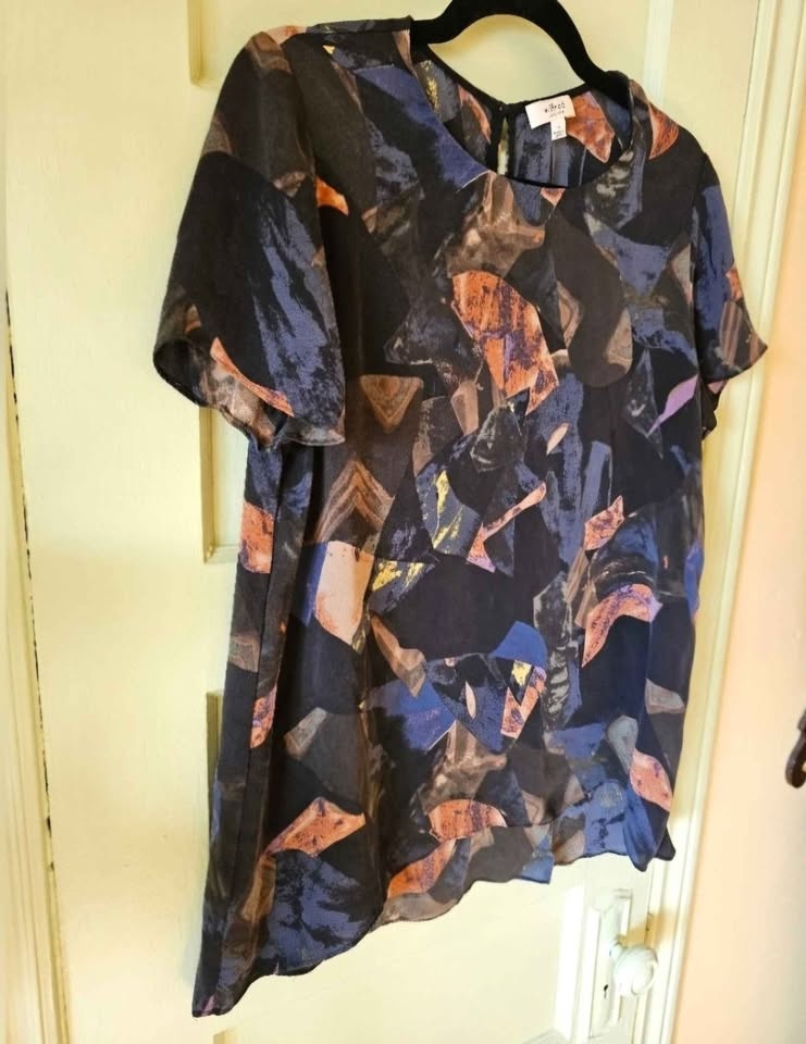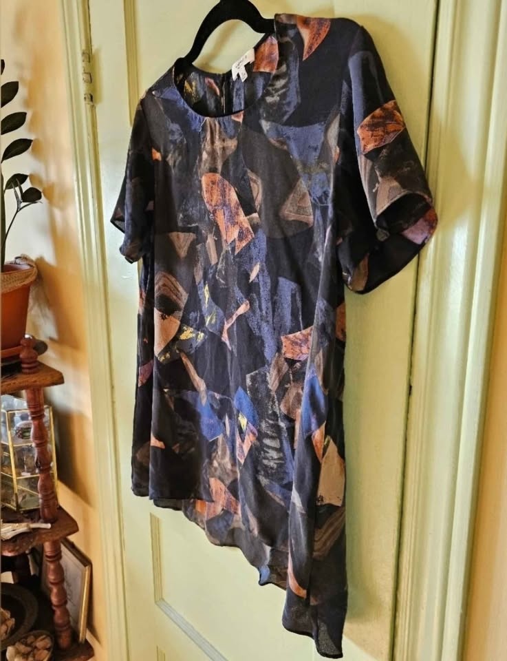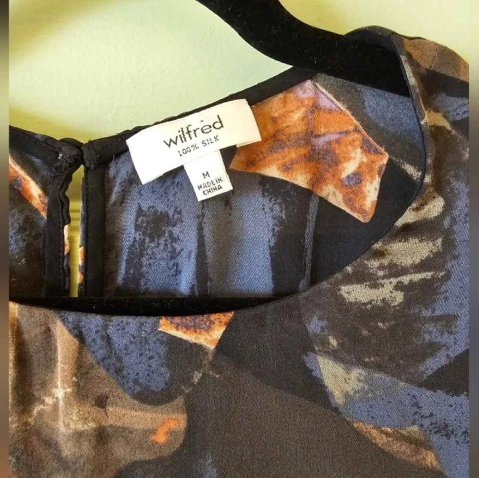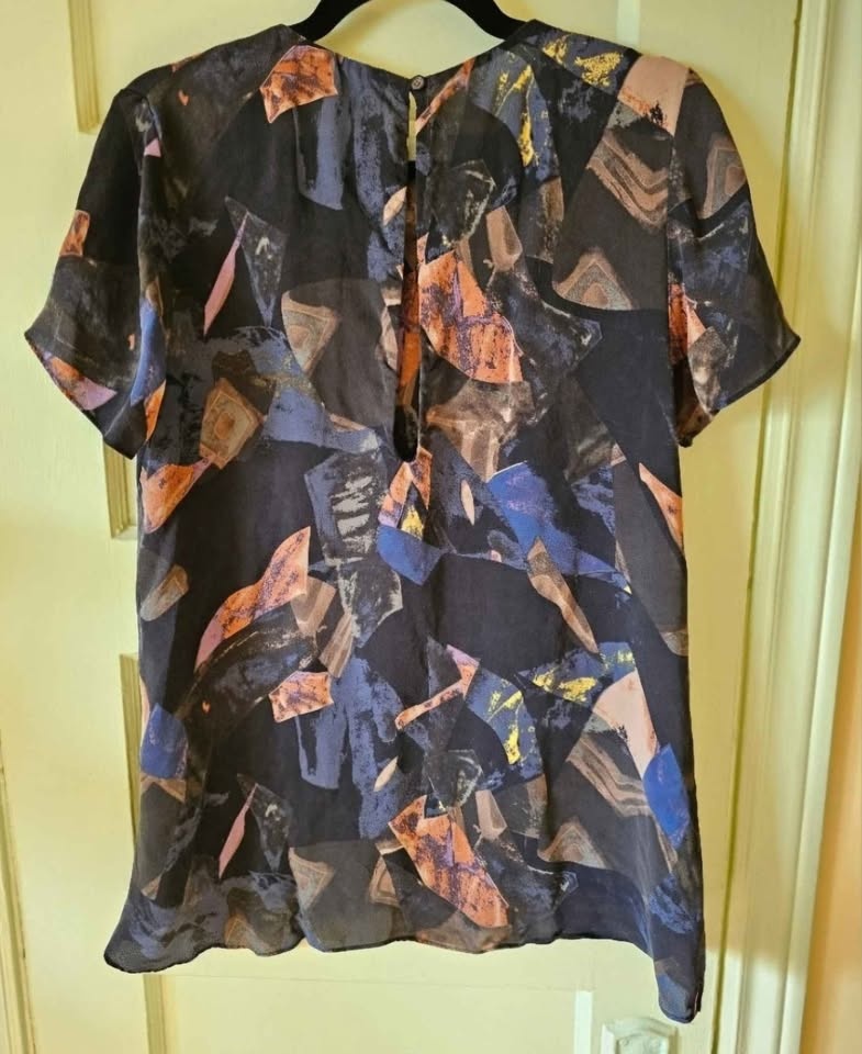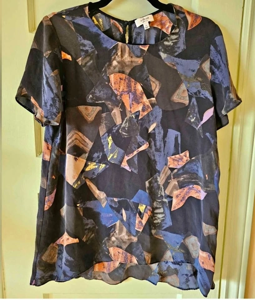 Lovely 100% silk top from Wilfred with an abstract geometric design in dark blue, black, rust, light brown, yellow and green. All colors are muted and fairly subdued. Top is in excellent used condition.