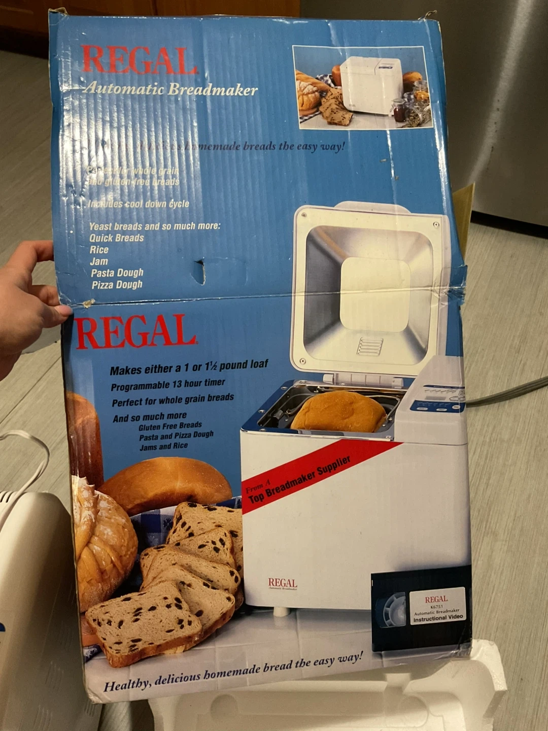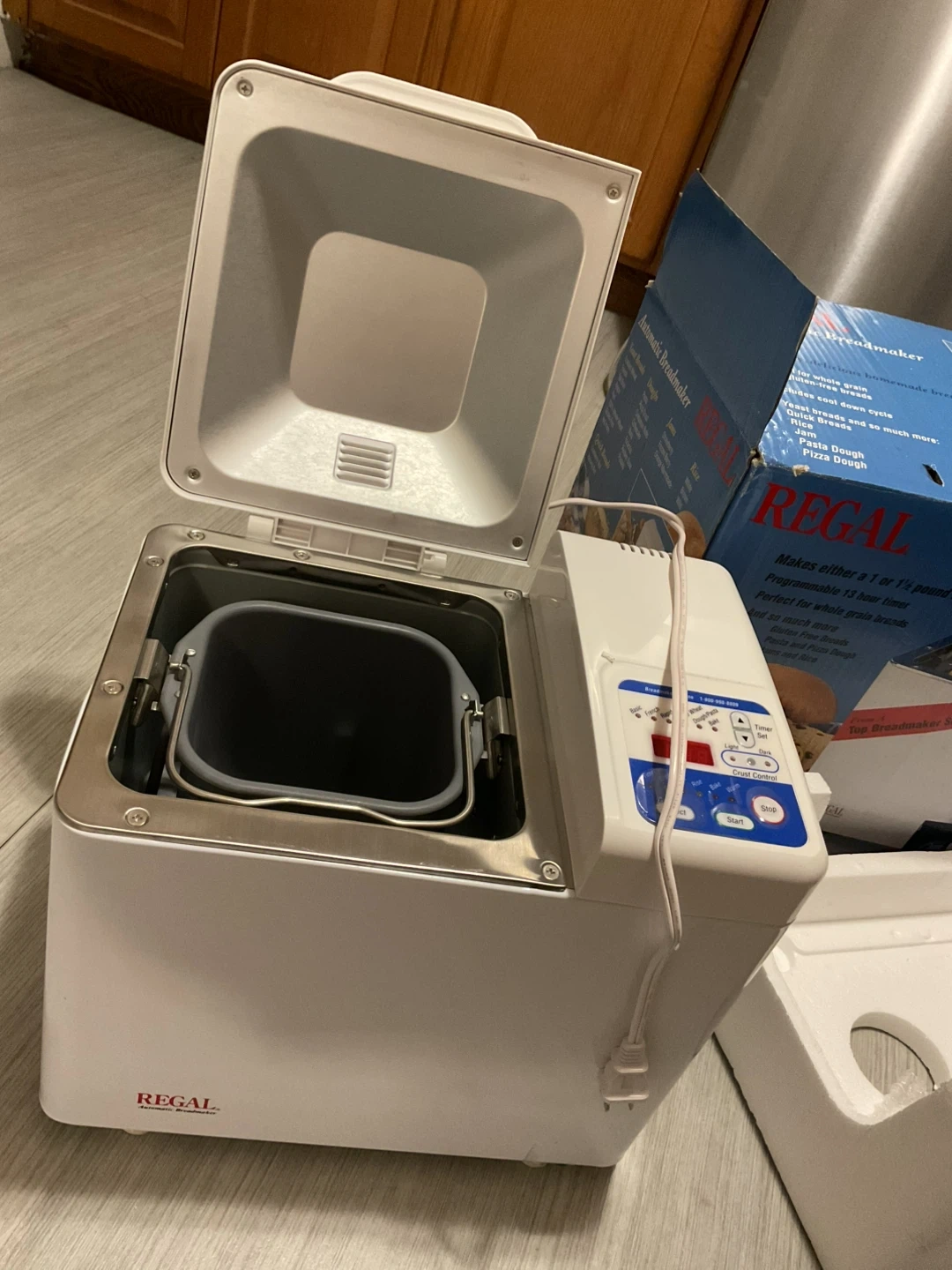 Get ready to bake some delicious homemade bread with this Regal Automatic Breadmaker! It makes either a 1 or 1 1/2 pound loaf. It's programmable with a 13-hour timer, perfect for whole grain breads, gluten-free breads, pasta dough, pizza dough, jams and rice! Includes a cool down cycle.