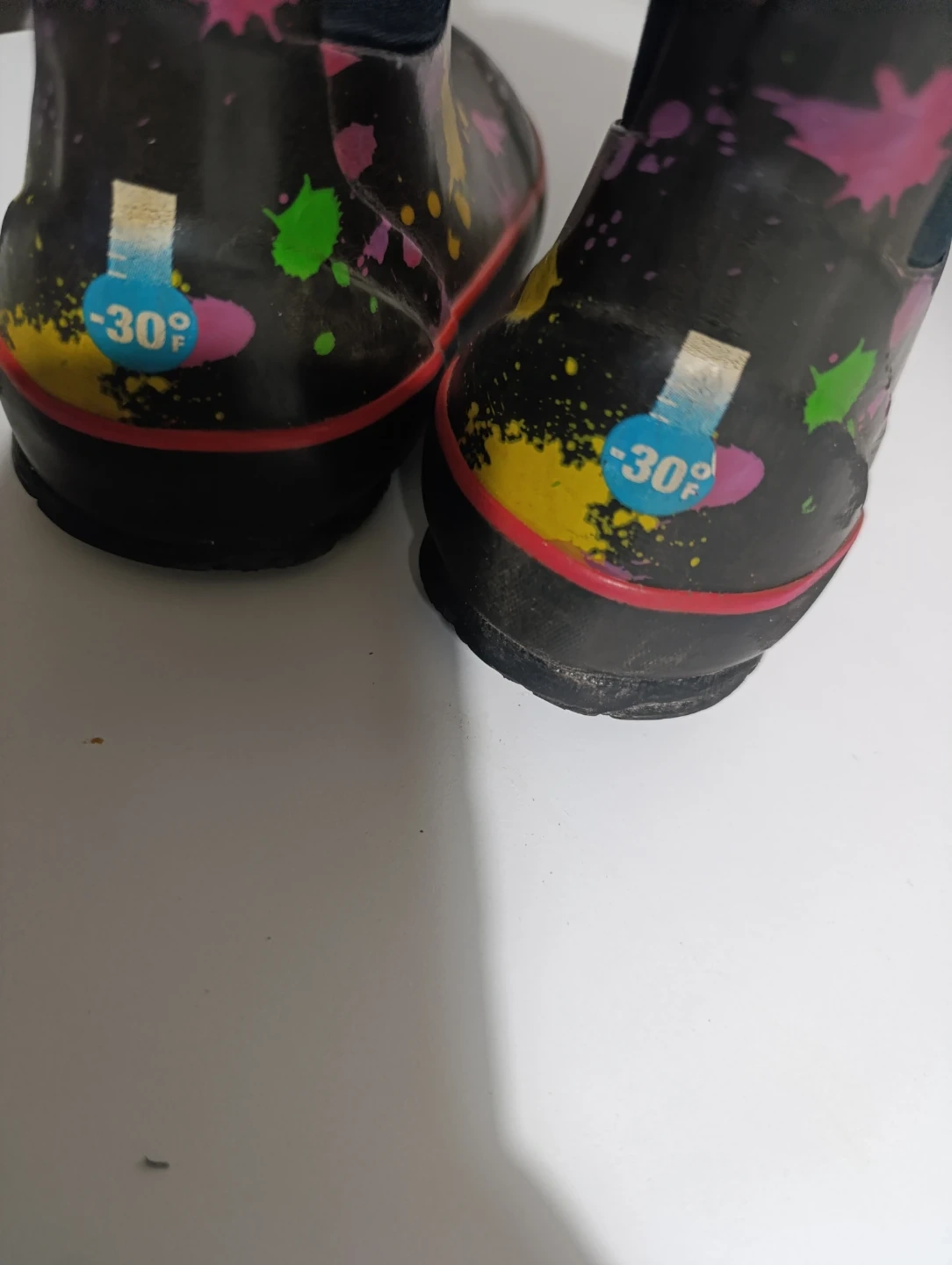 Cute pair of Bogs kids' winter boots that can also serve as rain boots. They're a size 11 and have a fun splatter paint design. These boots are durable, waterproof and ready for any weather!