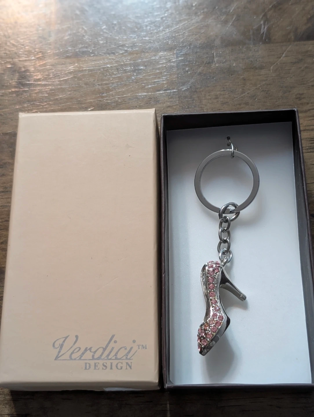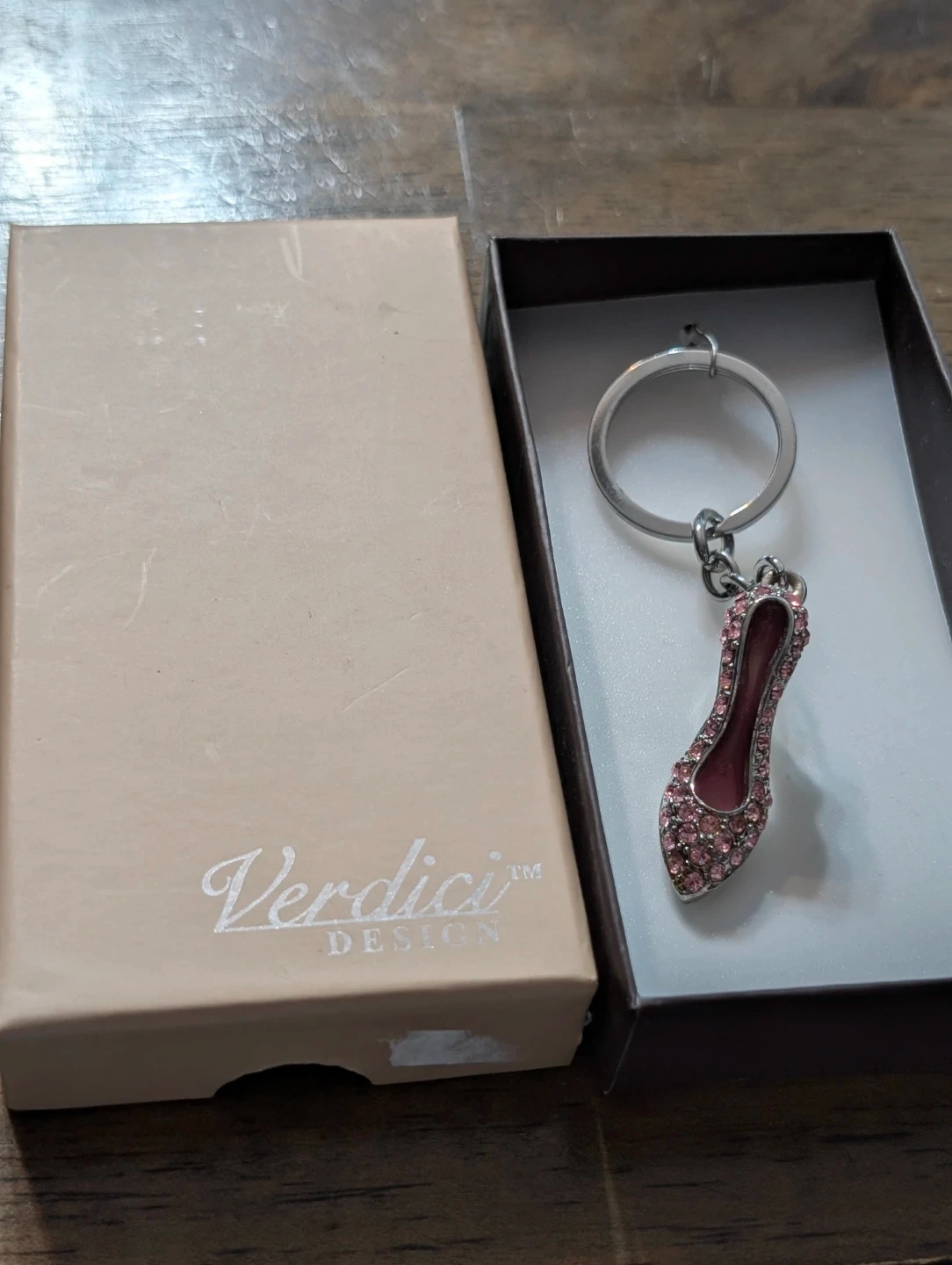 Here's a cute Verdici Design high heel keychain! It comes with its original box, making it perfect for gifting or collecting. The keychain features a sparkly, jeweled high heel charm. It's in great condition and ready to add some flair to your keys or bag