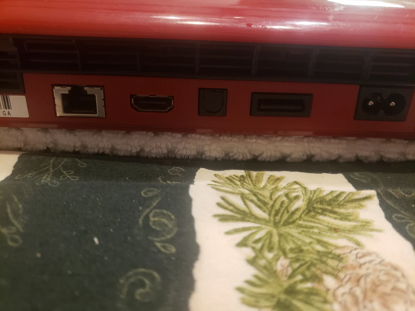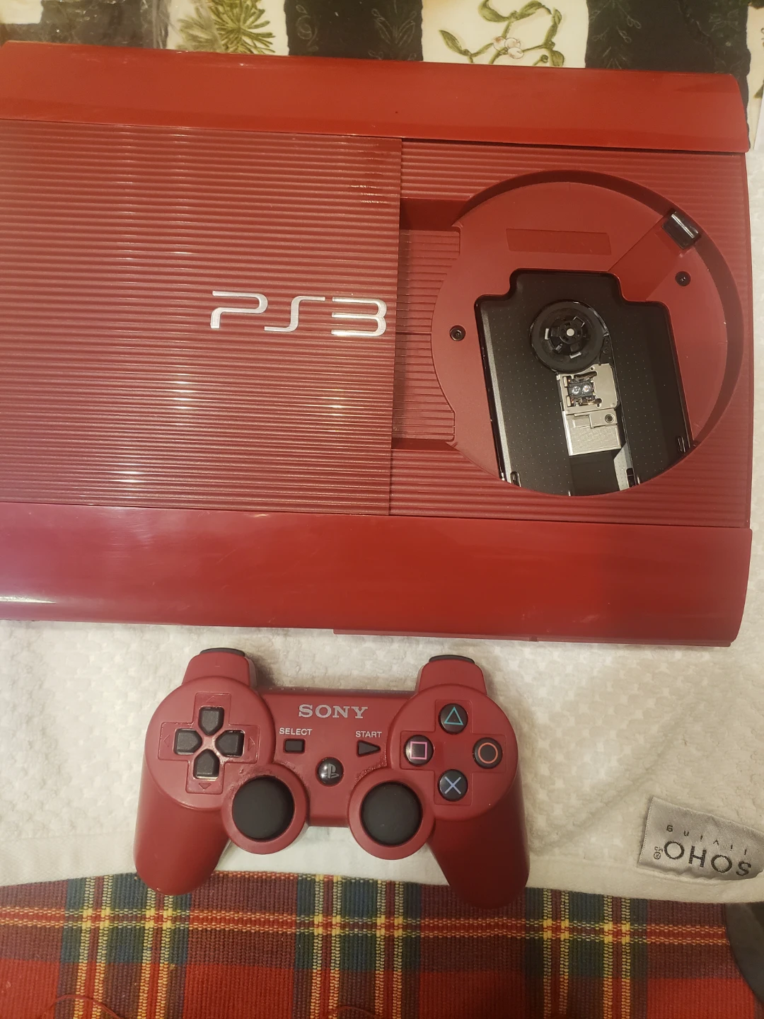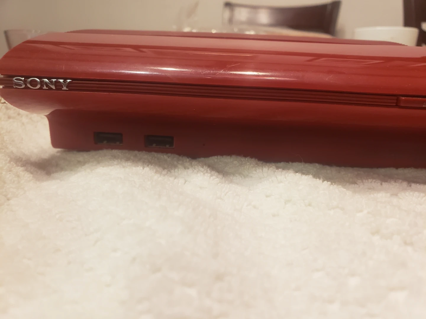 Selling a red Sony Playstation 3 (PS3). It comes with a matching red controller. There are some signs of wear, as shown in the pictures, but it's still in good working condition! Play station move shooting attachment.