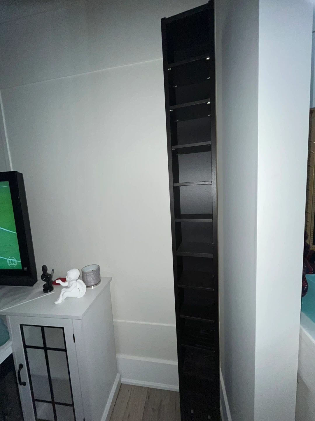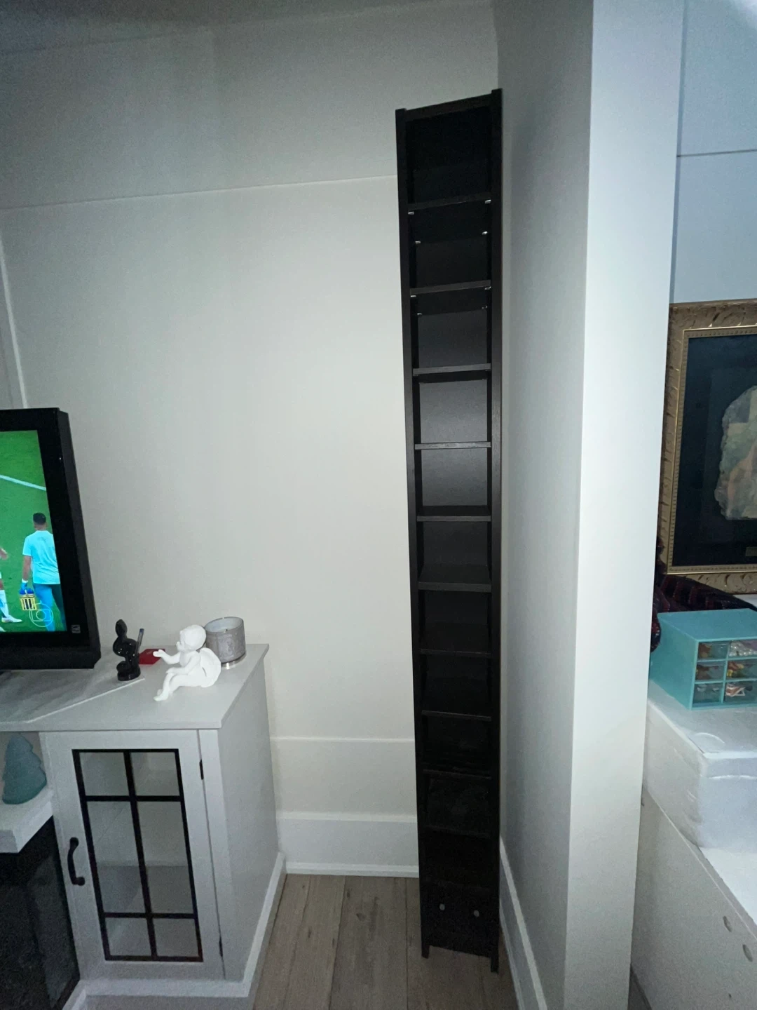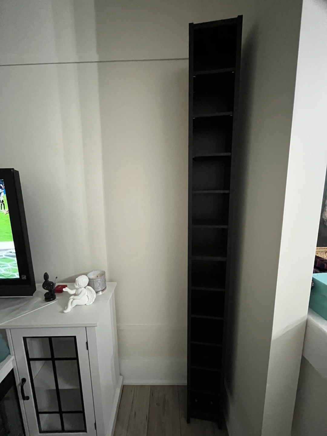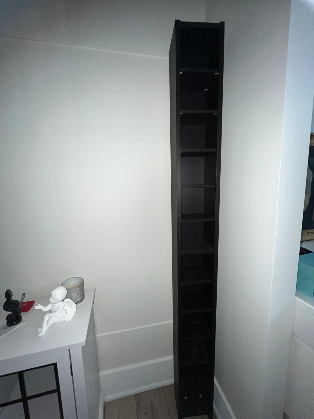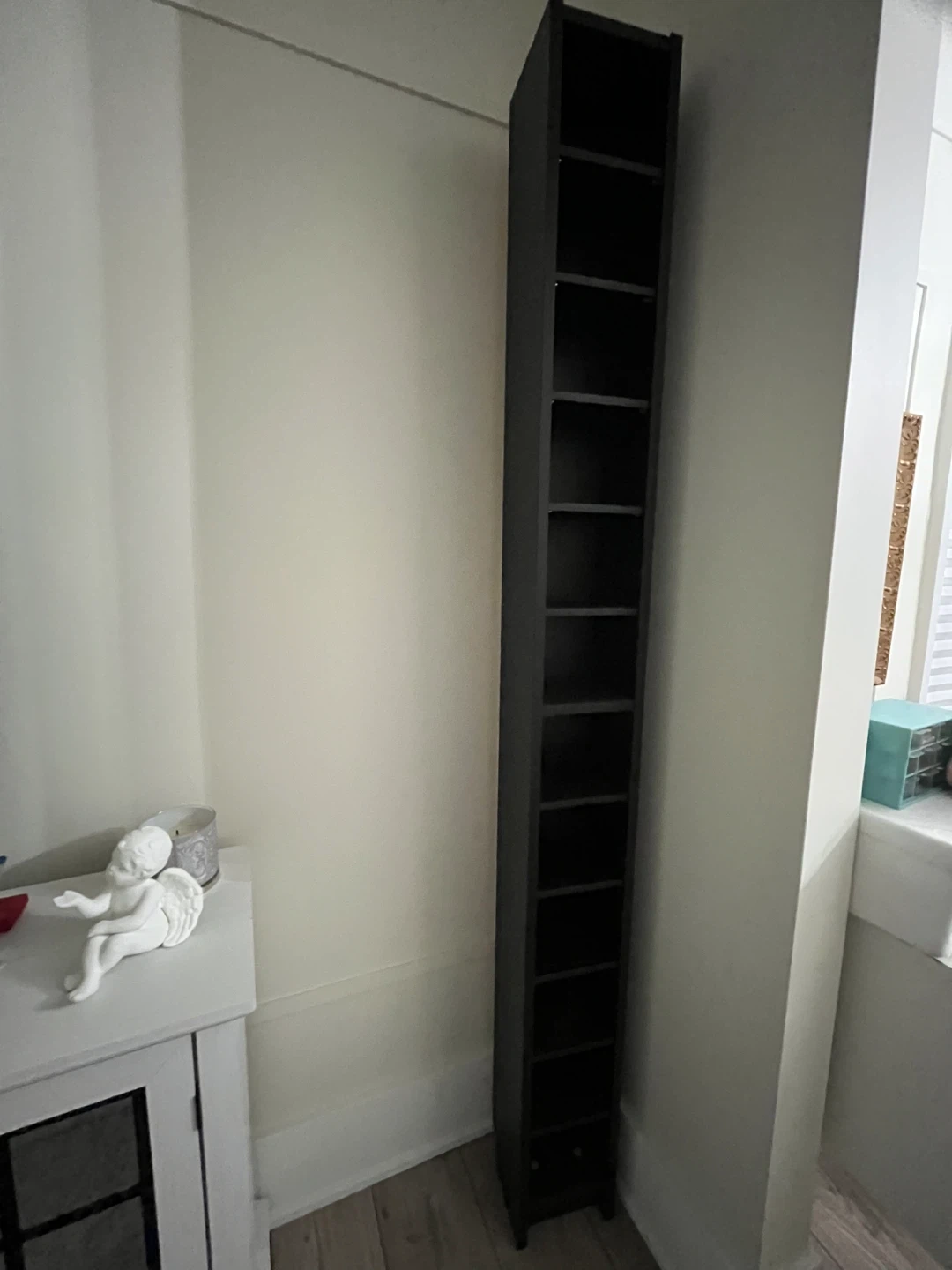 Selling a tall black tower shelf, perfect for storing DVDs, CDs, or other media/trinkets! It's in great shape and would fit nicely in any entertainment area or small space. I used this as a trinket shelf but no longer have space for this, otherwise, I love this shelf!