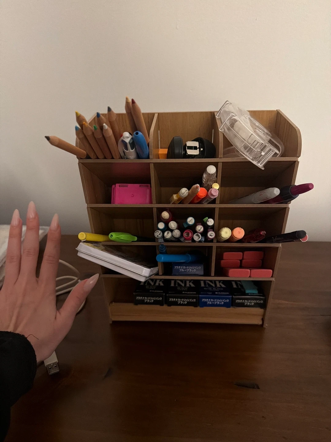 Here's a wooden desk organizer, perfect for keeping your pens, pencils, and other supplies neat and tidy! It has several compartments to help you sort everything out.