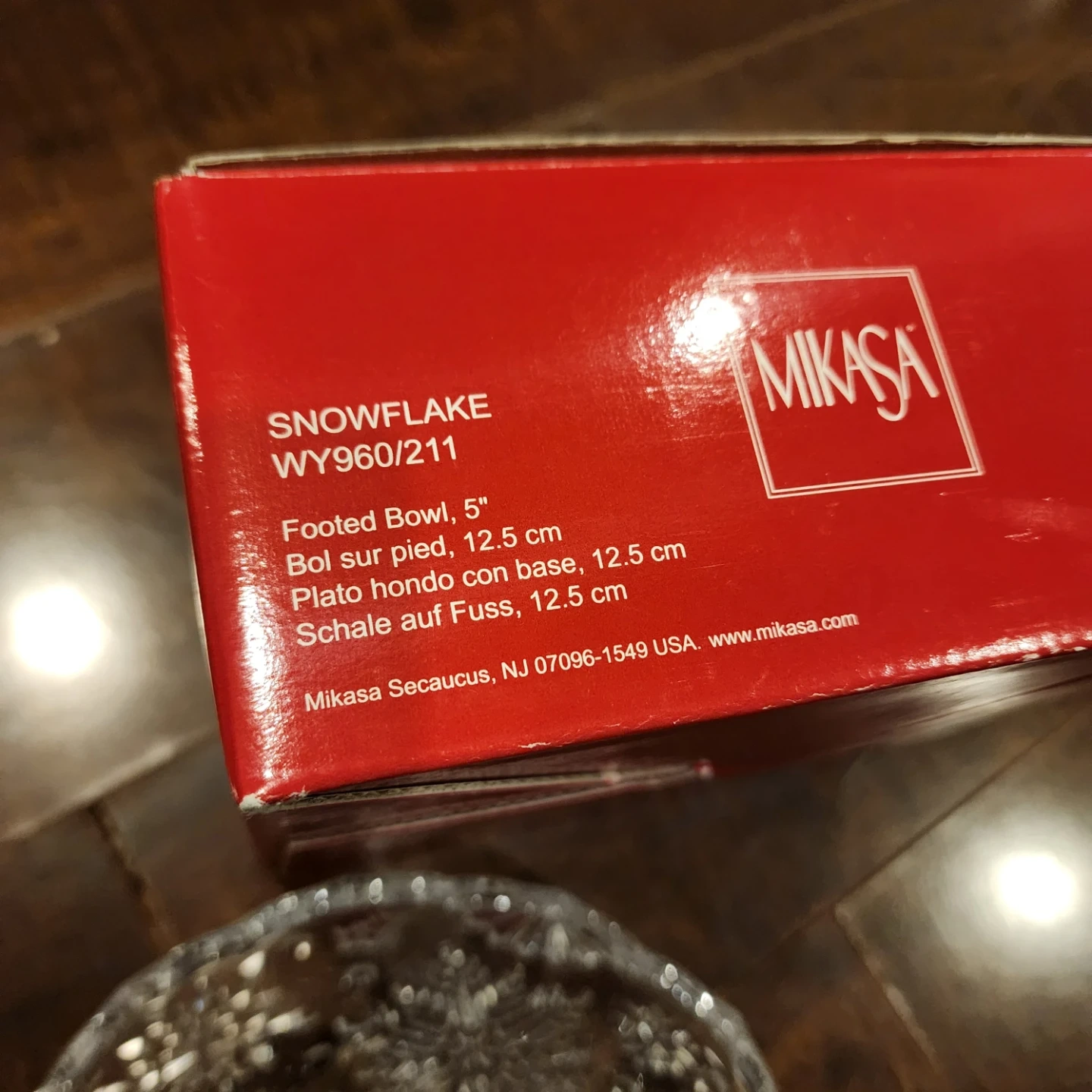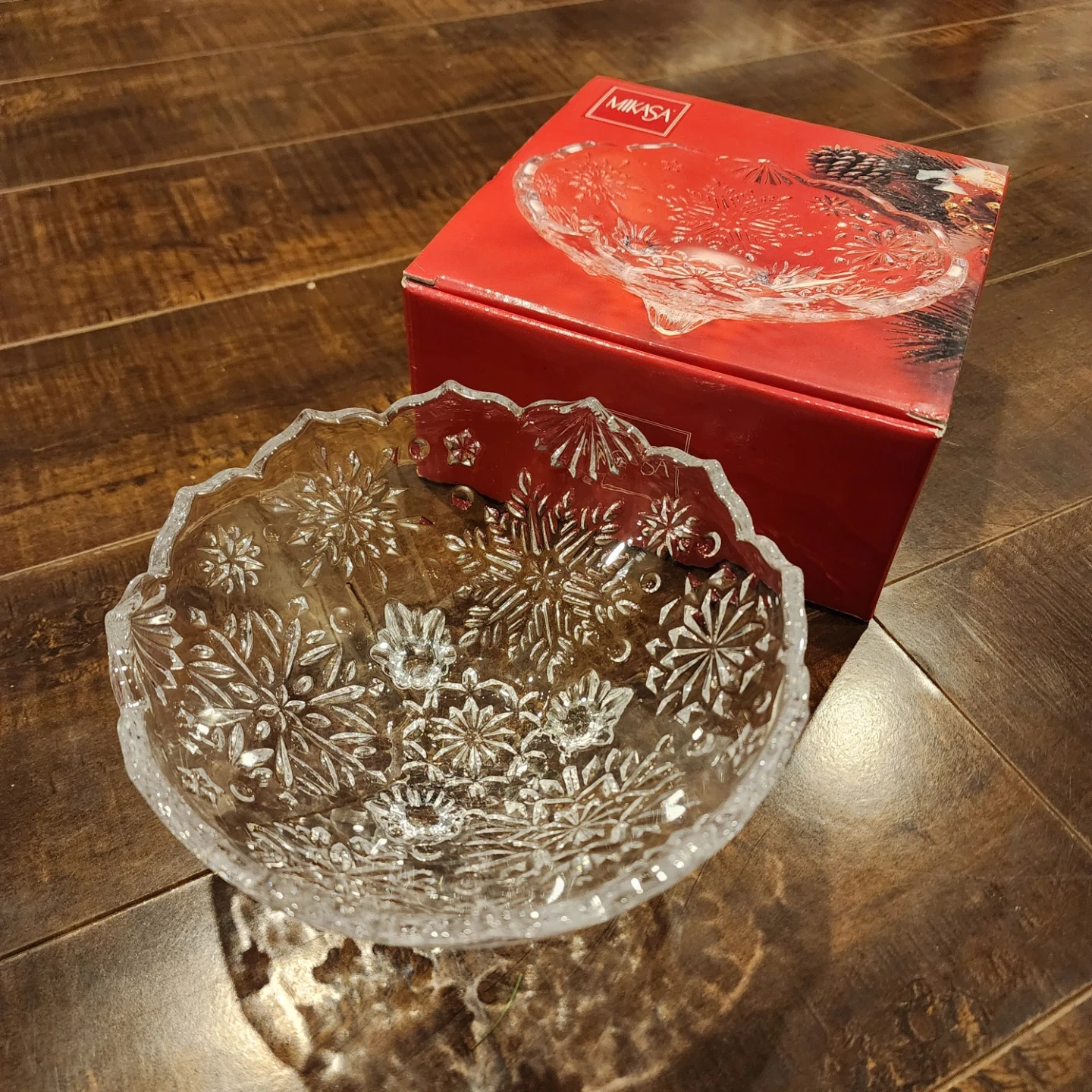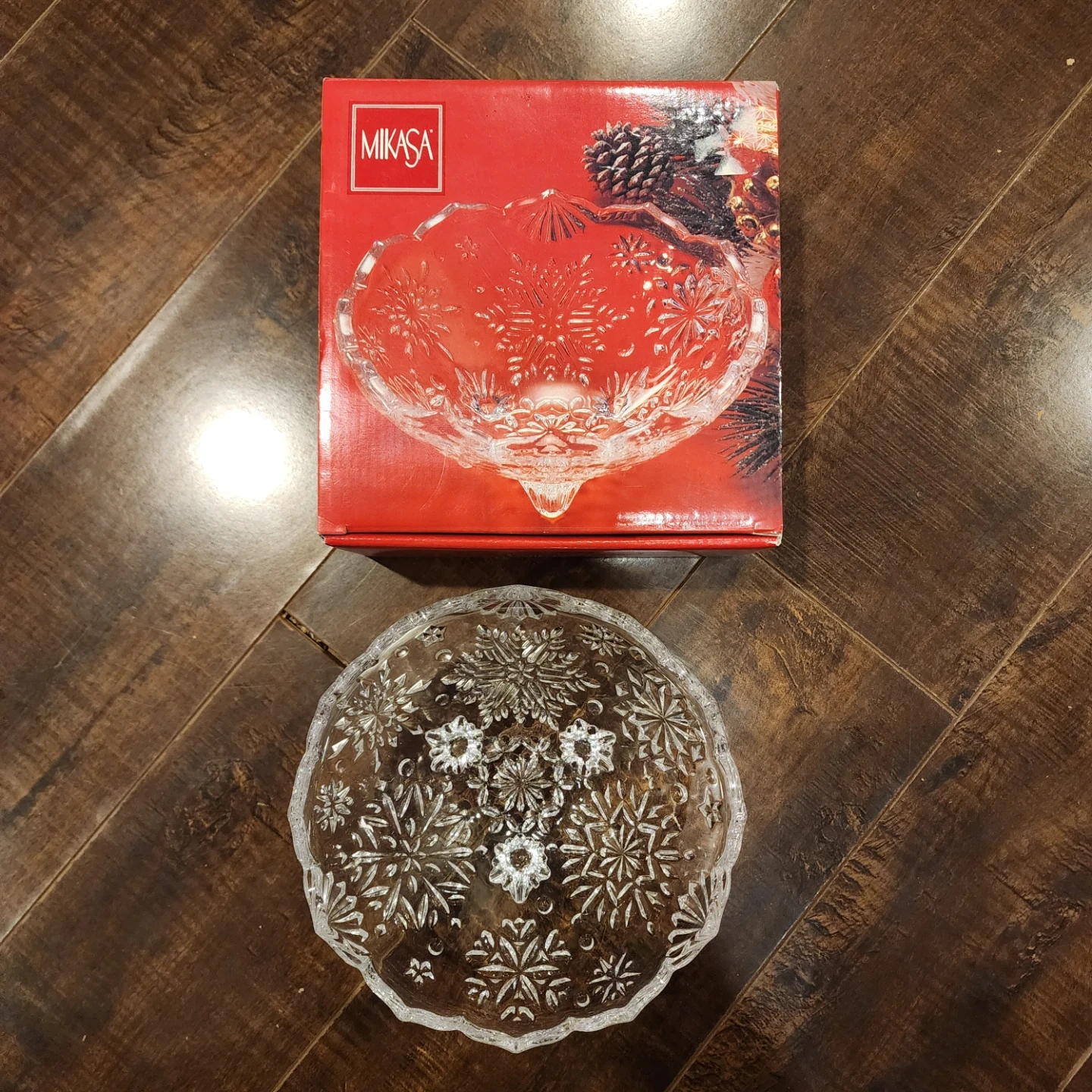 Selling a Mikasa Snowflake footed bowl! It's 5 inches in diameter and comes with the original box. The bowl features a beautiful snowflake design, perfect for adding a touch of elegance to your table setting or holiday decor