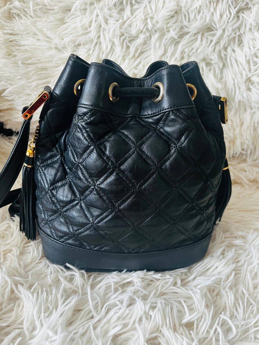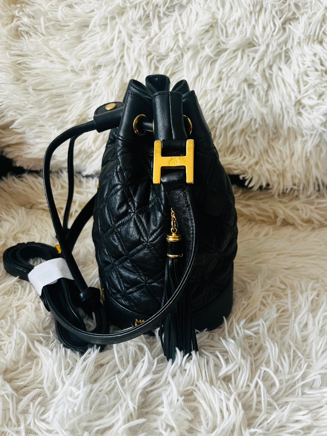 This is a stylish MCM quilted leather bucket bag in black. It features a drawstring closure and a detachable shoulder strap. The bag is in excellent condition and ready for a new owner!