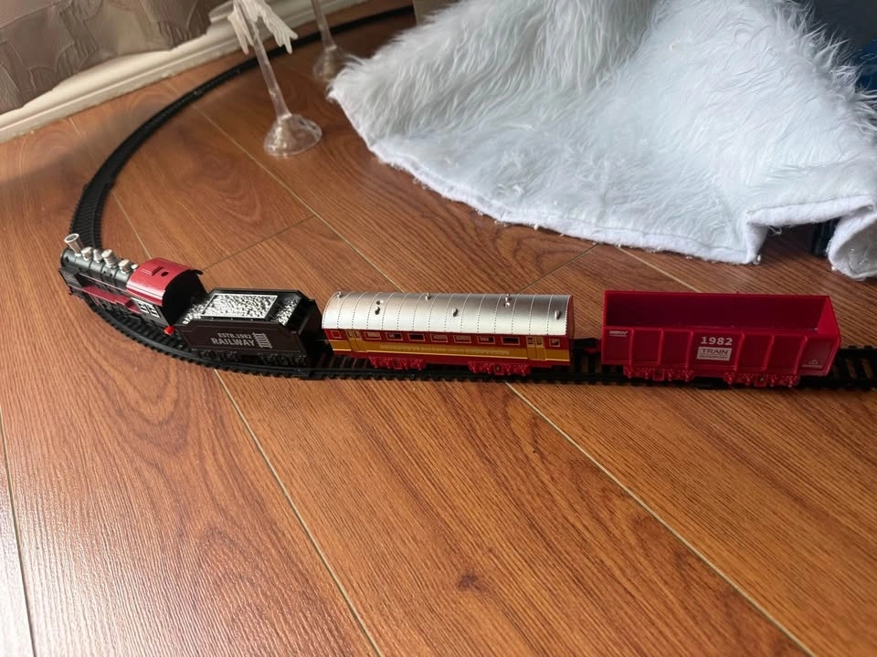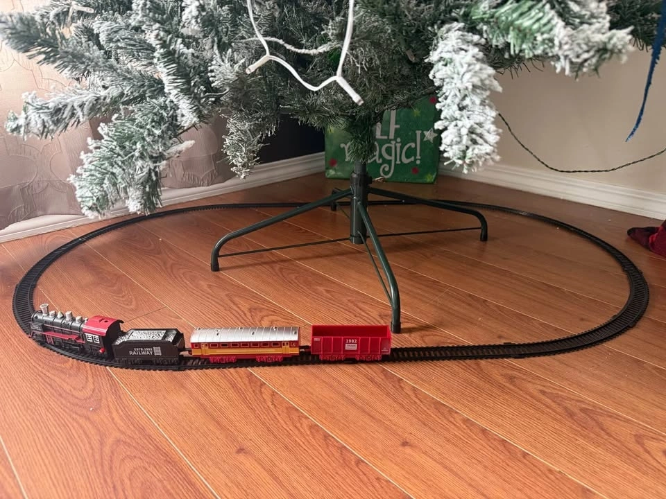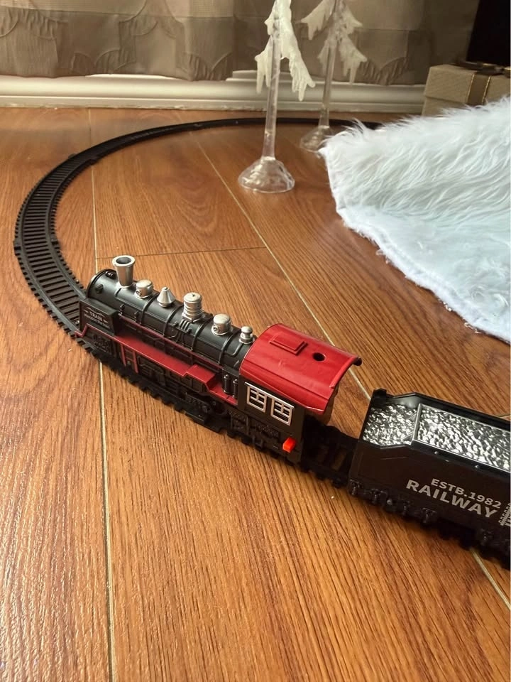 Used one season under the tree. This is an eBayjia Electric Sound and Light Train Set. Features a classic steam locomotive style. Includes a locomotive, coal car, and passenger coach. Designed for creative and free assembly of the railway tracks. Suitable for ages 3+.