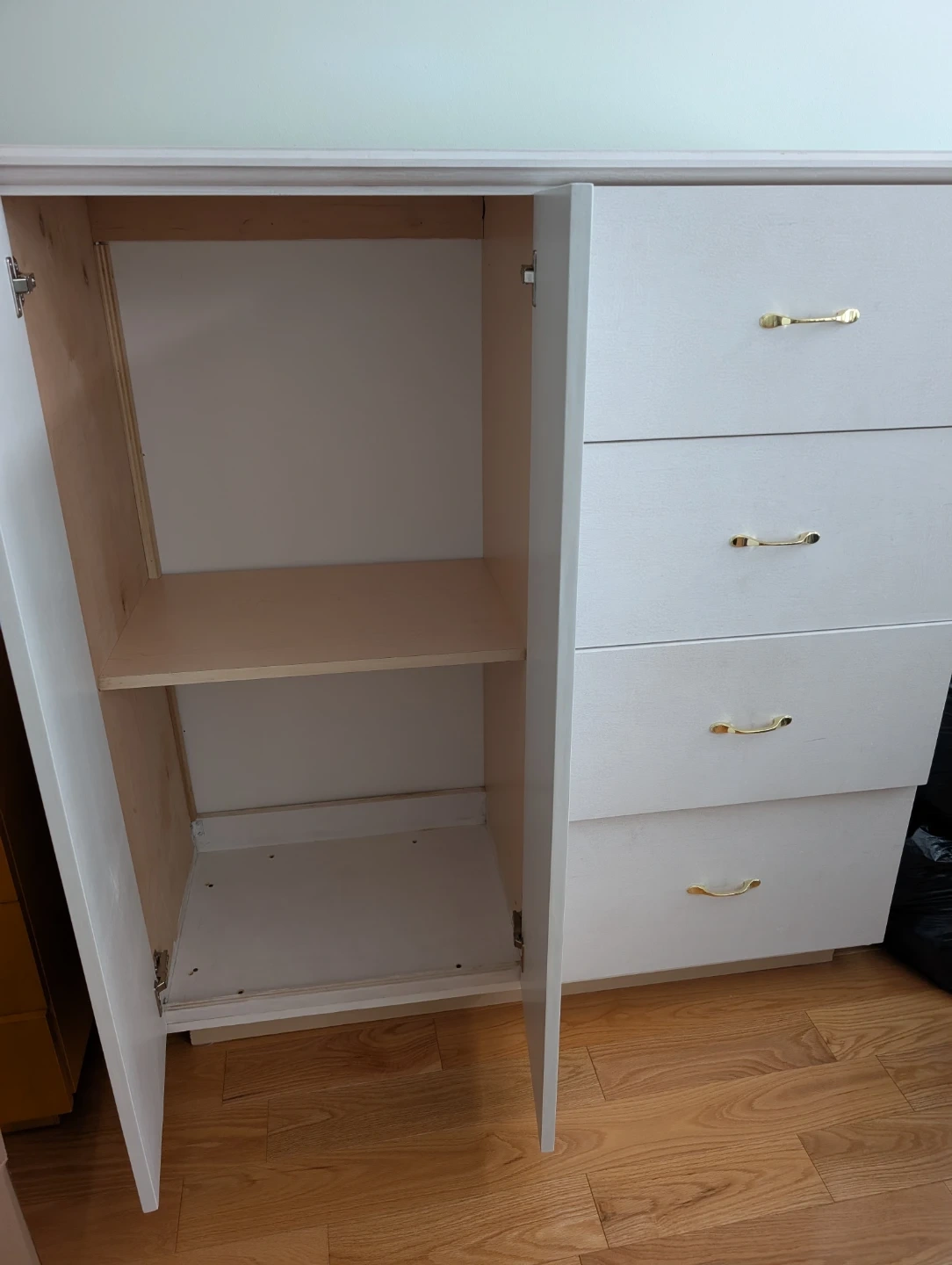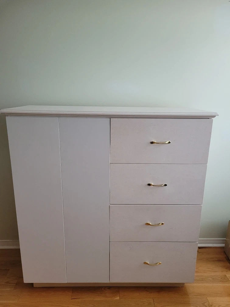 Selling a wardrobe with drawers. It's in great condition and ready for a new home. It features a cabinet area with shelving and four drawers for storage. Perfect for organizing your clothes and belongings!