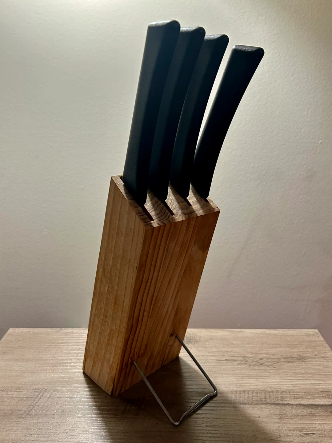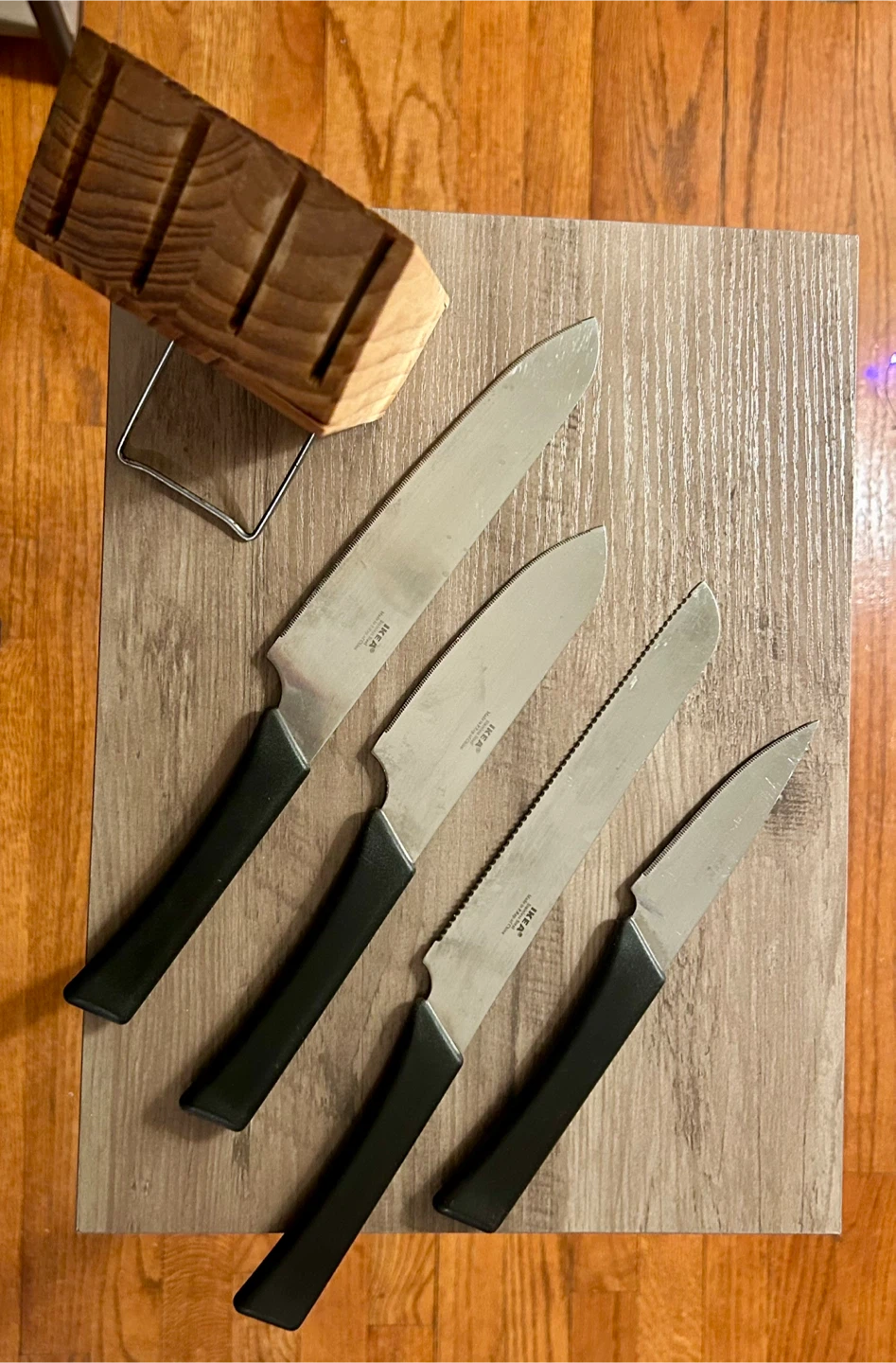 Giving away used IKEA knife set that includes a wooden block for storage. The set includes four knives with black handles. Perfect for everyday cooking needs!