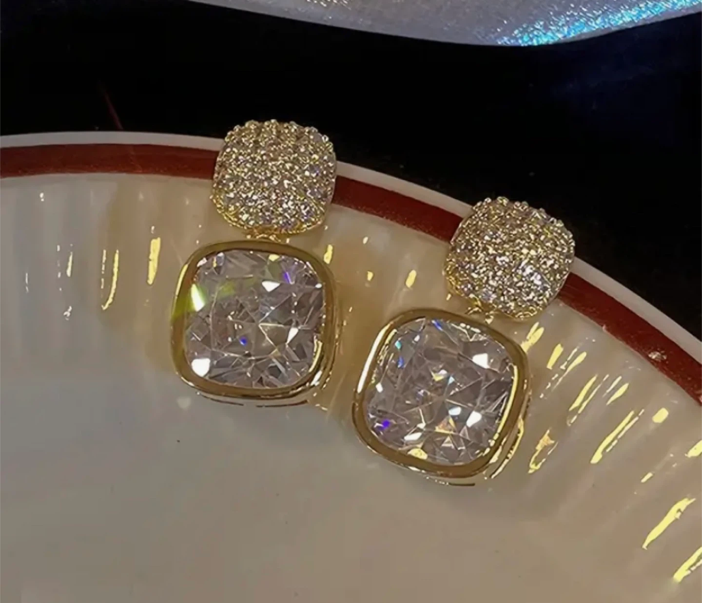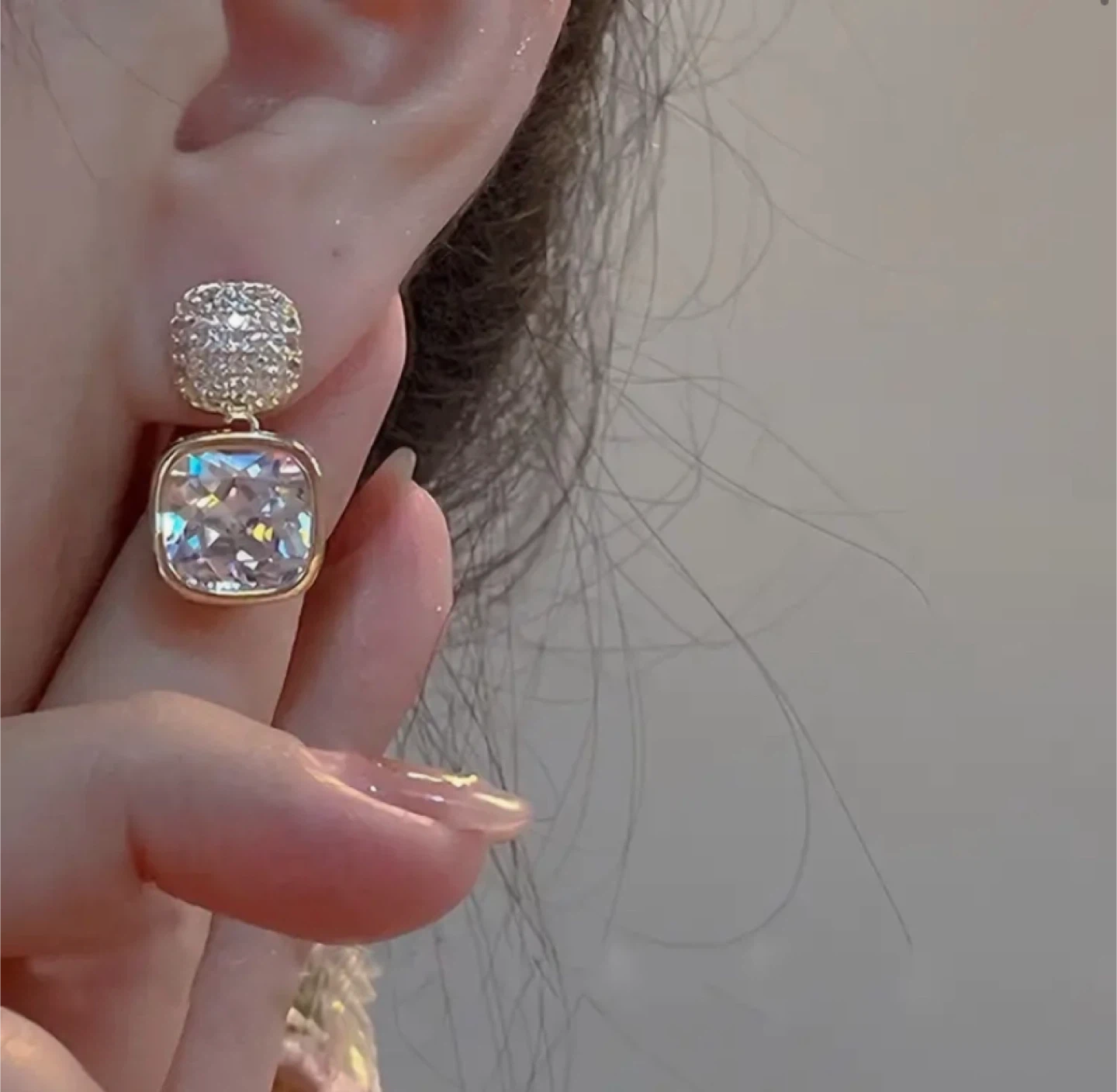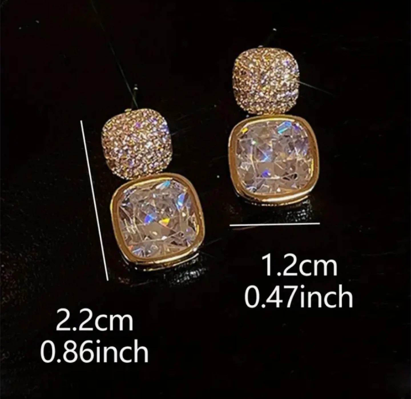 These are some really cute square drop earrings! They're about 2.2cm (0.86 inch) long and the crystal square is 1.2cm (0.47 inch) wide