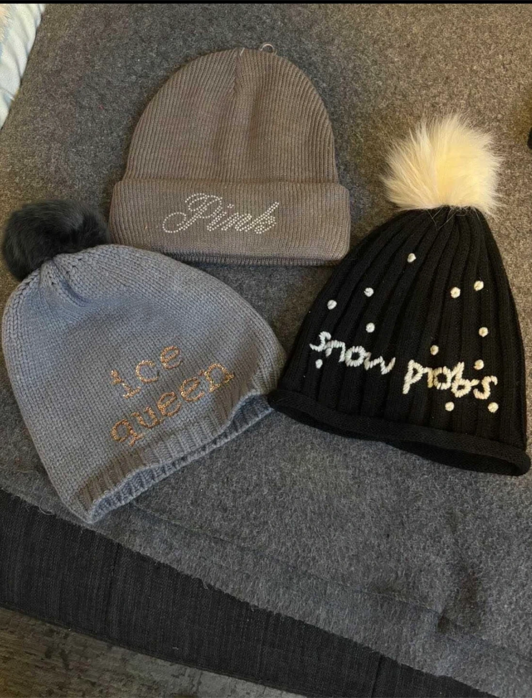 Selling a set of three winter beanies! One is a grey 'Pink' beanie, another is a light grey 'Ice Queen' beanie, and the last is a black 'Snow probs' beanie. They're all in great condition and ready to keep you warm this winter