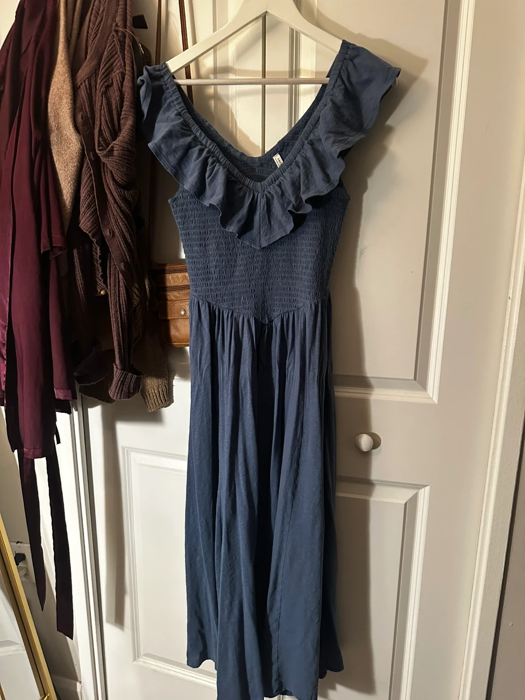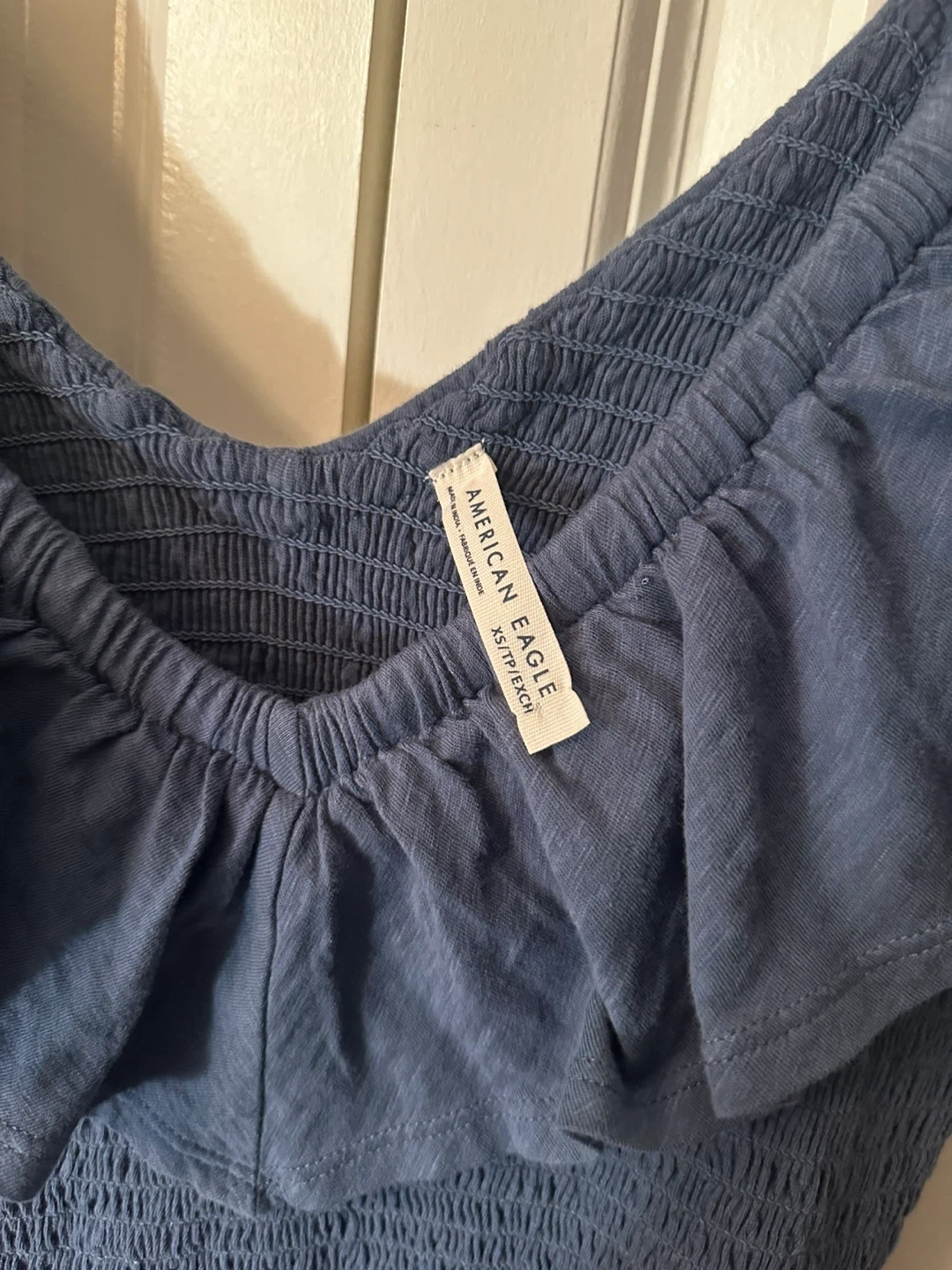 Selling a cute American Eagle dress in size XS. It's a lovely blue color and features a smocked bodice and ruffle detailing.