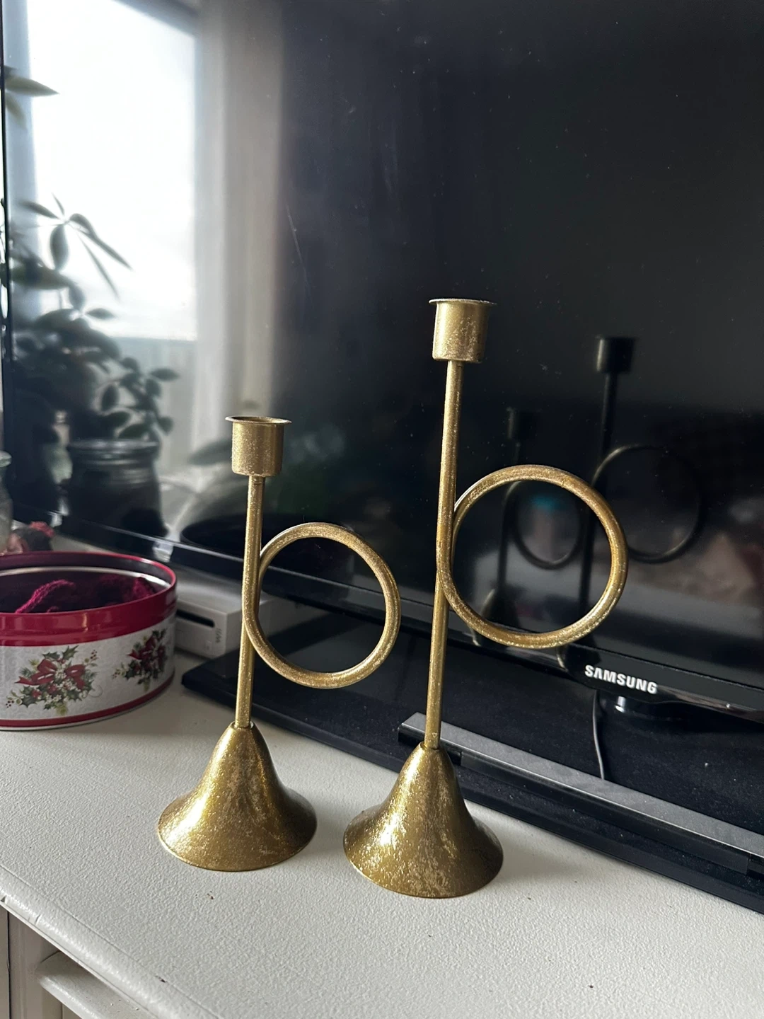 Selling a set of two gold-colored metal candlestick holders. They have a unique, modern design that would look great in any room. Perfect for adding a touch of elegance to your home decor!