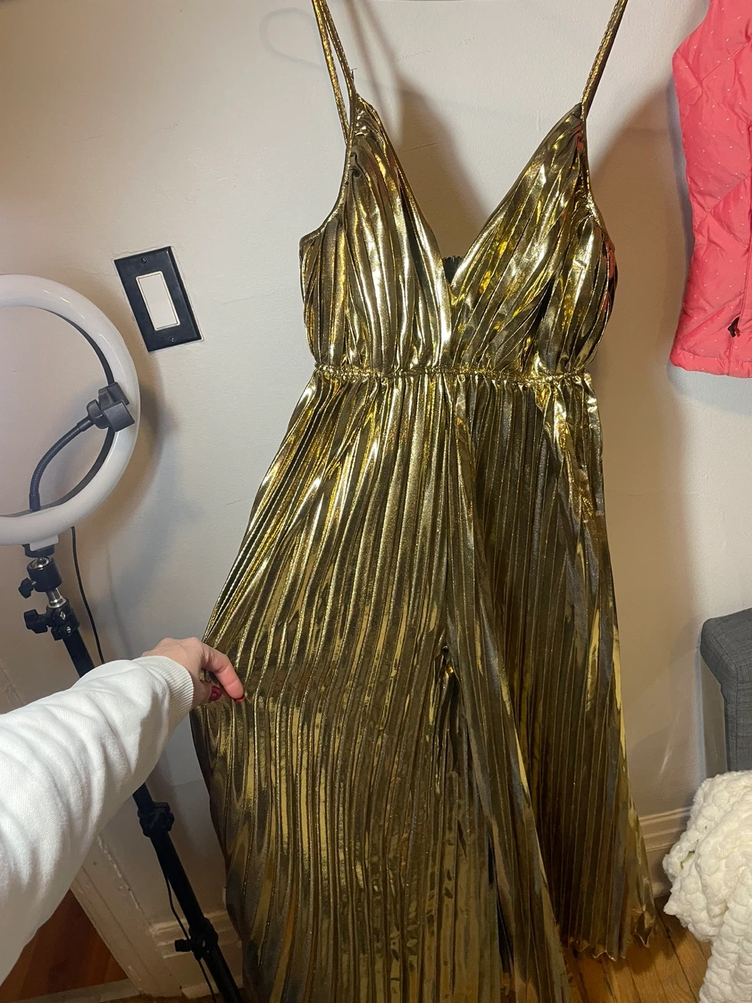 Selling a stunning gold jumpsuit from Nice To Meet You! It's a size medium and in great condition. The pleated texture catches the light beautifully, making it perfect for a night out or a special occasion. It's a real showstopper!