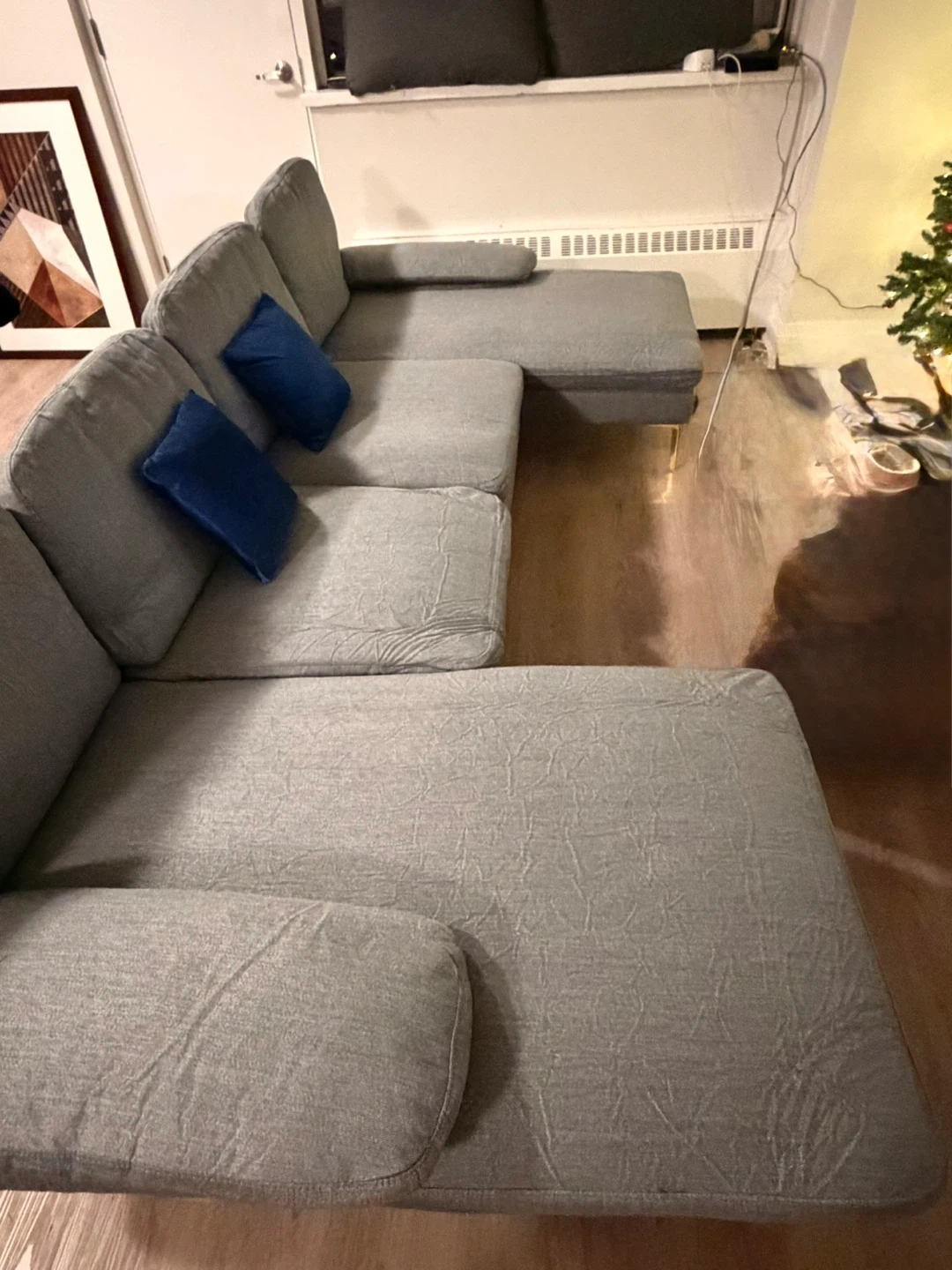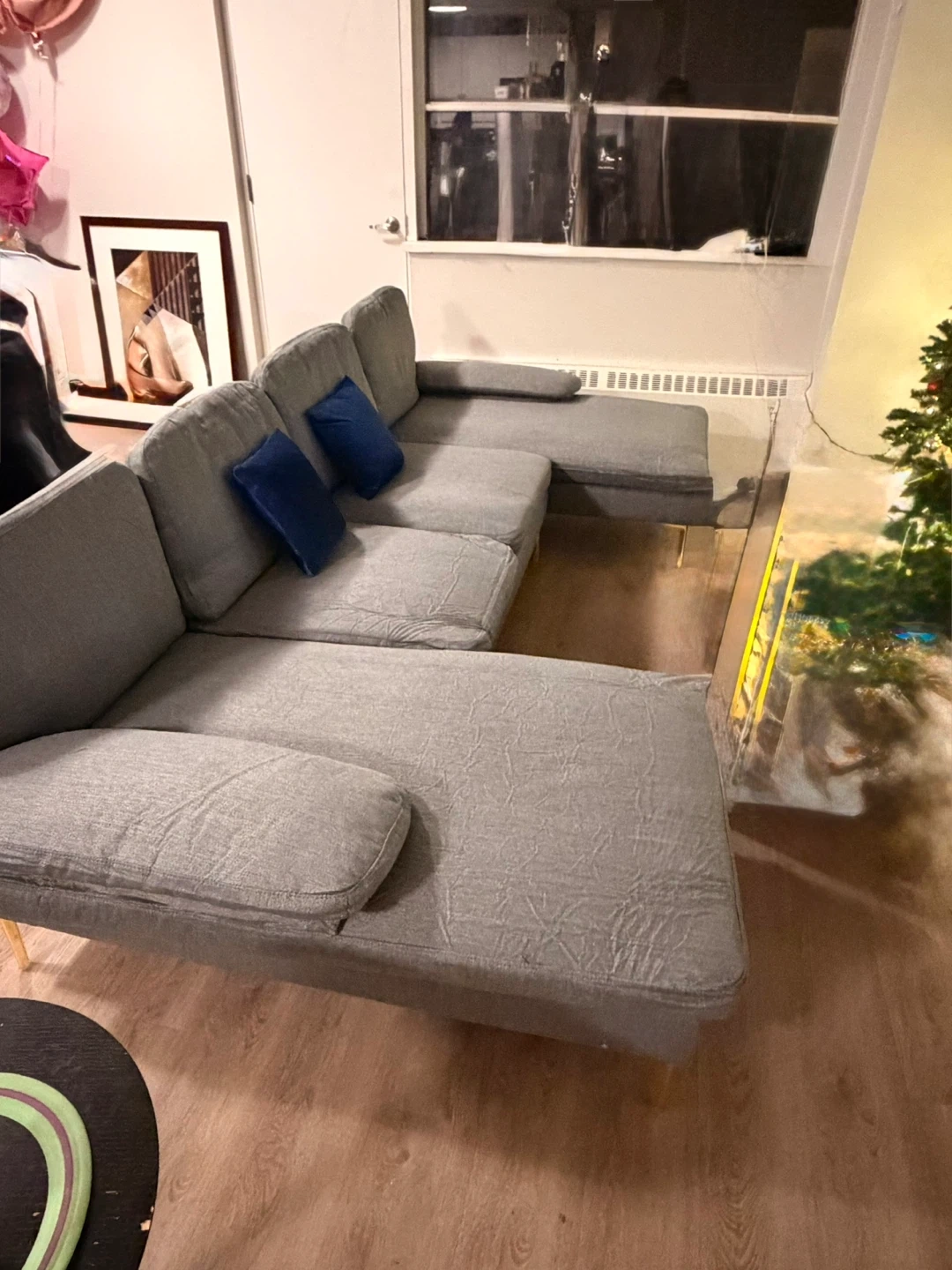 Selling a comfy grey sectional sofa. It's in great shape and ready for a new home! The sofa is a stylish addition to any living space. We just opened it yesterday! It does not work with our centre table.