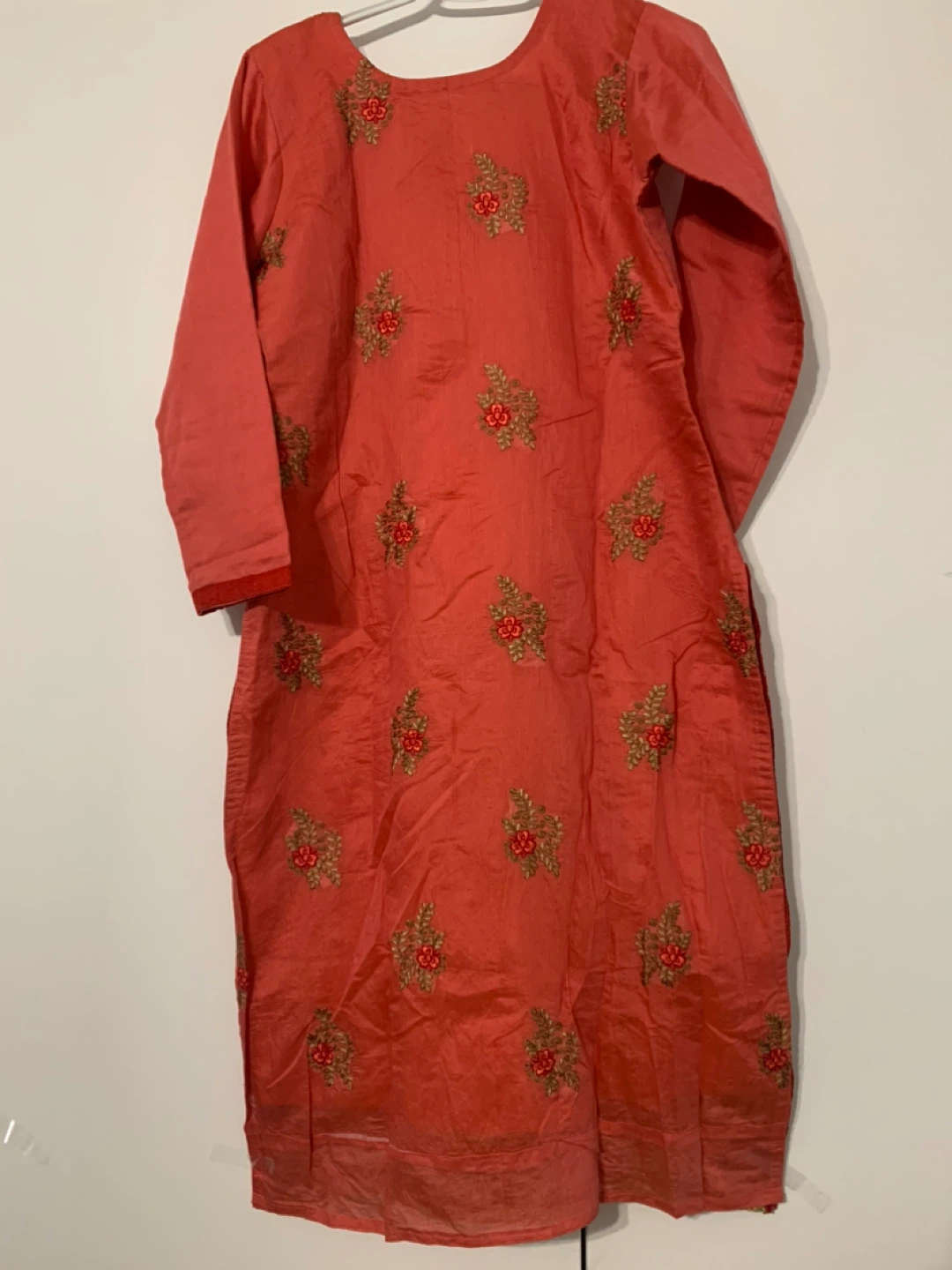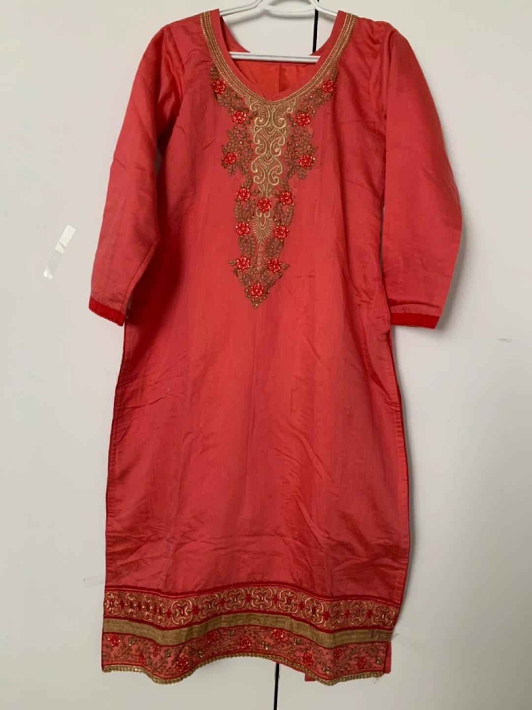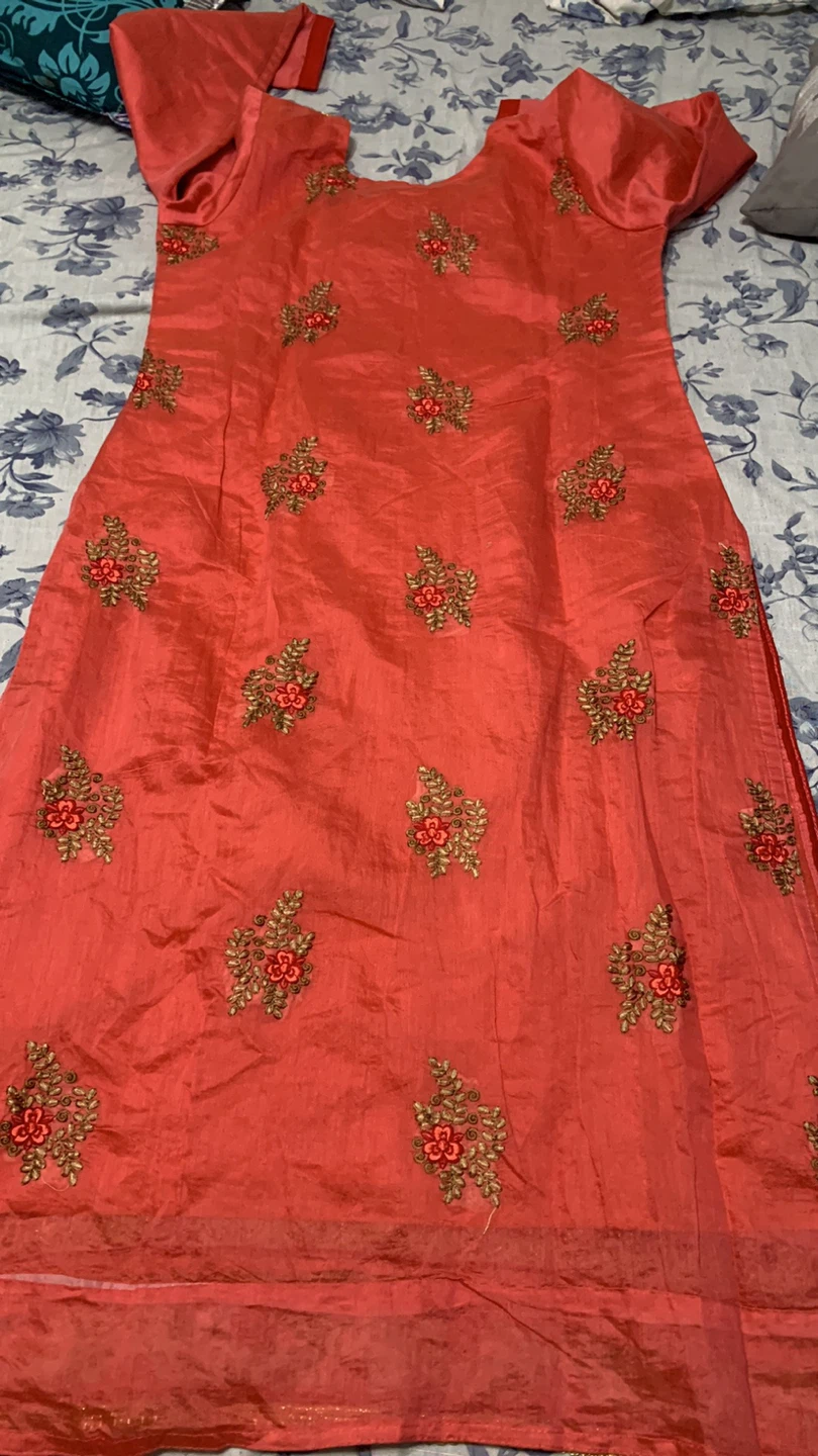 Here's a coral-coloured kurti dress with beautiful embroidery. The material feels like silk. It's in good condition and ready for a new wardrobe! It comes with nice big dupatta and shalwar
