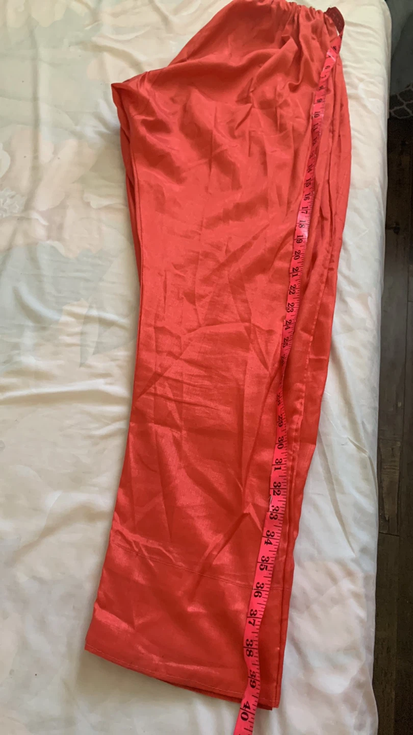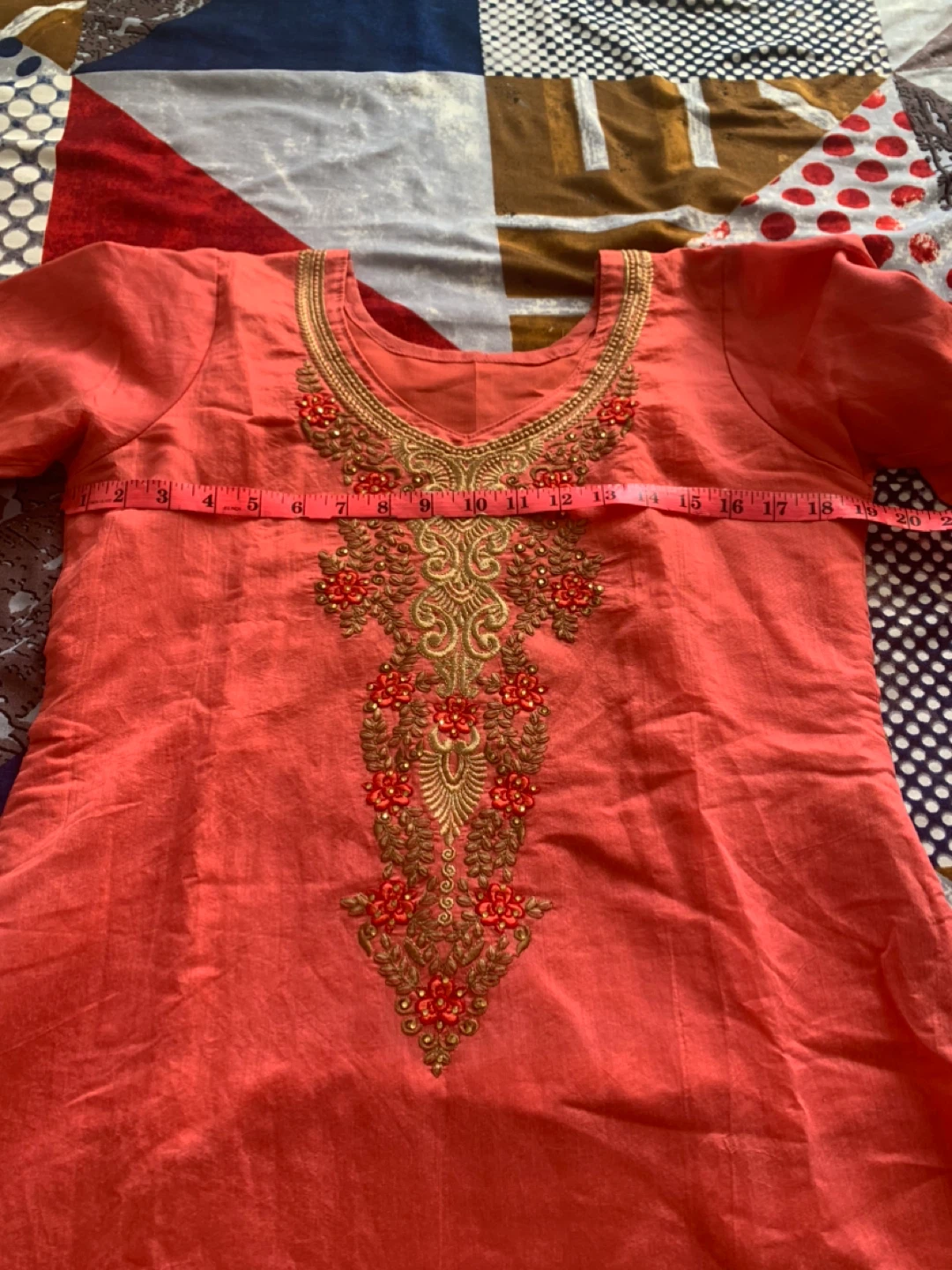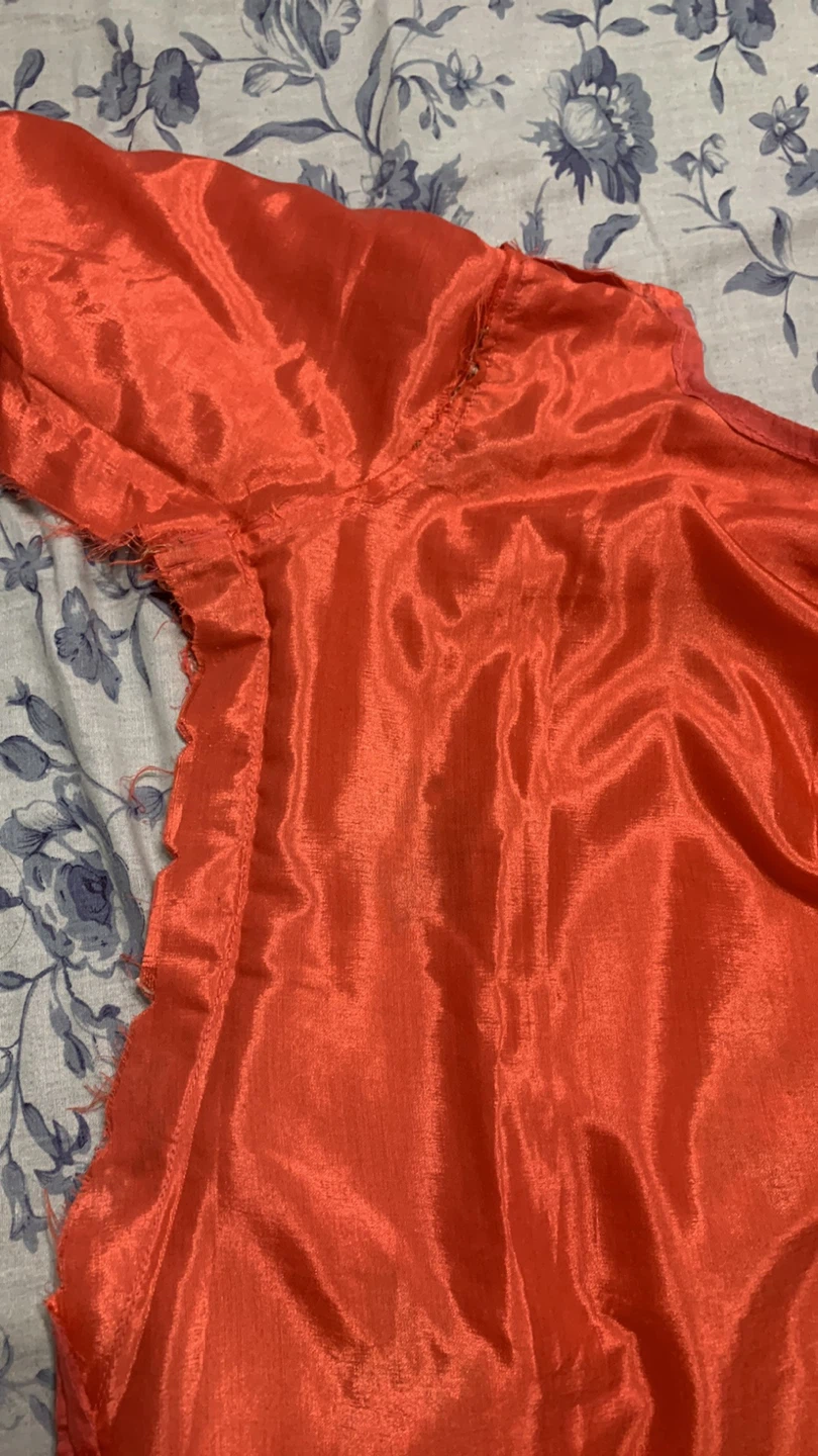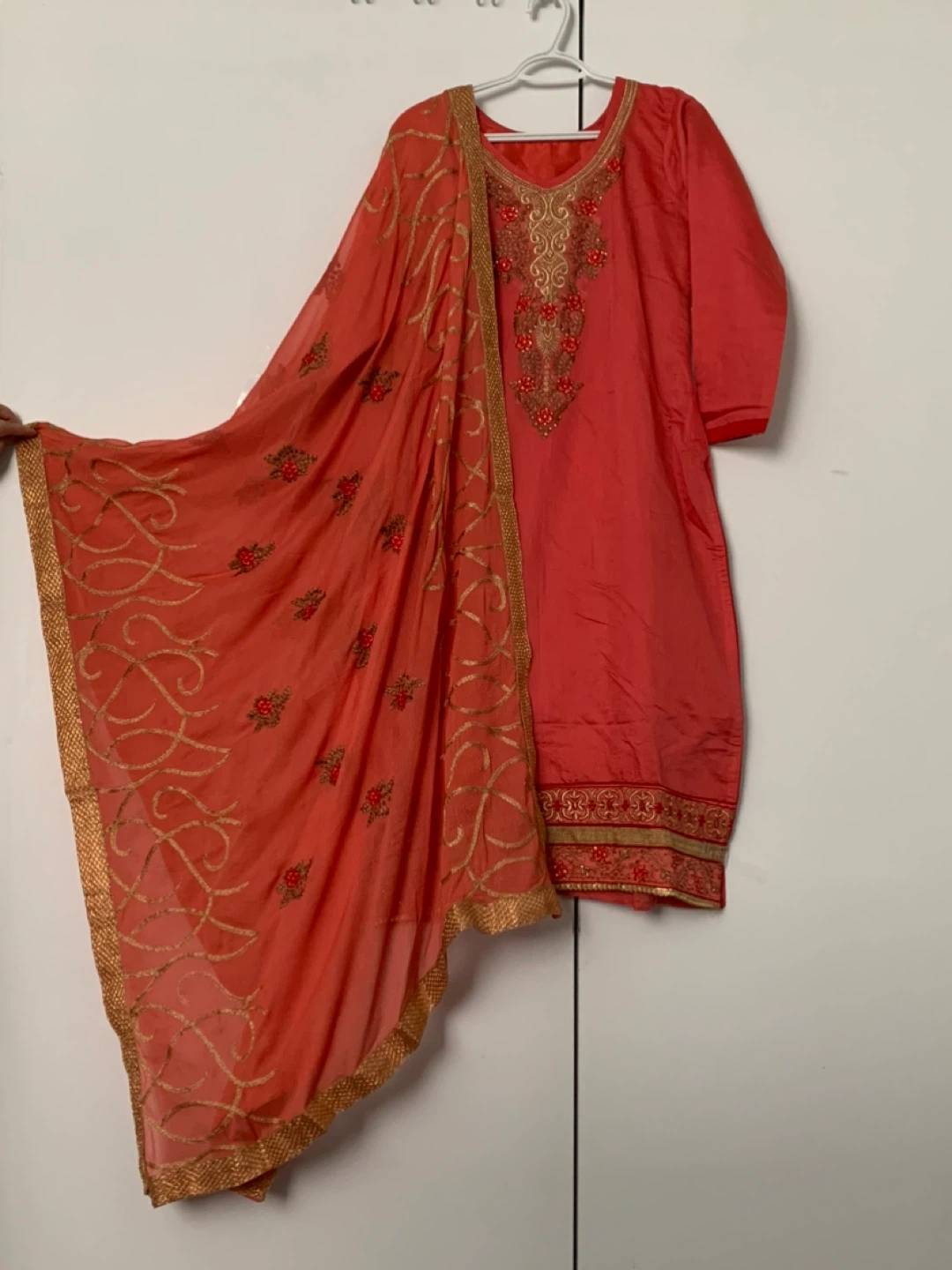 Here's a coral-coloured kurti dress with beautiful embroidery. The material feels like silk. It's in good condition and ready for a new wardrobe! It comes with nice big dupatta and shalwar