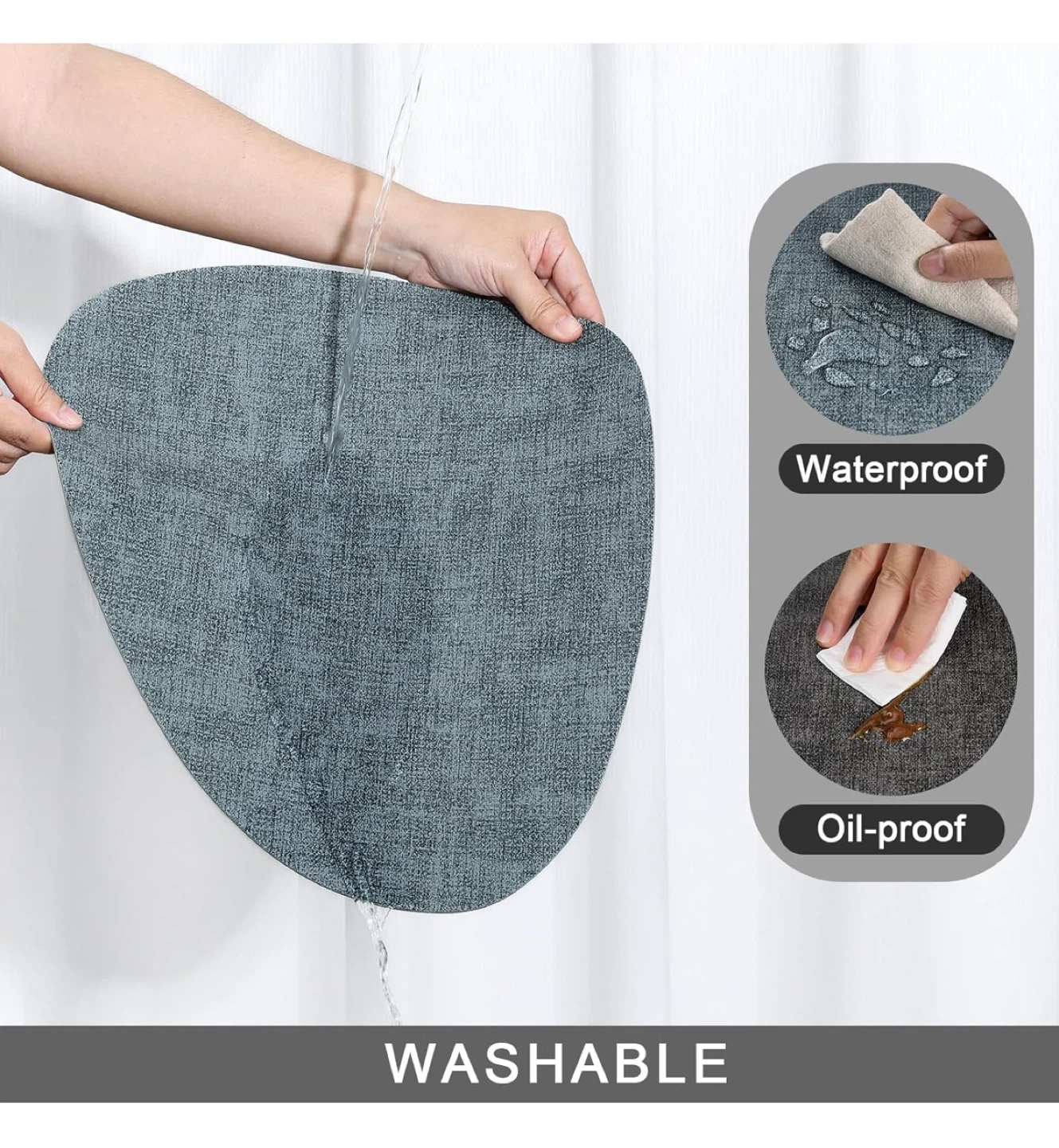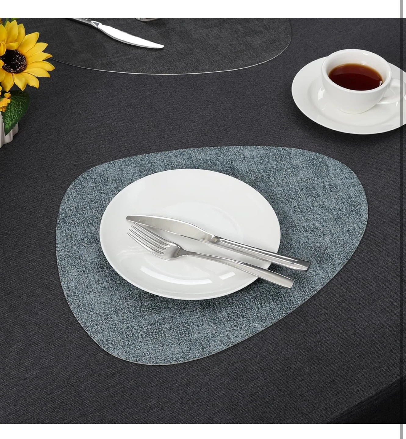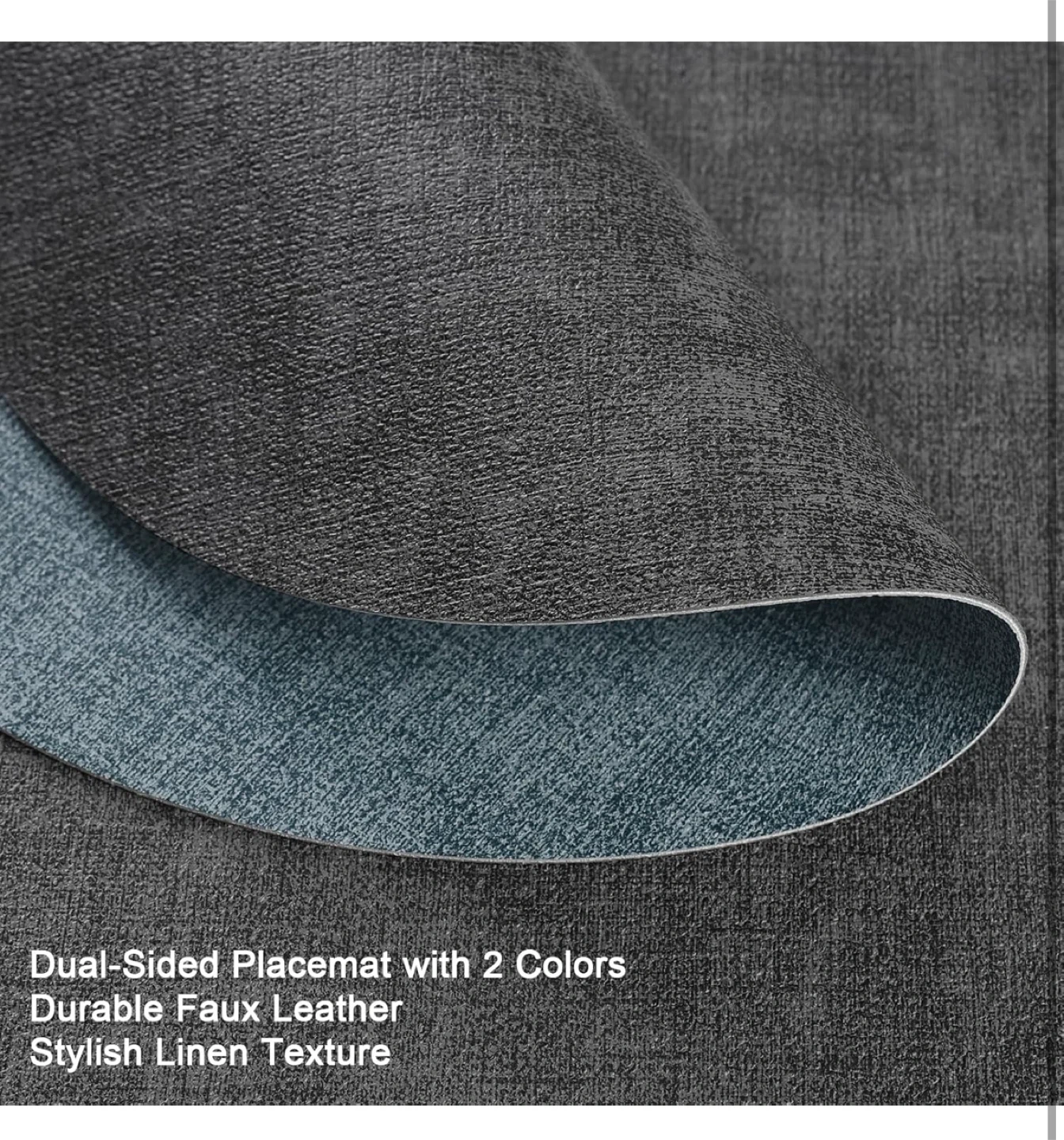 I'm offering a set of six brand new placemats, perfect for adding a touch of elegance to your dining experience while protecting your table. These placemats are washable and reversible, offering both style and practicality. The dual-sided design features a durable faux leather with a stylish linen texture in two different colours, allowing you to switch up your table setting effortlessly. Each placemat measures approximately 33 cm x 40 cm (13 inches x 15.8 inches). If you're seeing this ad, the placemats are still available. Get them before they're gone!