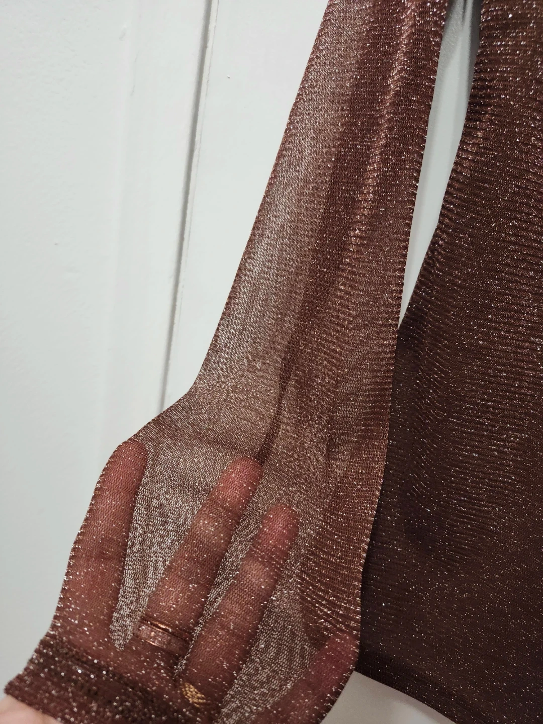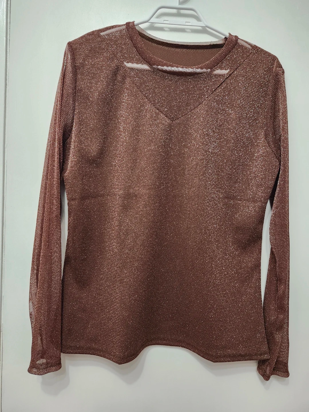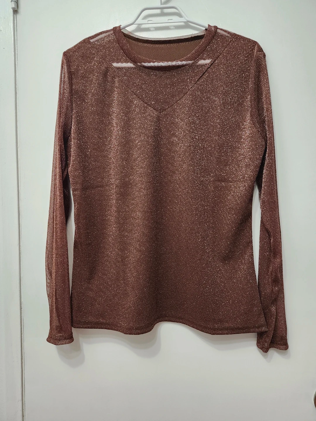 Here's a lovely brown long-sleeve top with a subtle sparkle! It's in great condition and ready for a new wardrobe. The fabric has a nice texture and a bit of a sheer look to it.