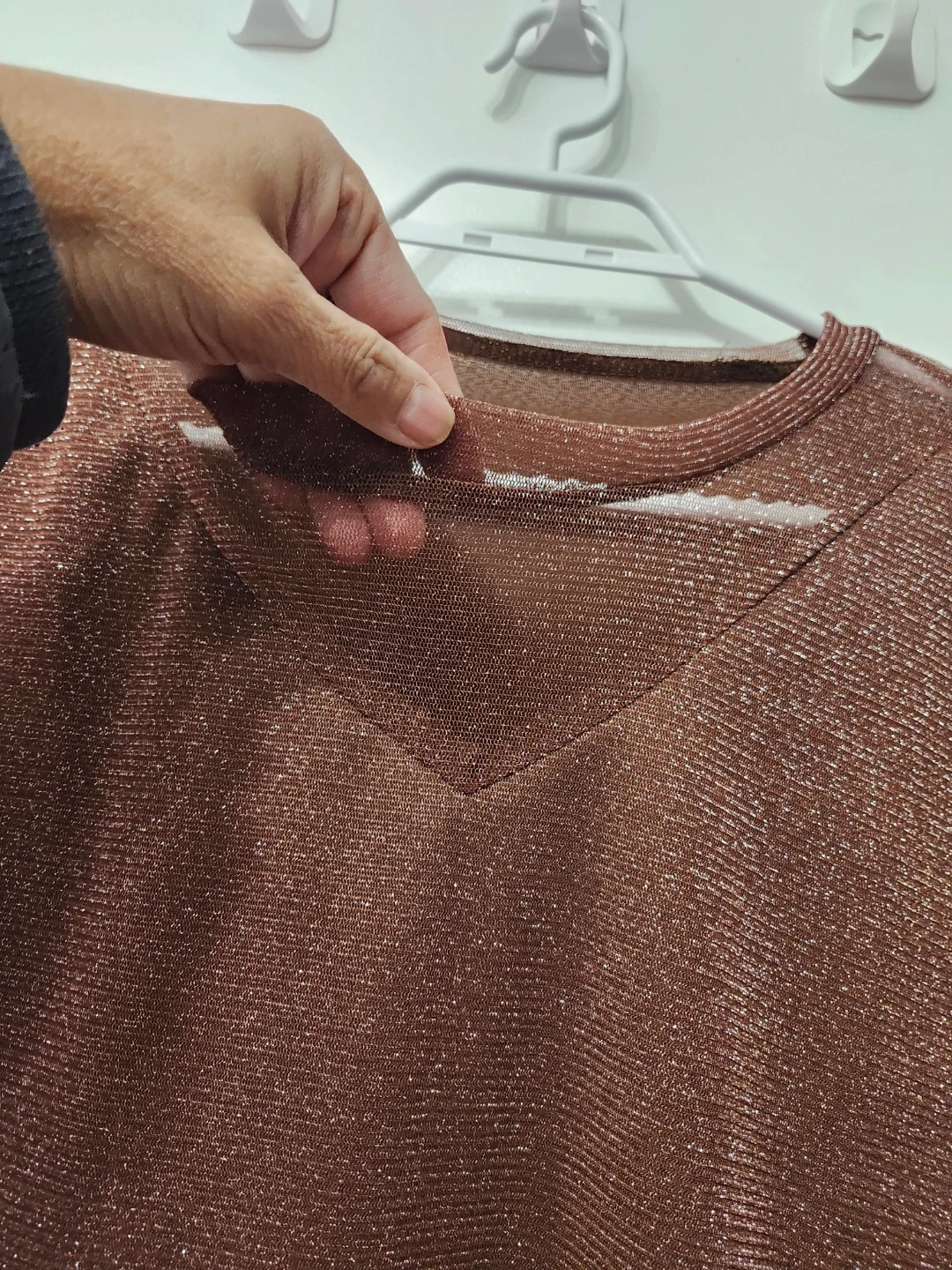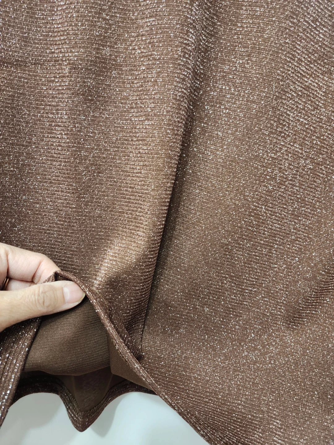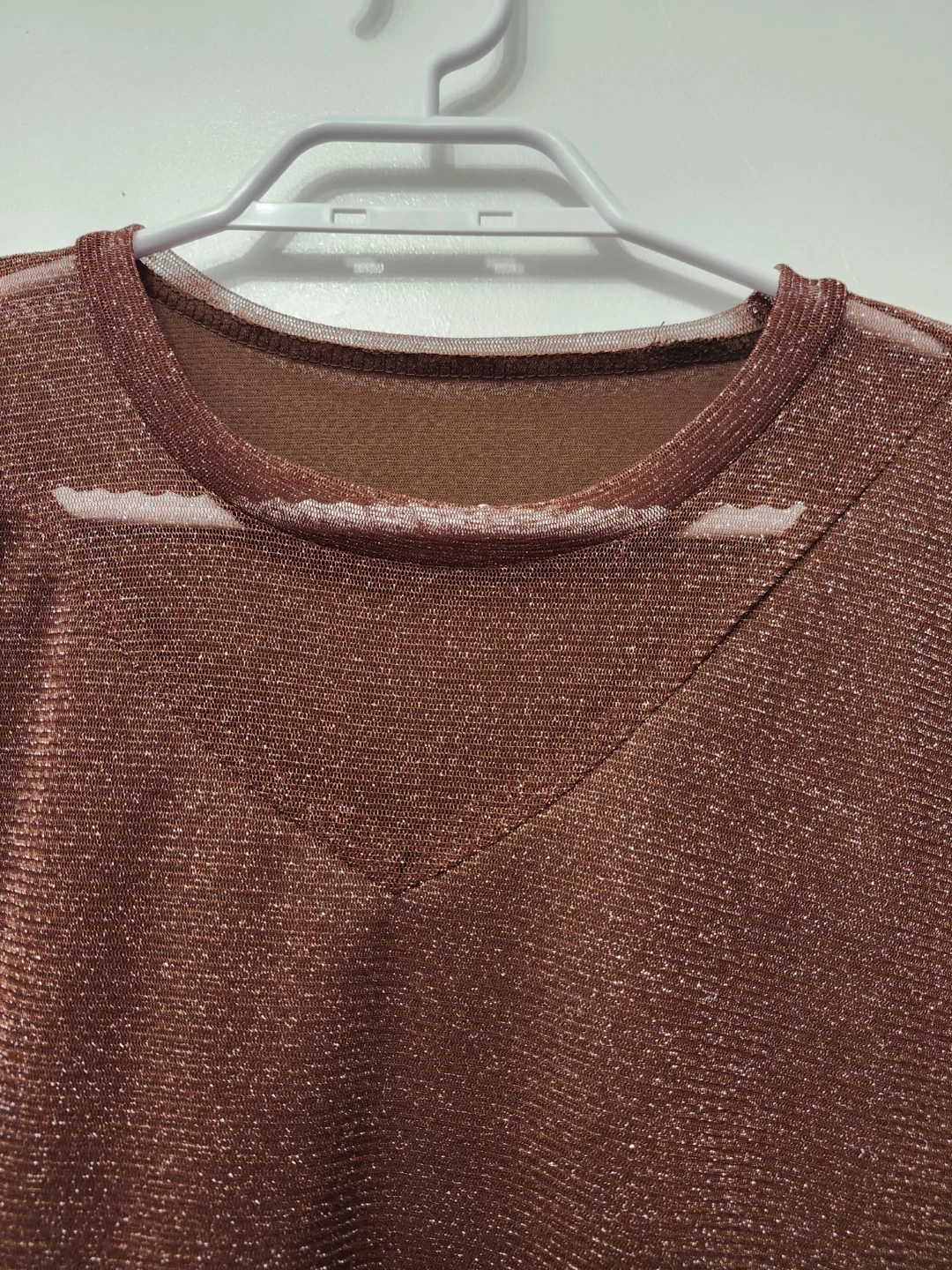 Here's a lovely brown long-sleeve top with a subtle sparkle! It's in great condition and ready for a new wardrobe. The fabric has a nice texture and a bit of a sheer look to it.